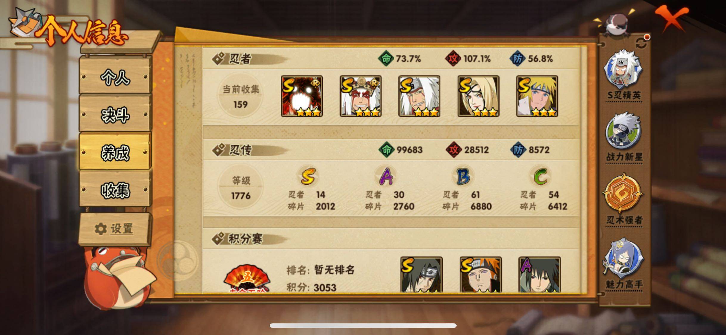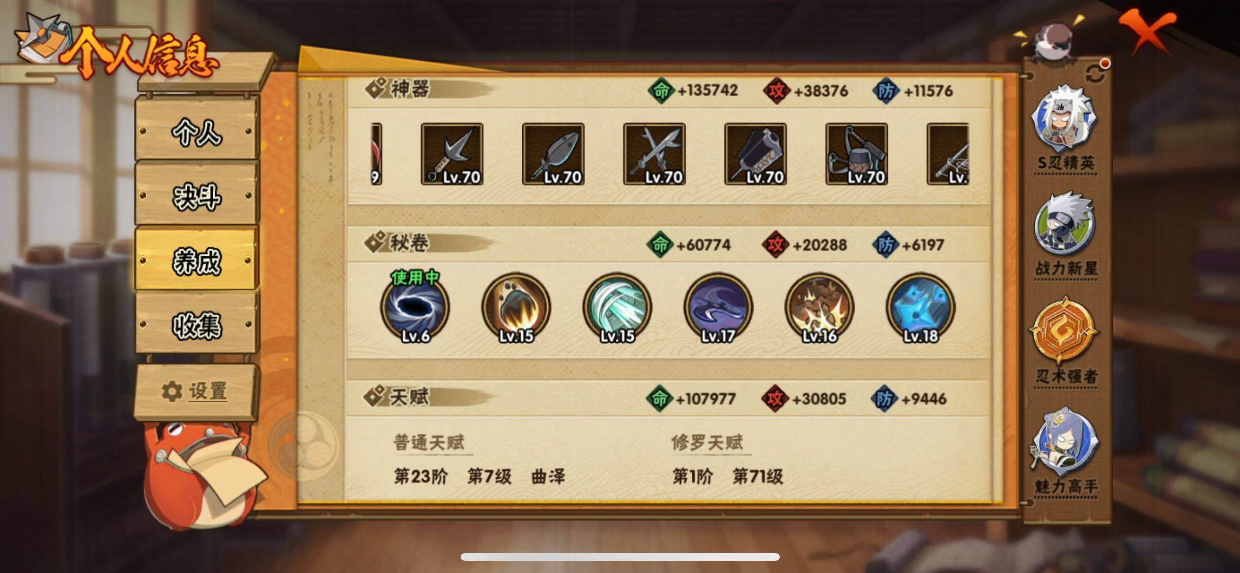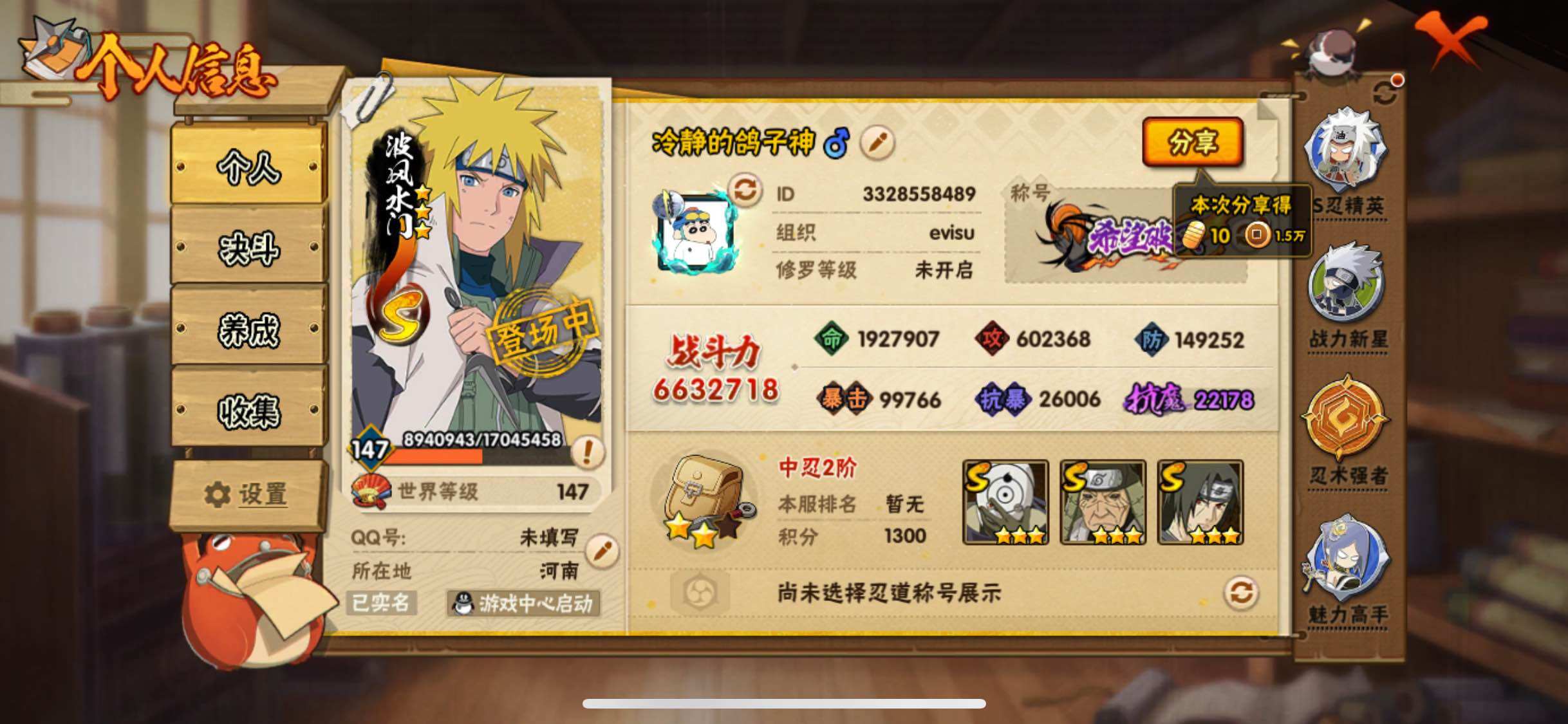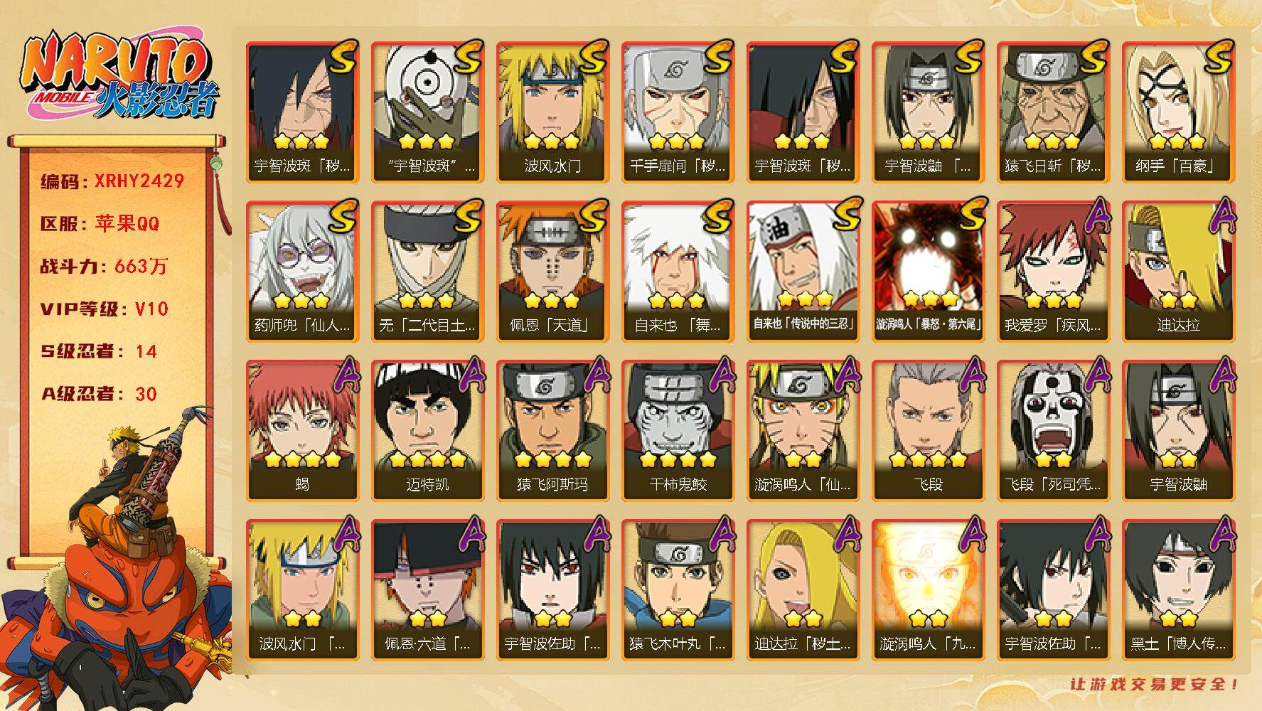 [13721745]xr44495-可二次-苹果qq-14S级忍者数-30A级忍者数 【S级忍者】:猿飞日斩「秽土转生」(3星),千手扉间「秽土转生」(3星),宇智波斑「秽土转生」(3星),宇智波斑「秽土转生·解」(3星),宇智波鼬「须佐能乎」(3星),无「二代目土影」(3星),自来也「舞之豪杰」(3星),自来也「传说中的三忍」(3星),纲手「百豪」...