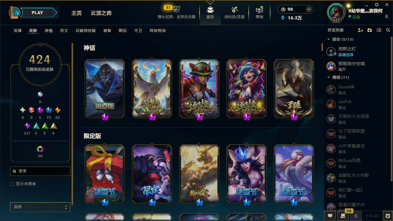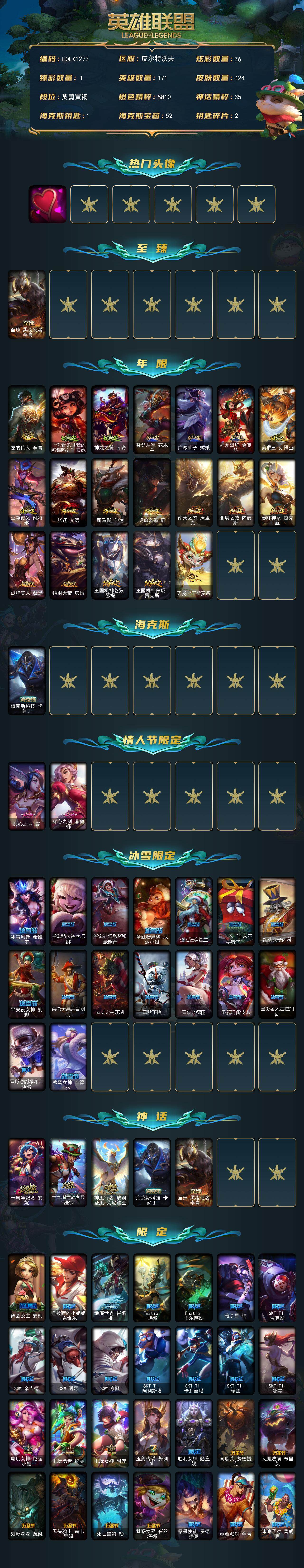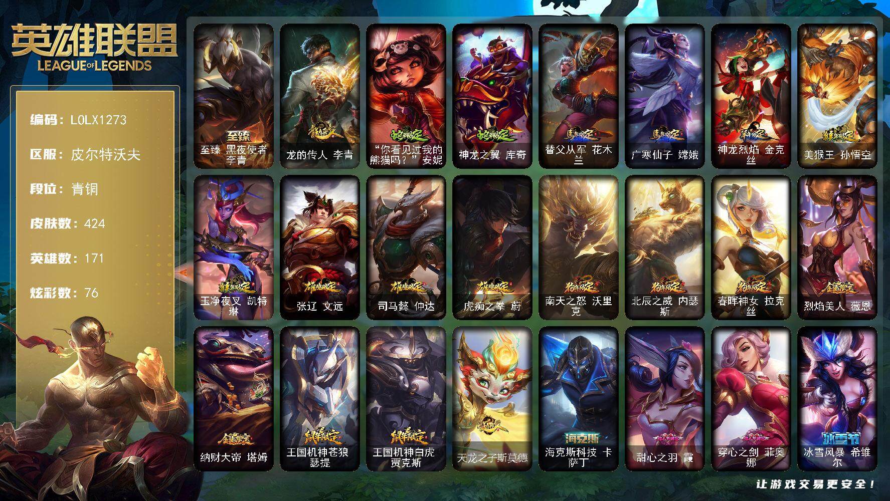 【10737】【LOLX1273】171英雄/424皮肤/5神话/73限定/1臻彩/76炫彩/32传说/117史诗/青铜账号等级:637/爱意绵绵/至臻黑夜使者李青/红莲之刃锐雯/龙的传人李青/“你看见过我的熊猫吗?”安妮/神龙之翼库奇/替父从军花木兰/广寒仙子嫦娥/神龙烈焰金克丝/美猴王孙悟空/玉净夜叉凯特琳/张辽文远/司马懿仲达/虎痴之拳蔚/南天之怒沃里克/北辰之威内瑟斯/春晖神女拉克丝/烈