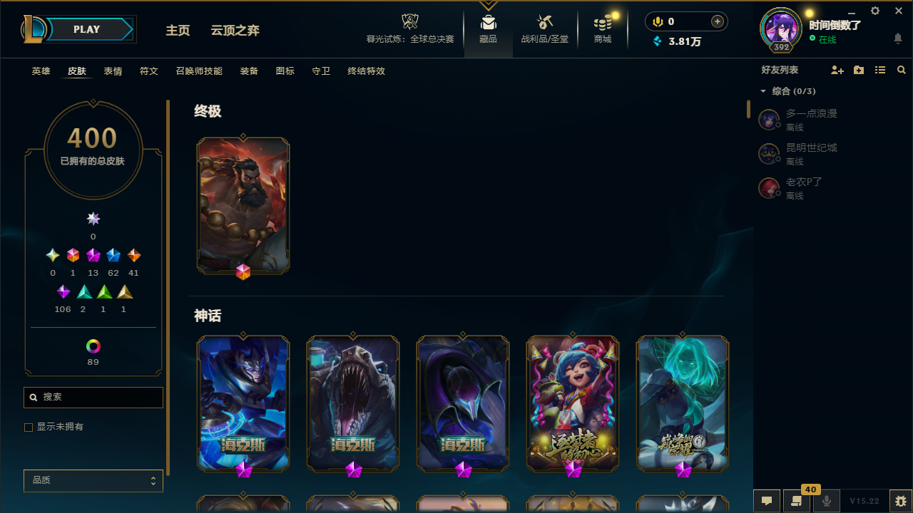 【11316】[13726982]t30347【班德尔城】400皮肤 106炫彩 3臻彩 13神话/62限定/41传说/167英雄 账号等级:392【重要头像】我麦是开的么 至臻KDA卡莎 至臻奥术师佐伊 【重要皮肤】星之守护者辛德拉至臻 青花瓷拉克丝至臻 奥术师佐伊至臻 灵能特工伊泽瑞尔至臻 源计划逆流塞拉斯至臻 KDA二代卡莎至臻 绒毛菲兹至臻 玉剑传说武剑仙至臻 海克