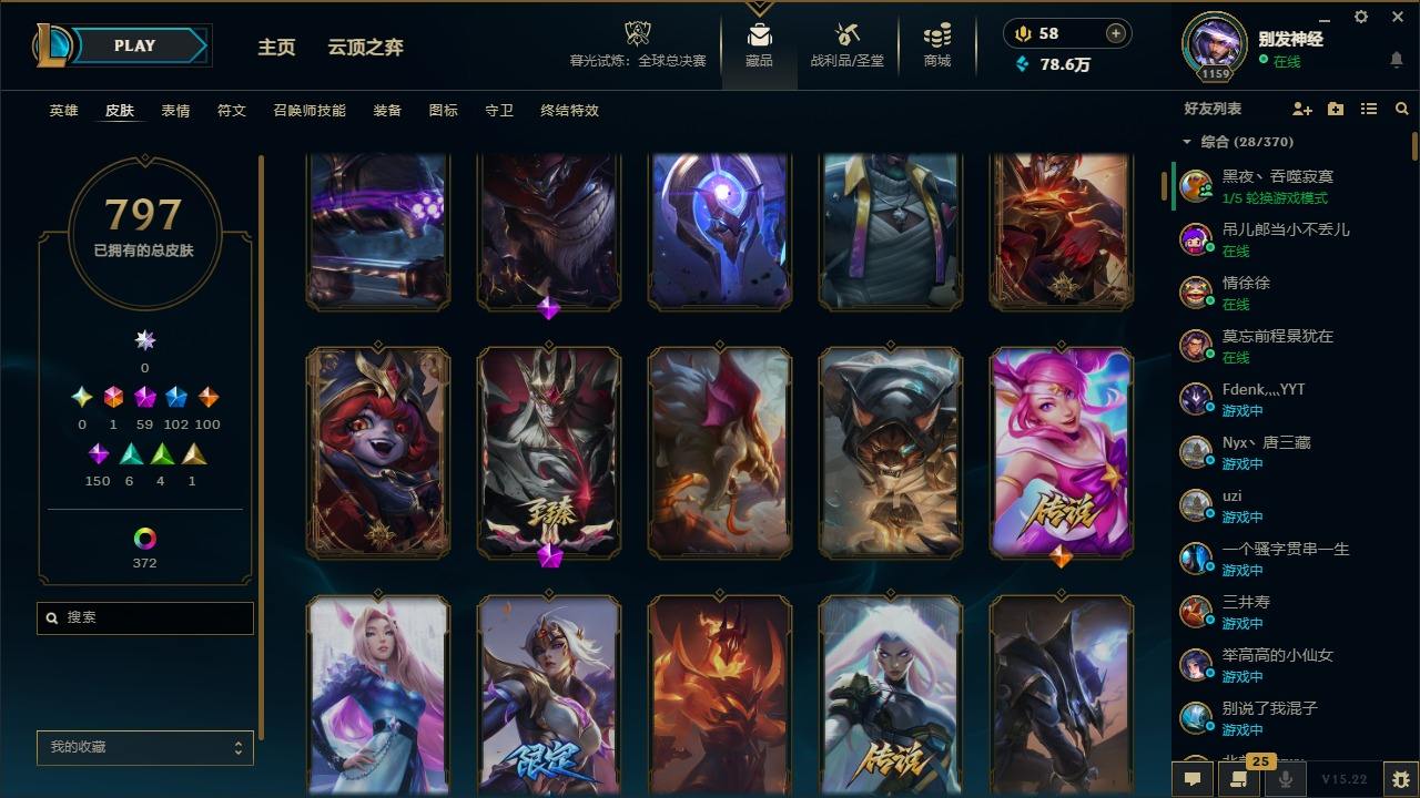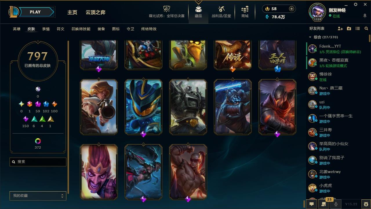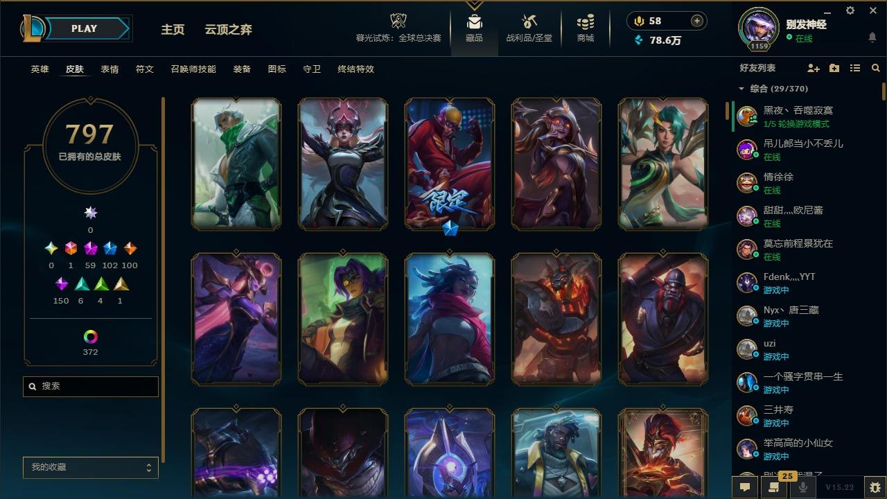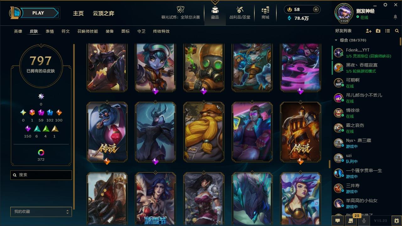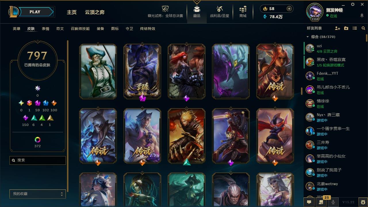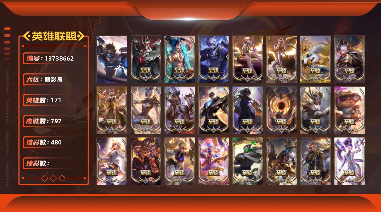 【14843】[13738662]1终极 59神话 102限定 100传说 150史诗 797皮肤 480炫彩 171英雄 可二次 可修改实名 【至臻】:至臻 未来战士 锤石(2022),至臻 绒毛 菲兹(2022),至臻 DRX 亚托克斯,至臻 北极星钢影 卡蜜尔,至臻 心之钢 永恩,至臻 斗魂觉醒 萨科,至臻 墨之影武者 亚索,至臻 玉剑传说 武剑仙(2022),至臻 花仙使者 卡特琳娜,至