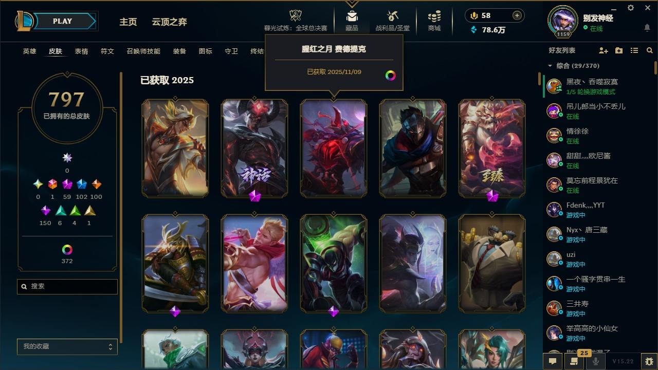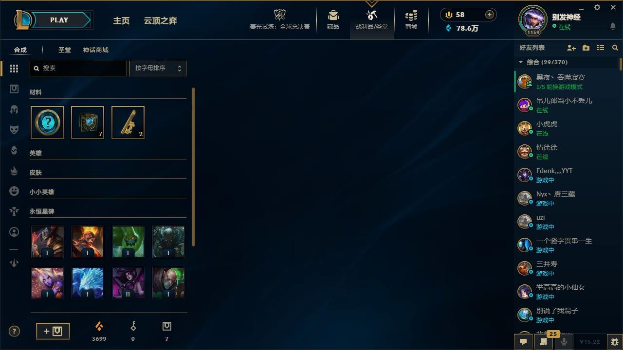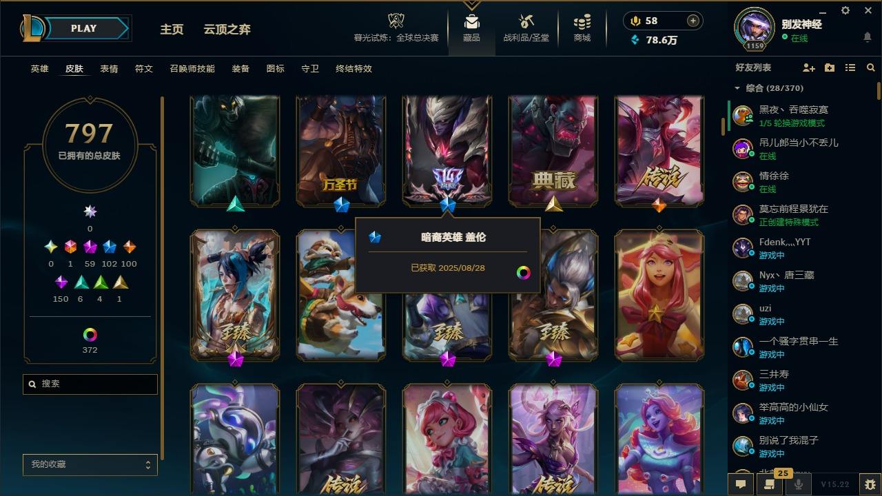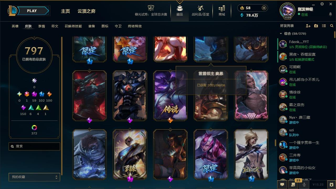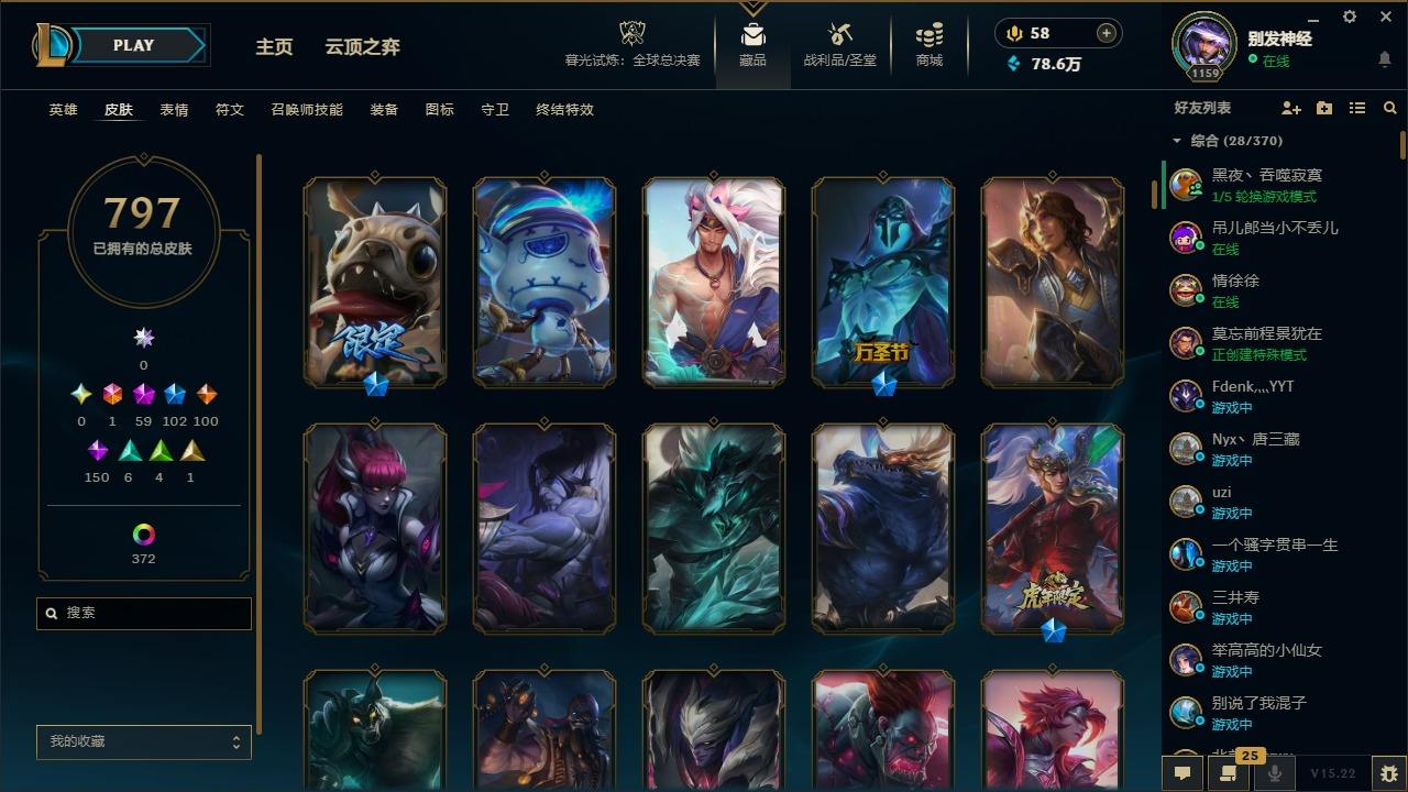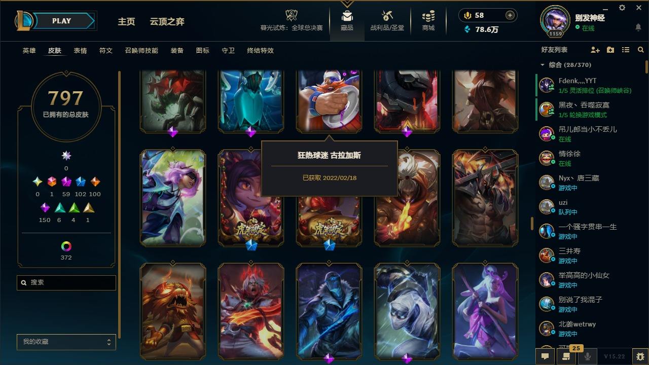【14843】[13738662]1终极 59神话 102限定 100传说 150史诗 797皮肤 480炫彩 171英雄 可二次 可修改实名 【至臻】:至臻 未来战士 锤石(2022),至臻 绒毛 菲兹(2022),至臻 DRX 亚托克斯,至臻 北极星钢影 卡蜜尔,至臻 心之钢 永恩,至臻 斗魂觉醒 萨科,至臻 墨之影武者 亚索,至臻 玉剑传说 武剑仙(2022),至臻 花仙使者 卡特琳娜,至