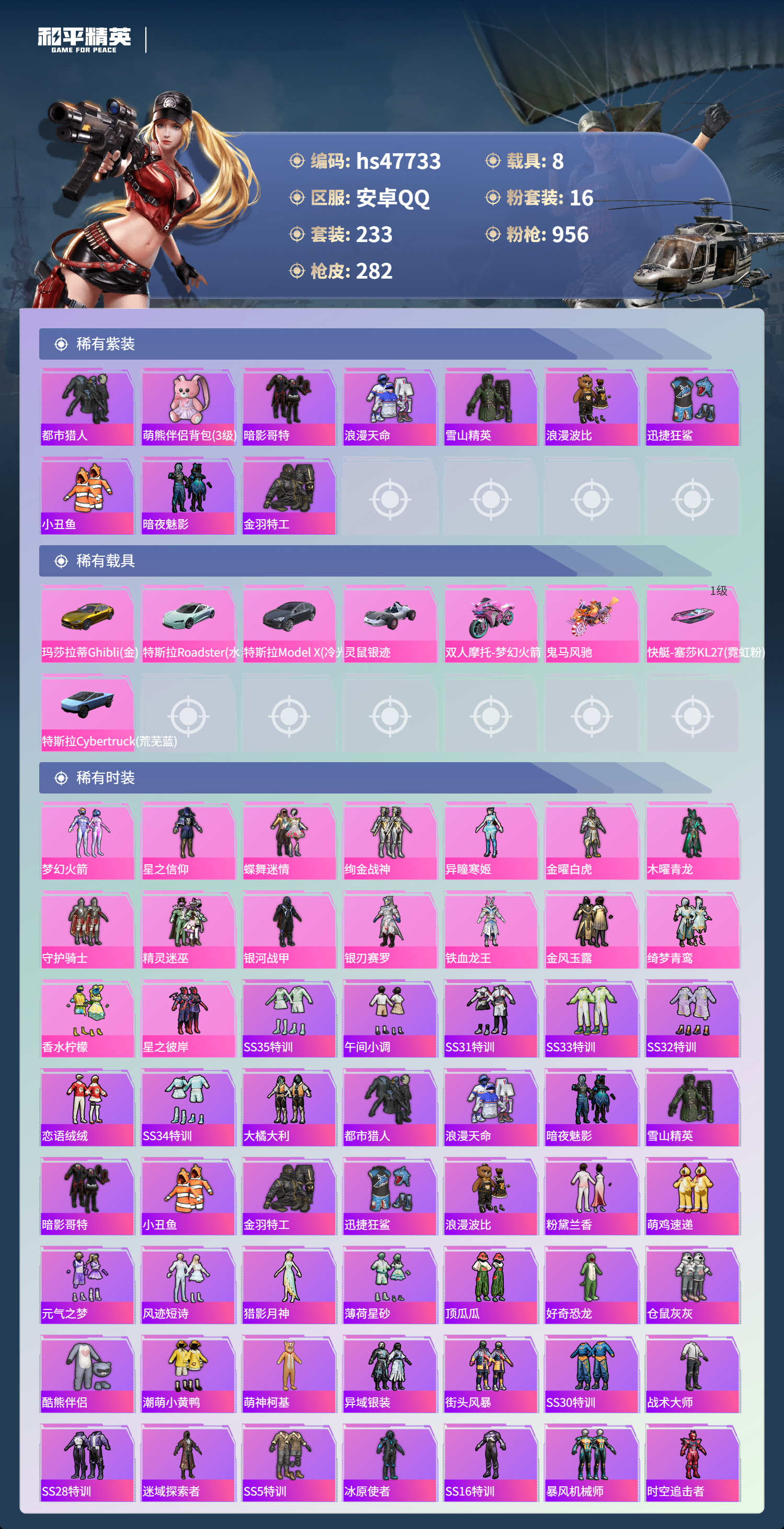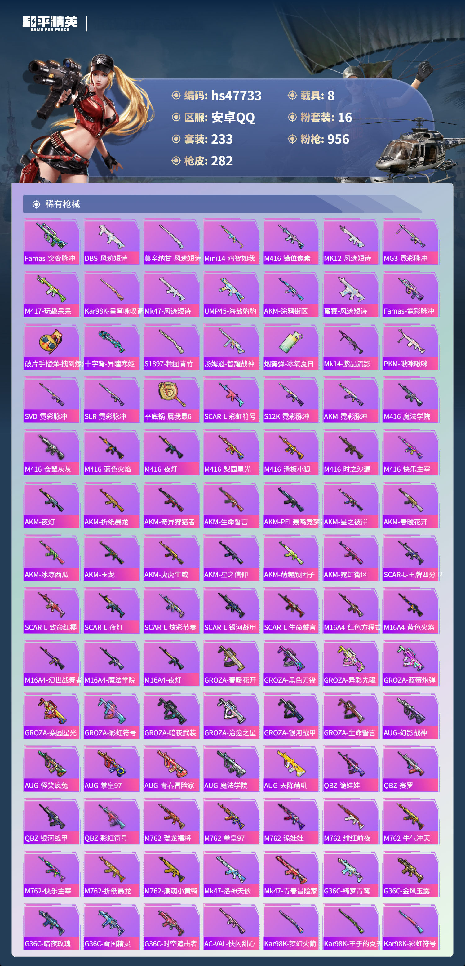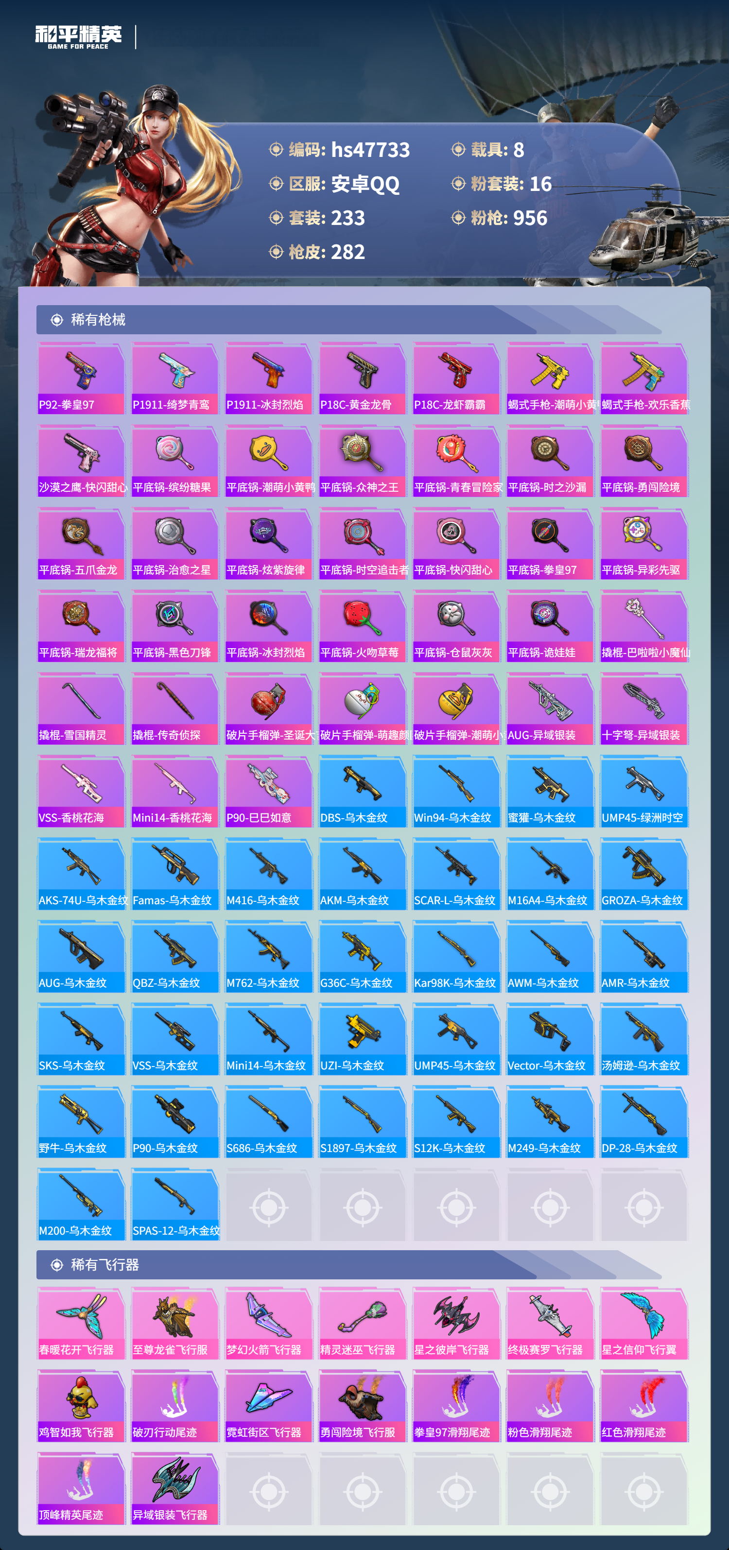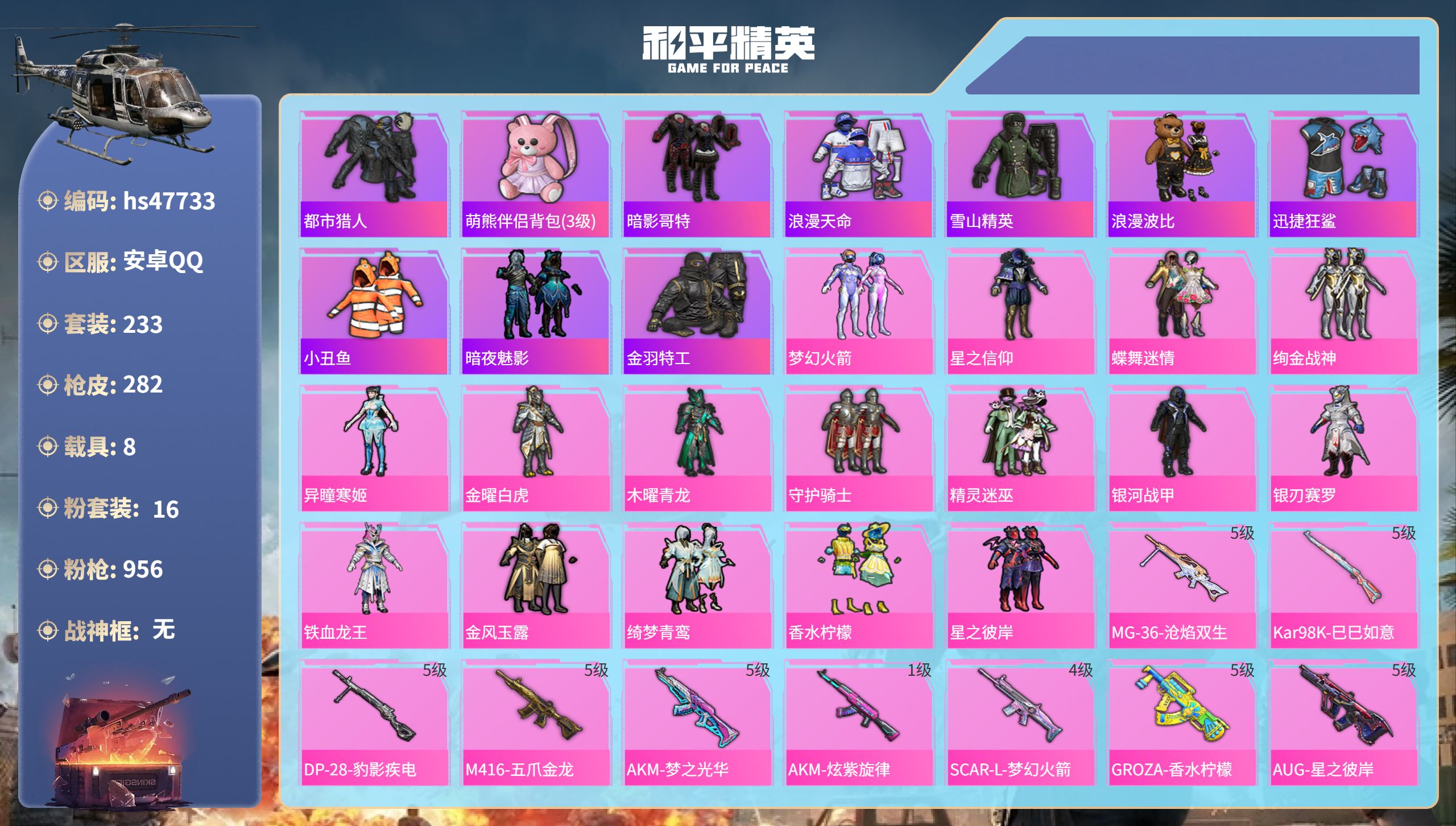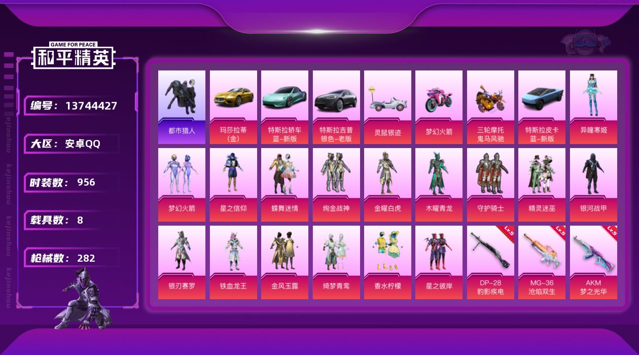 【16757】【不可二次】【安卓QQ】灵绣 滑板小狐 双人摩托梦幻火箭 UZI-绮梦青鸾 金曜白虎 都市猎人 木耀青龙 银河战甲 豚鼠丹丹 忍者信条 梦起落英 银刃赛罗 M416-仓鼠灰灰 浪漫波比 深海小丑鱼 蝶舞迷情 特斯拉R水滴蓝 AUG-星之彼岸 醒狮腾龙 AKM-奇异狩猎者 星之信仰 SCAR-L-梦幻火箭 迅捷狂鲨 M762-瑞龙福将 潮萌小黄鸭 黑色刀锋 金羽特工 AKM-炫紫旋律