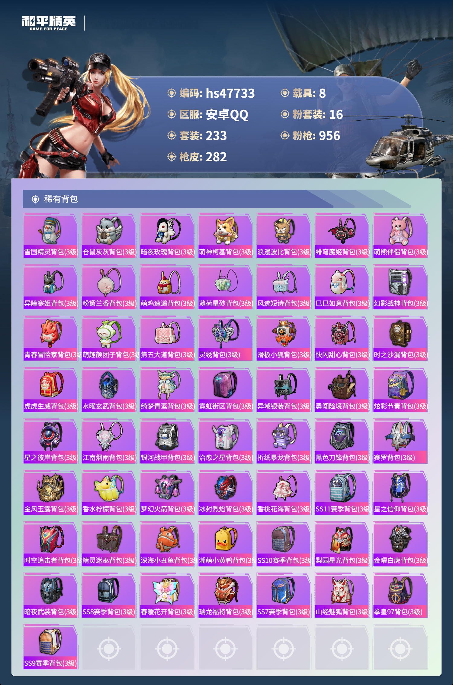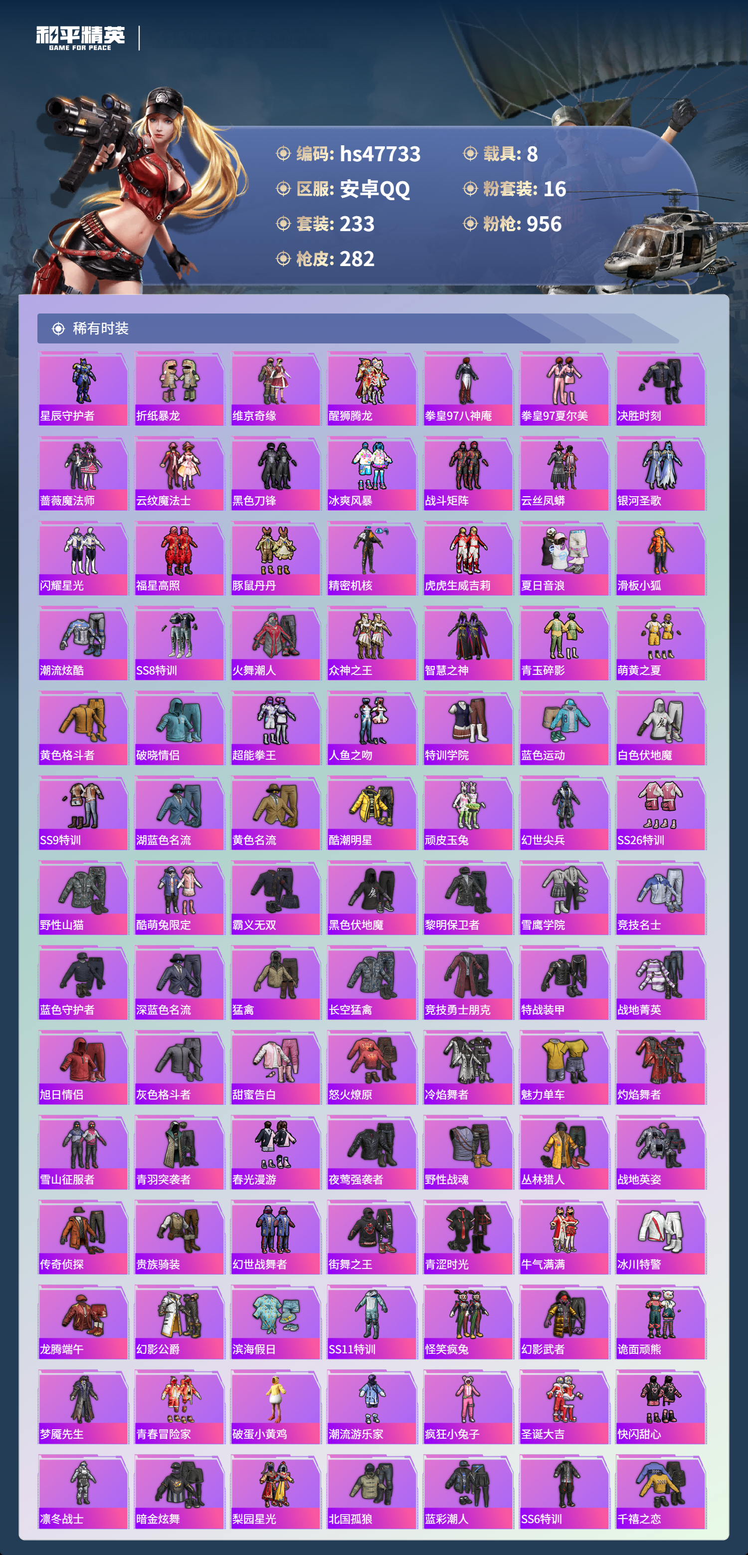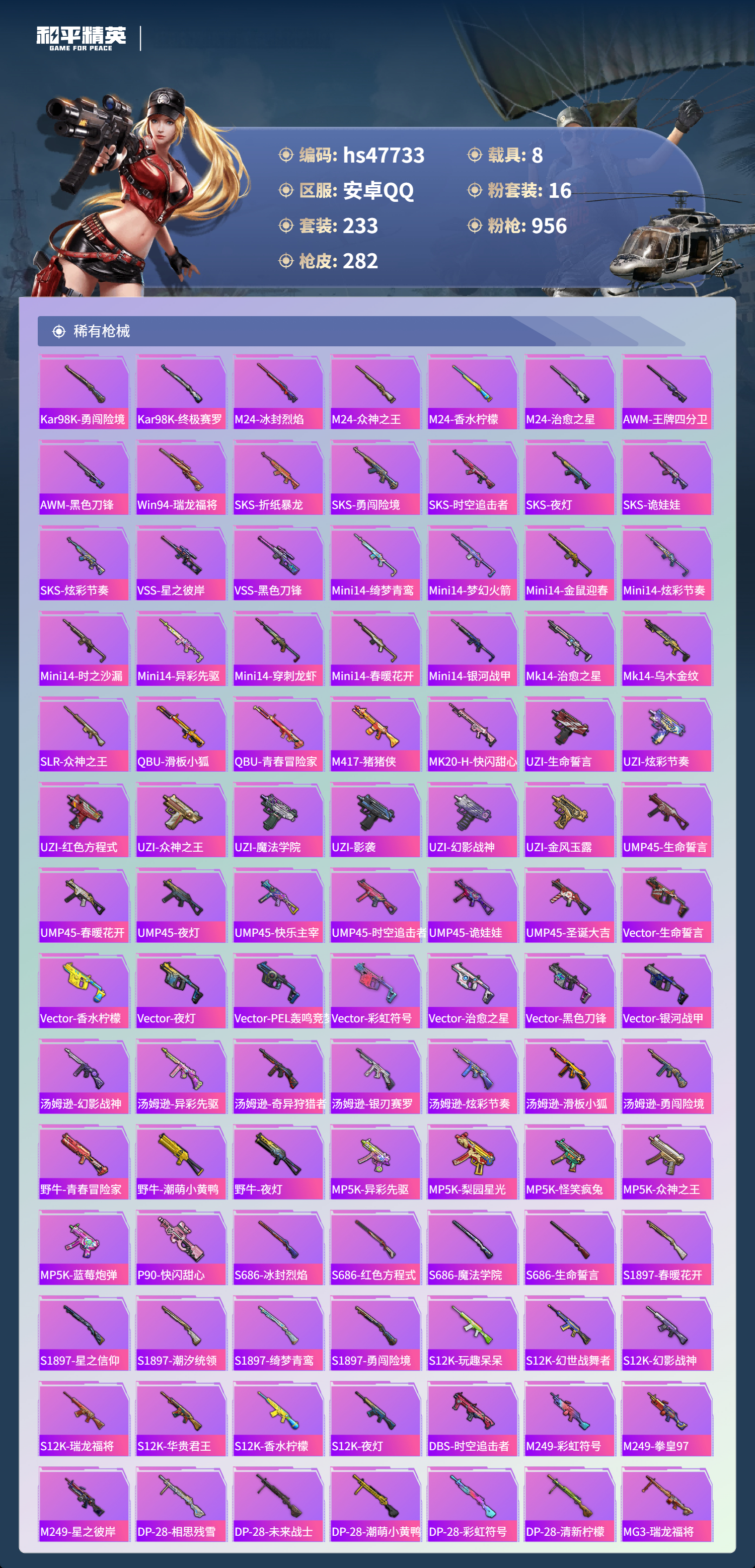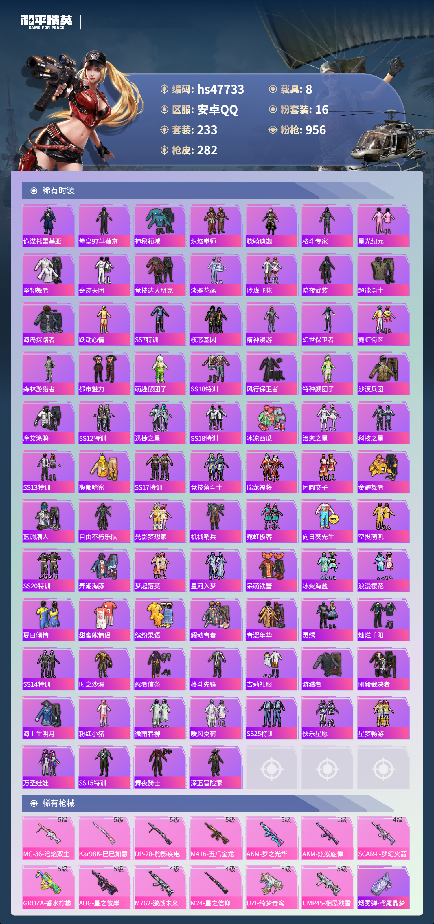 【16757】【不可二次】【安卓QQ】灵绣 滑板小狐 双人摩托梦幻火箭 UZI-绮梦青鸾 金曜白虎 都市猎人 木耀青龙 银河战甲 豚鼠丹丹 忍者信条 梦起落英 银刃赛罗 M416-仓鼠灰灰 浪漫波比 深海小丑鱼 蝶舞迷情 特斯拉R水滴蓝 AUG-星之彼岸 醒狮腾龙 AKM-奇异狩猎者 星之信仰 SCAR-L-梦幻火箭 迅捷狂鲨 M762-瑞龙福将 潮萌小黄鸭 黑色刀锋 金羽特工 AKM-炫紫旋律