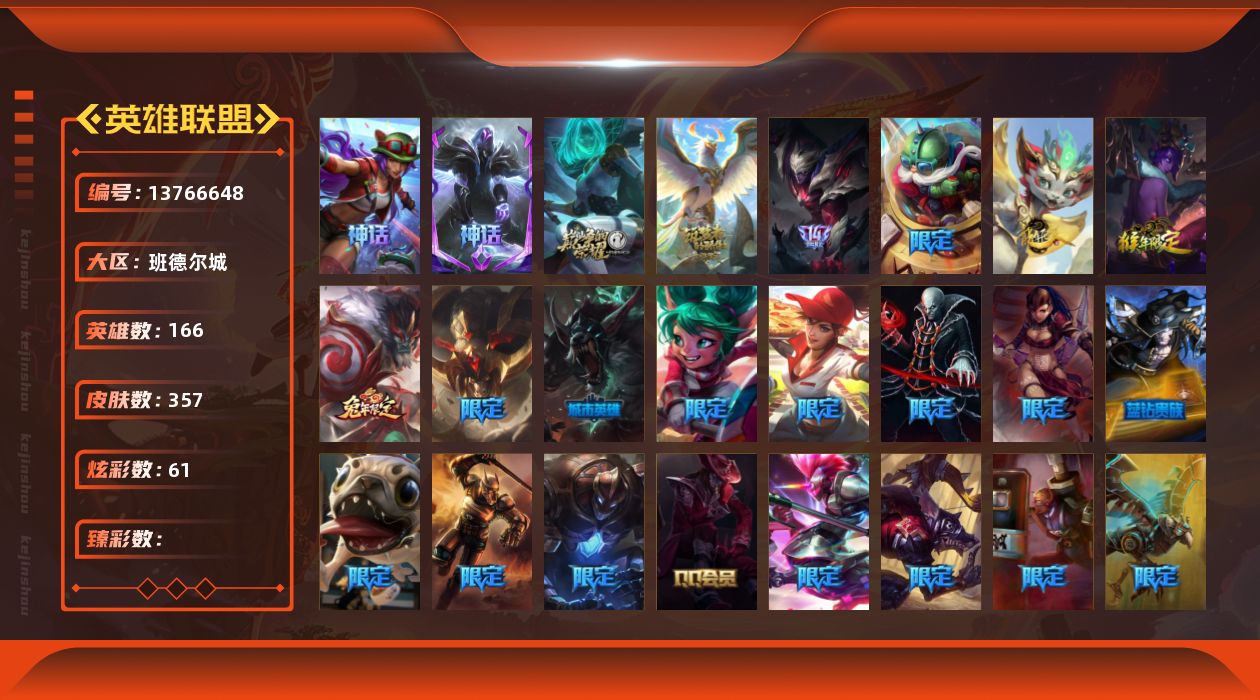 【18015】[]4神话 65限定 32传说 103史诗 357皮肤 61炫彩 166英雄 可二次 可修改实名 【限定】:奥斯曼大帝 泰达米尔,哥特萝莉 安妮,生化领主 泰达米尔【赛季限定皮】:胜利女神 希维尔【冠军限定系列】:S13 T1 李青,S2 暗杀星 发条,S2 暗杀星 努努,S2 暗杀星 慎,S2 暗杀星 伊泽瑞尔,S3 SKT T1 劫,S3 SKT T1 李青,S4 SSW 雷恩
