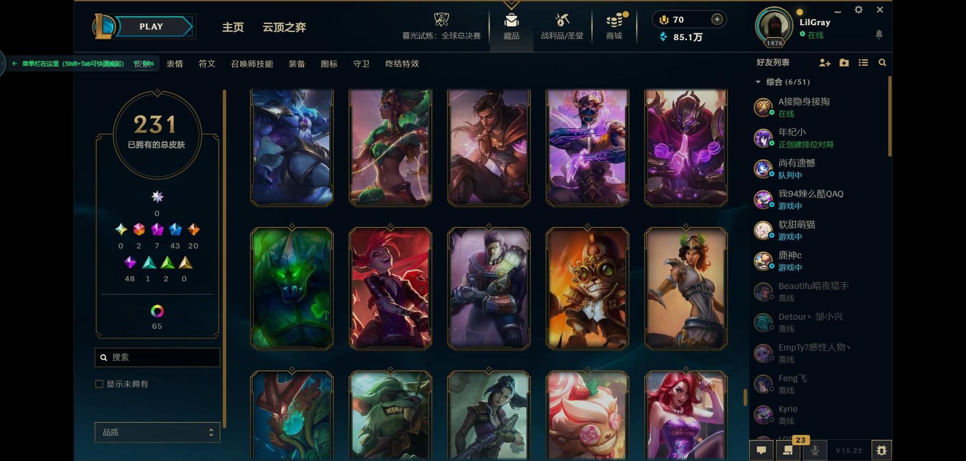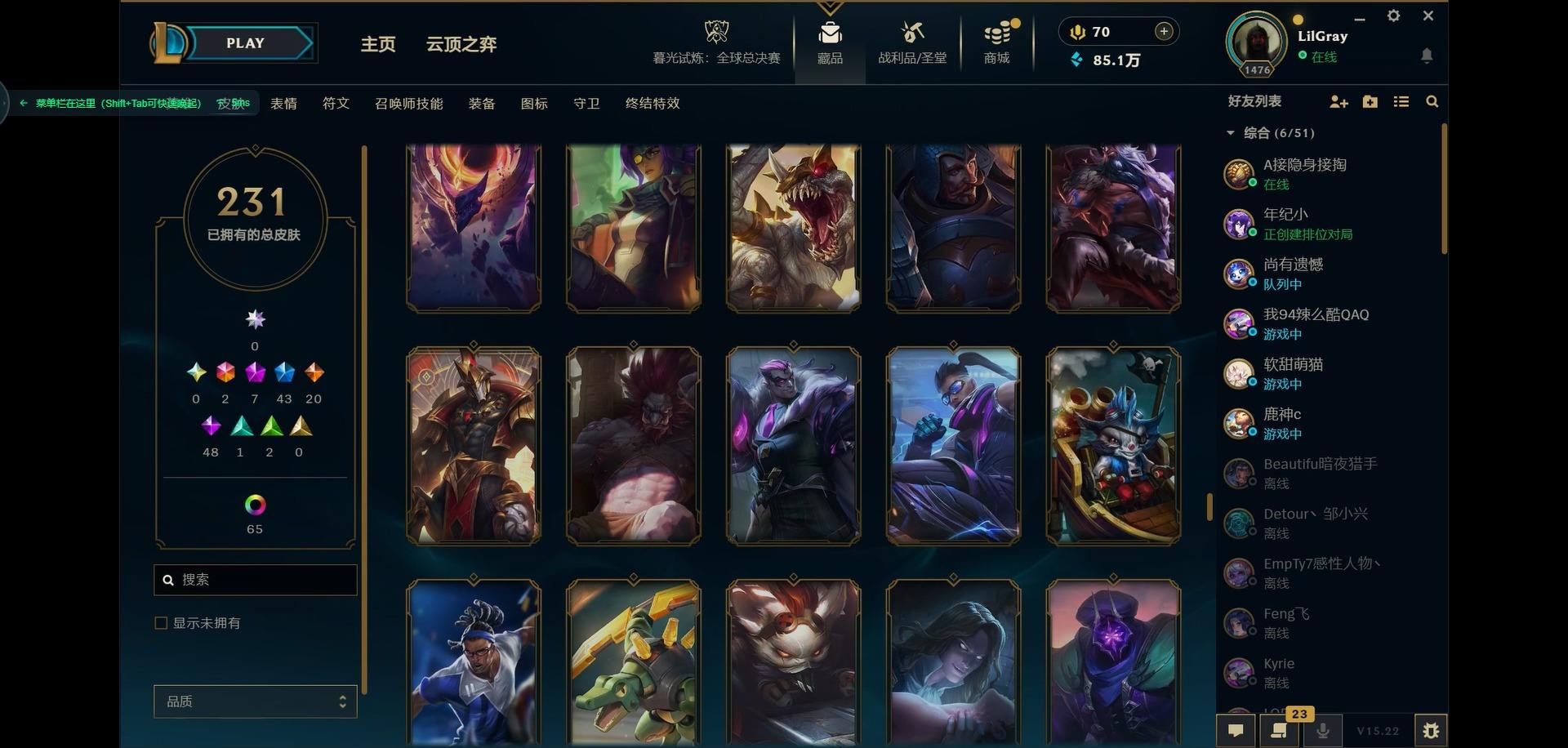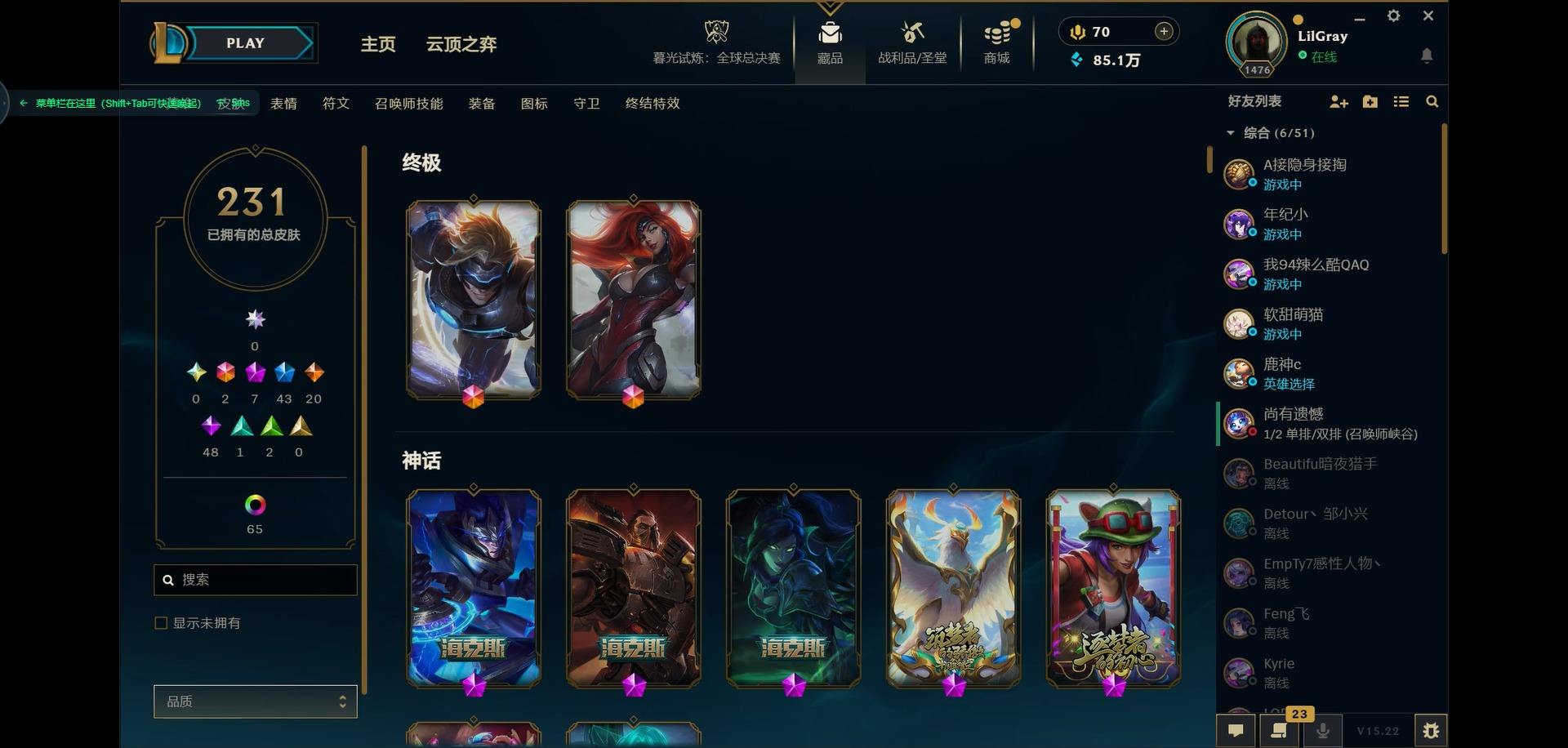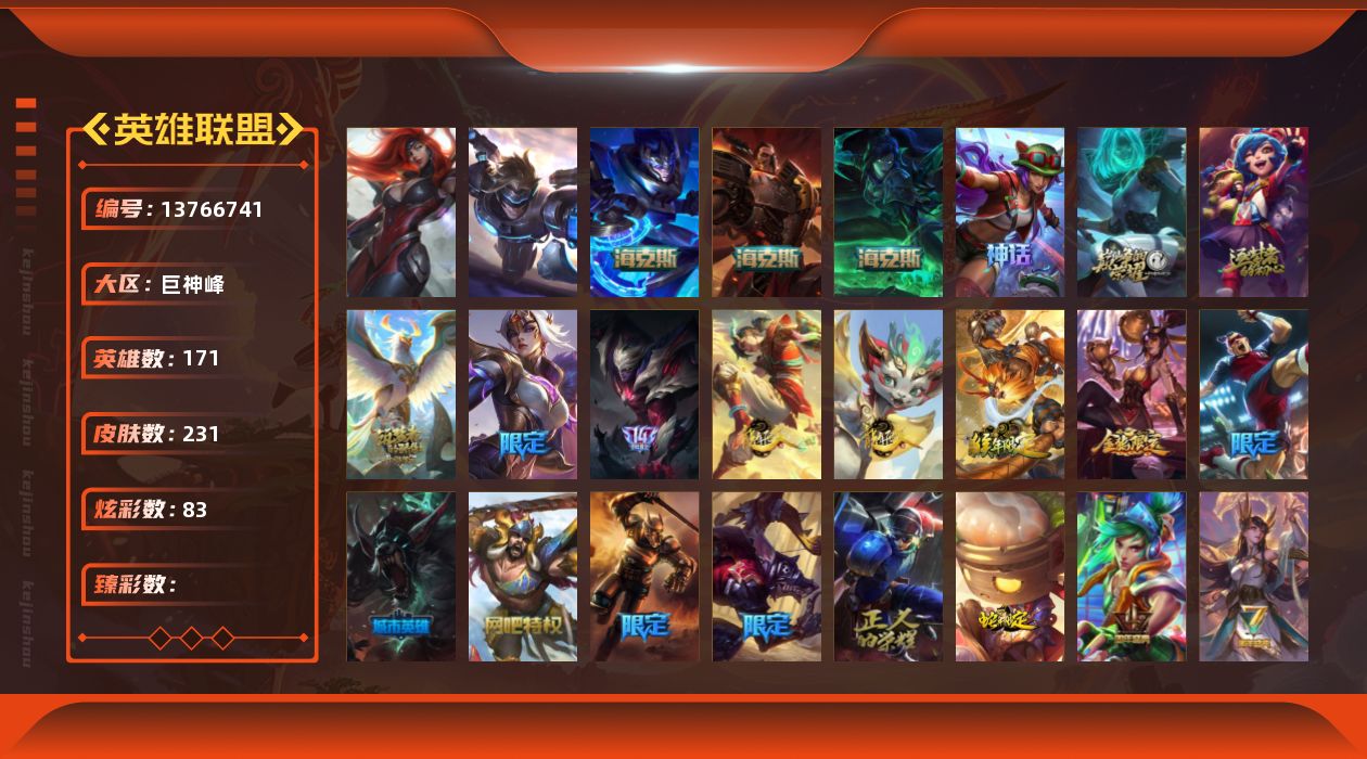 【18144】[13766741]2终极 7神话 43限定 20传说 48史诗 231皮肤 83炫彩 171英雄 可二次 可修改实名 【海克斯】:海克斯 嘉文四世,恐惧新星 德莱厄斯,摄魂 薇恩 【情人节限定】:水晶玫瑰 斯维因 【赛季限定皮】:胜利女神-菲奥娜,胜利凤凰 艾尼维亚,胜利之运 崔斯特,胜利剑圣 易,胜利女神 娑娜,胜利巨口 克格莫,胜利之王 泰达米尔,胜利枪神 格雷福斯,胜利女
