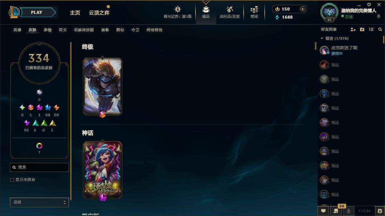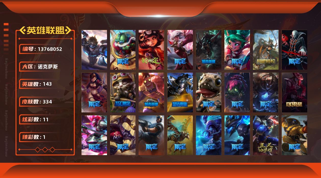 【18472】[13768052]t27984【诺克萨斯】334皮肤 11炫彩 1臻彩 1神话/68限定/26传说/143英雄 账号等级:91 【重要头像】卡特琳娜的匕首 小斗 【重要皮肤】胜利女神希维尔 钢铁军团拉克丝 安妮梦游仙境 勇敢的心德莱厄斯 星之守护者伊泽瑞尔 你看见过我的熊猫吗安妮 胜利之树茂凯 胜利枪神格雷福斯 胜利女神莫甘娜 觅心猎手薇恩 平安夜女神娑娜 圣诞糖果棒厄运小姐 魅