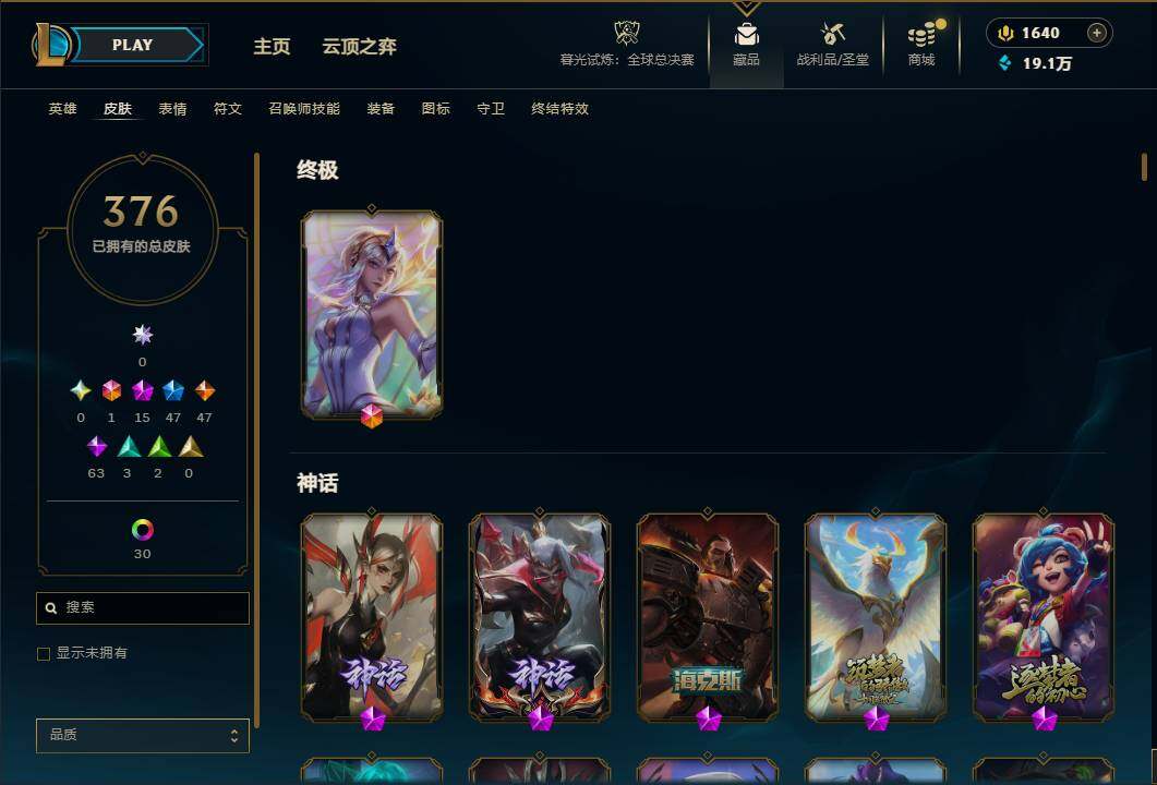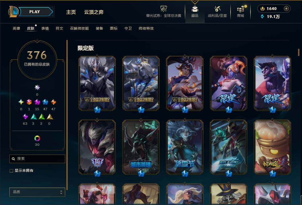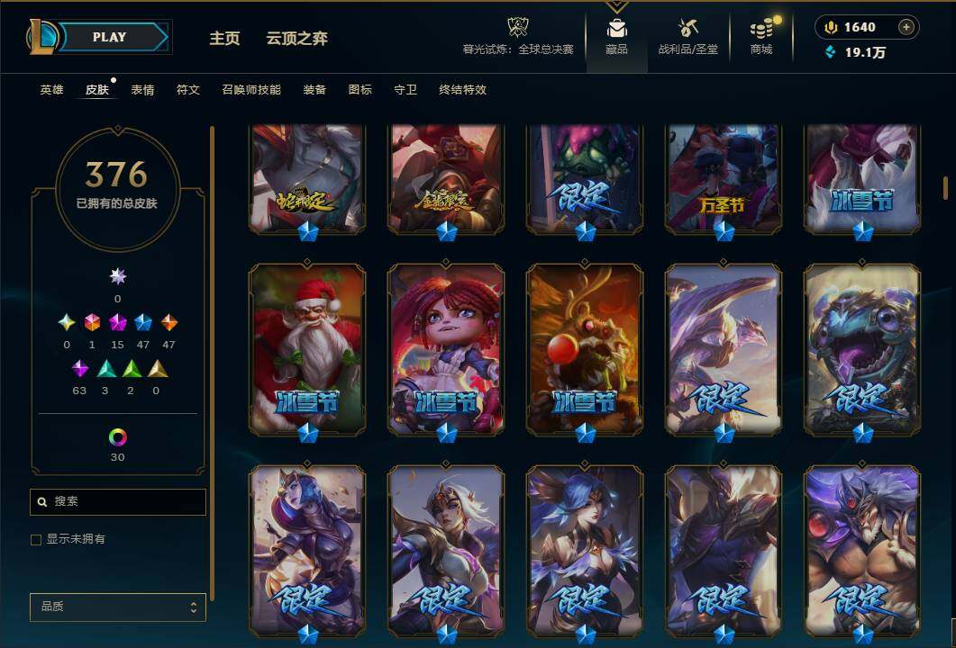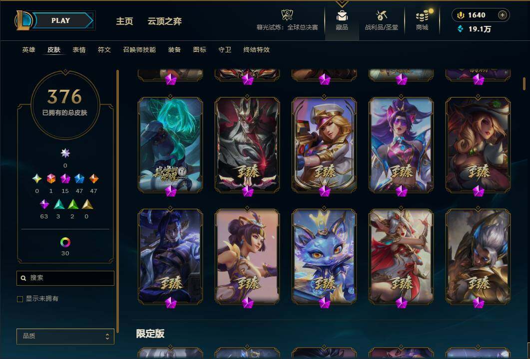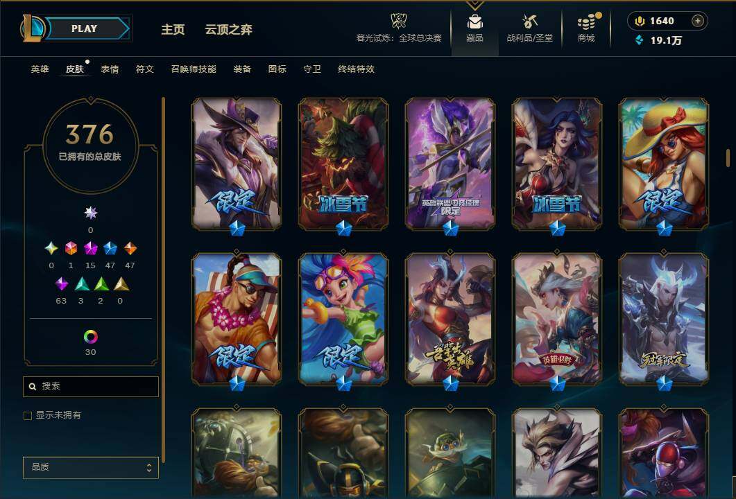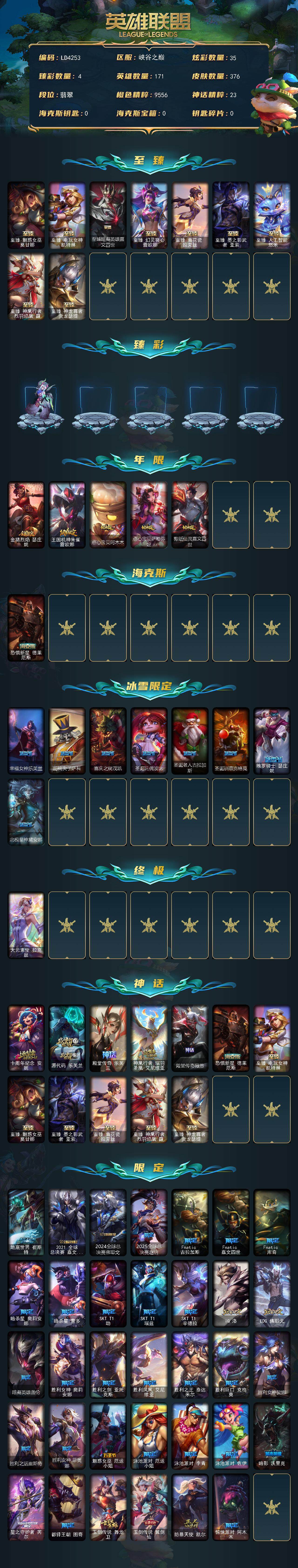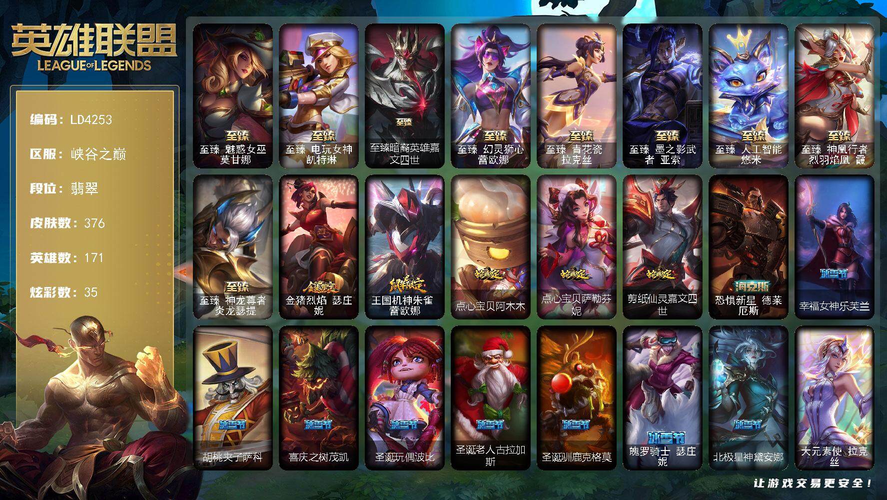 【18475】【LD4253】171英雄/376皮肤/1终极/15神话/47限定/4臻彩/35炫彩/47传说/63史诗/流光翡翠账号等级:133/至臻魅惑女巫莫甘娜/至臻电玩女神凯特琳/至臻暗裔英雄嘉文四世/至臻幻灵狮心蕾欧娜/至臻青花瓷拉克丝/至臻墨之影武者亚索/至臻人工智能悠米/至臻神凰行者烈羽焰凰霞/至臻神龙尊者炎龙瑟提/天龙之子卡莎飞龙乘云/魔女阿卡丽虚荣/净雪之月莫甘娜冬虹/金猪烈焰瑟