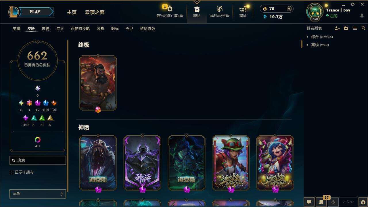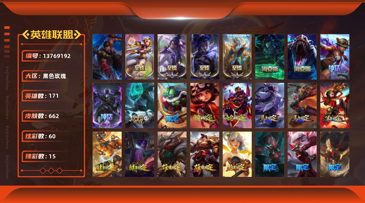 【18652】[13769192]t27866【黑色玫瑰】662皮肤 60炫彩 15臻彩 12神话/106限定/56传说/171英雄 账号等级:738 【重要头像】至爱的鹿 万圣节卡特琳娜 KDA卡莎BAEST 星守金克丝炫彩 幻灵战斗猫金克丝炫彩 战斗学院伊泽瑞尔 此志无双羽饰骑士 【重要皮肤】天龙之子伊泽瑞尔至臻 至高天奎桑提至臻 灵魂莲华易至臻 电玩女神凯特琳至臻 电玩女神凯特琳2022至