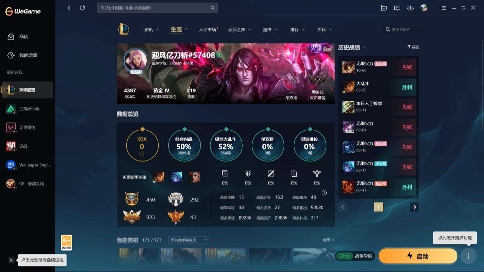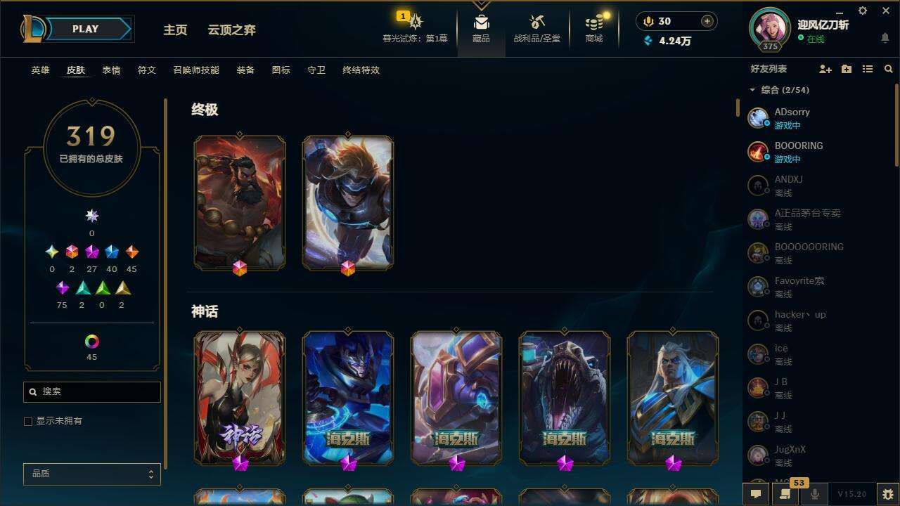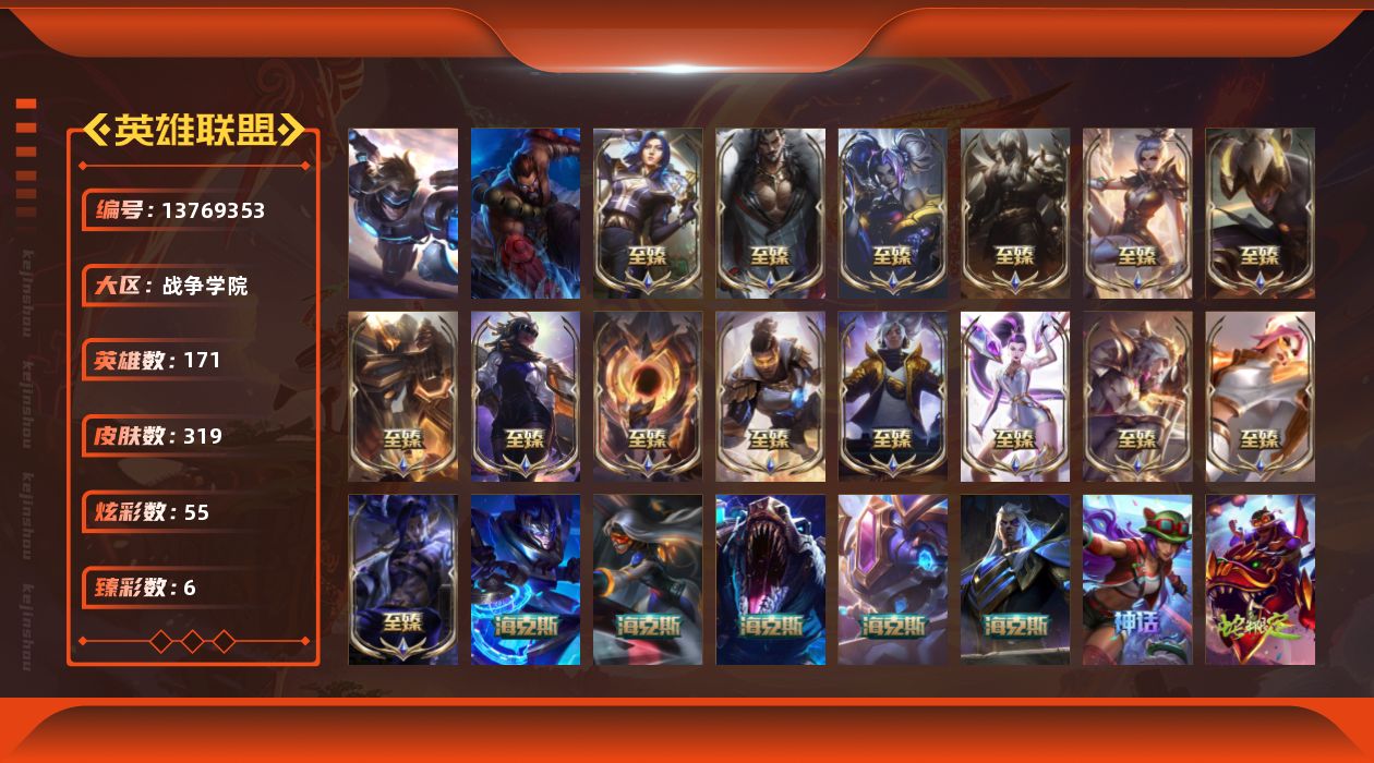 【18662】[13769353]t27887【战争学院】 319皮肤 55炫彩 6臻彩 27神话/40限定/45传说/171英雄 账号等级:375 云顶神话:3 【重要头像】云顶战斗学院伊泽瑞尔 KDA萨勒芬妮 女帝卡特琳娜炫彩 至臻福牛守护者菲奥娜 至臻女帝黛安娜 【重要皮肤】双城之战2指挥官凯特琳至臻 狼神英灵斯维因至臻 魔域梦魇泽丽至臻 墨之影武者亚索至臻 女帝黛安娜至臻 未来战士卢锡安