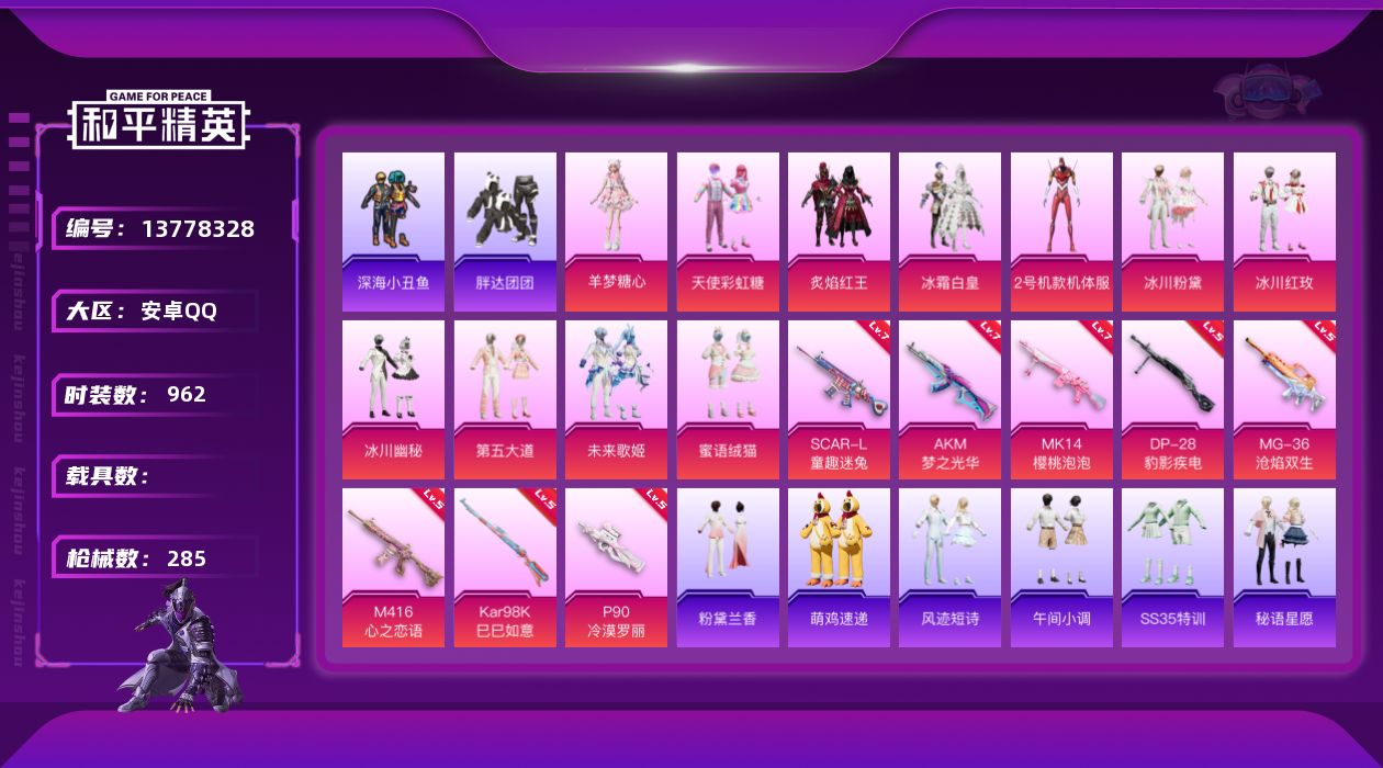 【20202】【不可二次】【安卓QQ】AKM-梦之光华 M416-心之恋语 天使彩虹糖 炙焰红王 深海小丑鱼 2号机款机体服 SCAR-童趣迷兔 红螳螂 冰霜白皇 激萌罗小黑 胖达团团