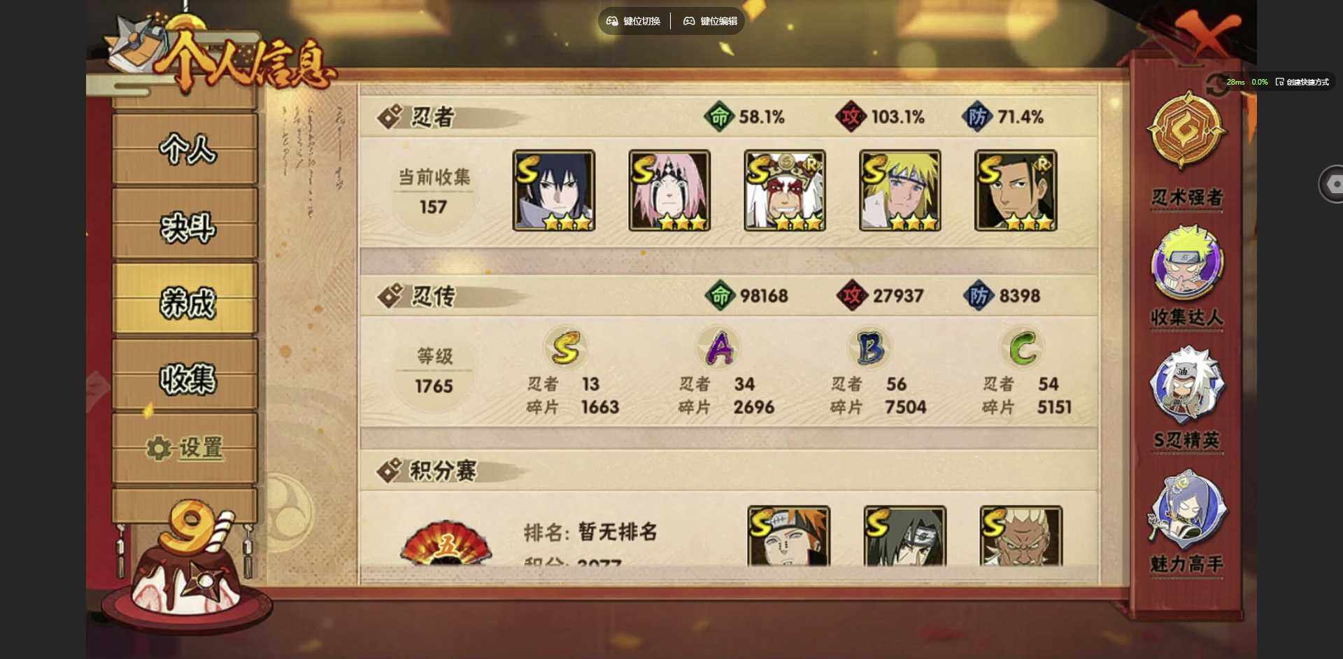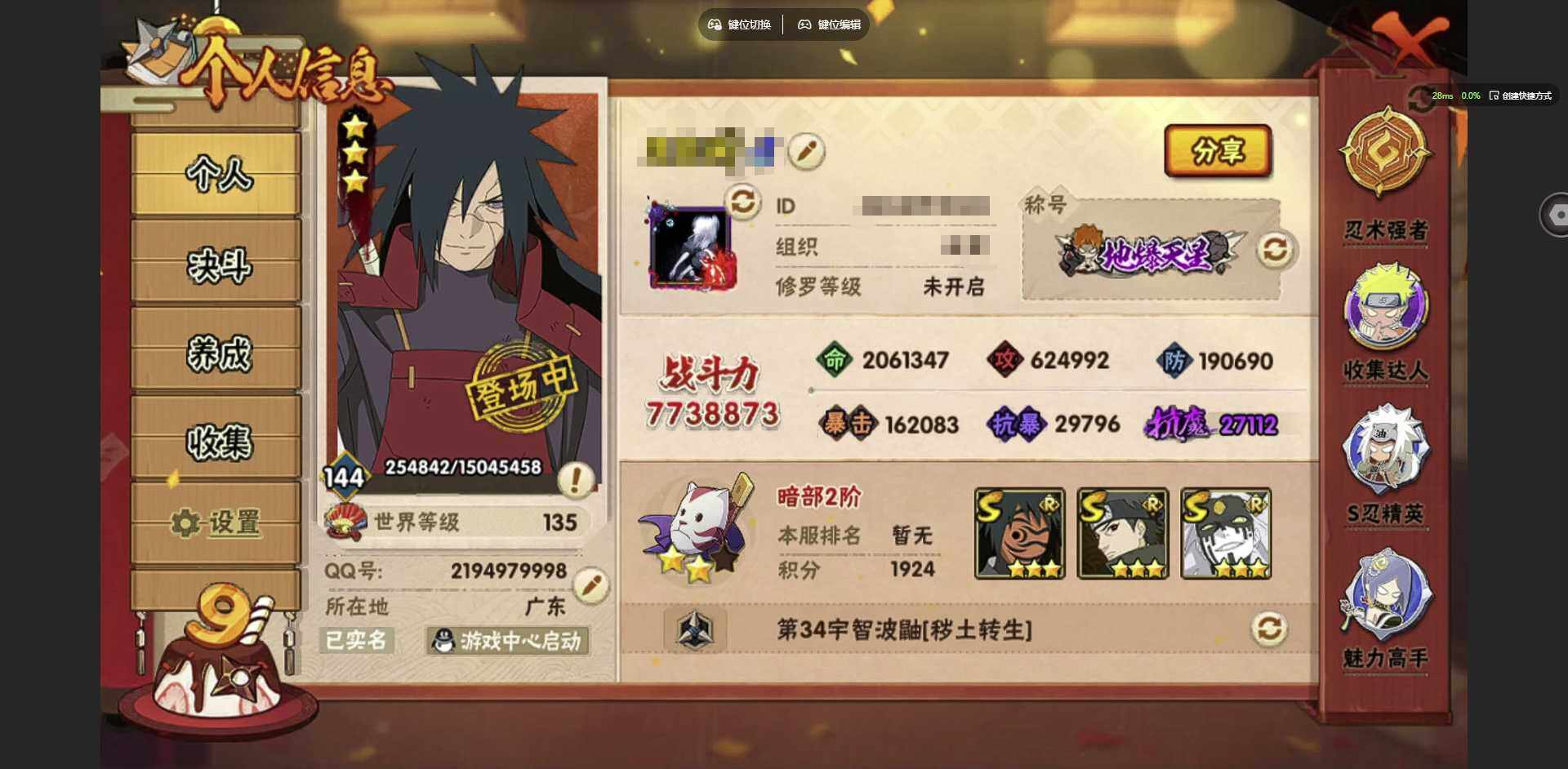 [13797146]贵族等级: V11 S忍数: 13 A忍数: 34 战力值(万): 773 S级忍者: 宇智波鼬「秽土转生」,佩恩「天道」,波风水门,宇智波鼬 「须佐能乎」,春野樱 「忍界大战」,神秘面具男 「红夜之刃」,宇智波佐助「永恒万花筒」,千手柱间·木叶创立,宇智波斑「秽土转生·解」,大筒木桃式,艾「忍界大战」,宇智波止水「须佐能乎」 ...