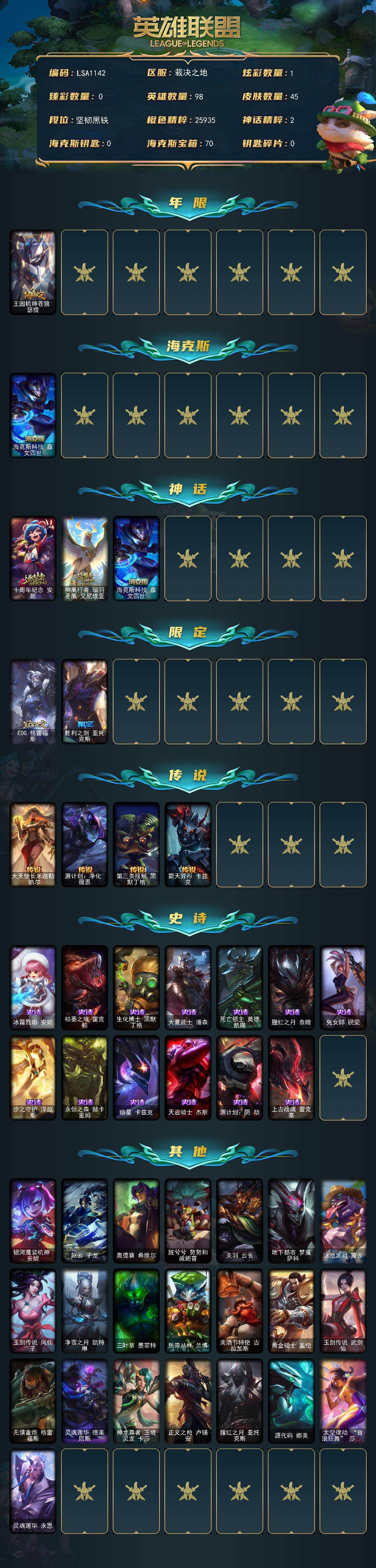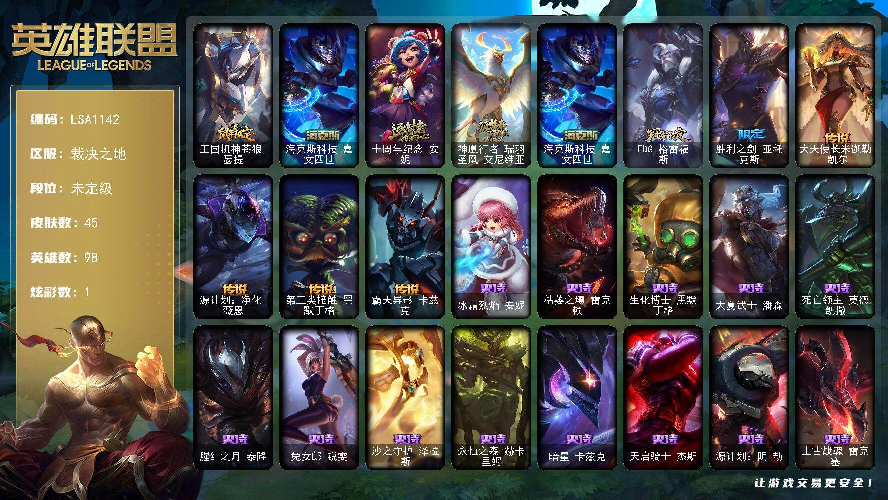 【28938】【LSA1142】98英雄/45皮肤/3神话/3限定/1炫彩/4传说/13史诗/未定级账号等级:249/王国机神苍狼瑟提/海克斯科技嘉文四世/十周年纪念安妮/神凰行者瑞羽凤凰艾尼维亚/EDG格雷福斯/胜利之剑亚托克斯/大天使长米迦勒凯尔/源计划:净化薇恩/第三类接触黑默丁格/霸天异形卡兹克/冰霜烈焰安妮/枯萎之壤雷克顿/生化博士黑默丁格/大夏武士潘森/死亡领主莫德凯撒/腥红之月泰隆