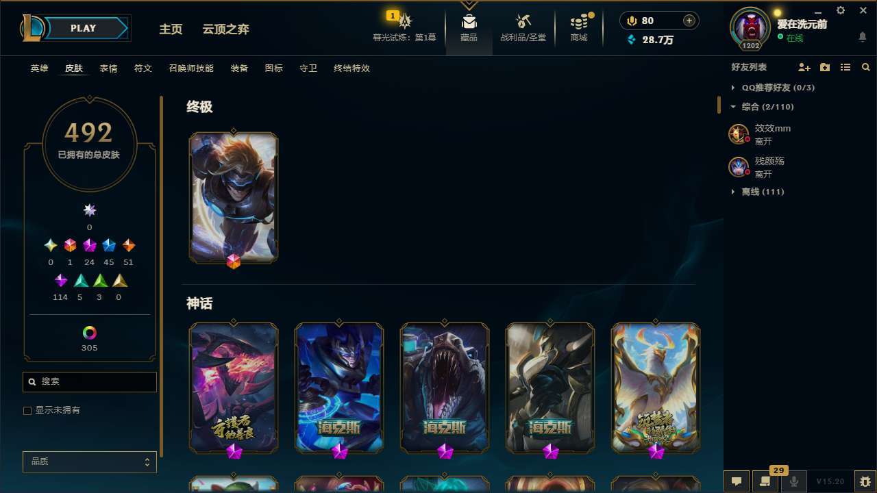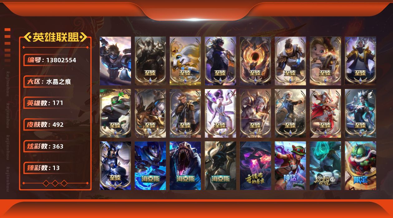 【29393】[13802554]t28297【水晶之痕】492皮肤 363炫彩 13臻彩 24神话/45限定/51传说/171英雄 账号等级:1202 单双排段位:黄金 【重要头像】喜庆红包 可爱安妮 至臻青花瓷丽桑卓 至臻星之守护者辛德拉 至臻奥术师佐伊 【重要皮肤】青花瓷丽桑卓至臻 星之守护者辛德拉至臻 神凰行者烈羽焰凰霞至臻 女帝黛安娜至臻 奥术师佐伊至臻 未来战士卢锡安至臻 真实伤害亚
