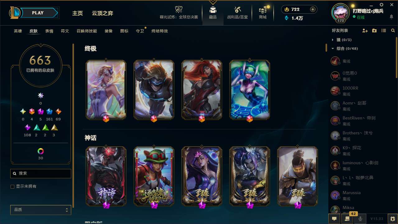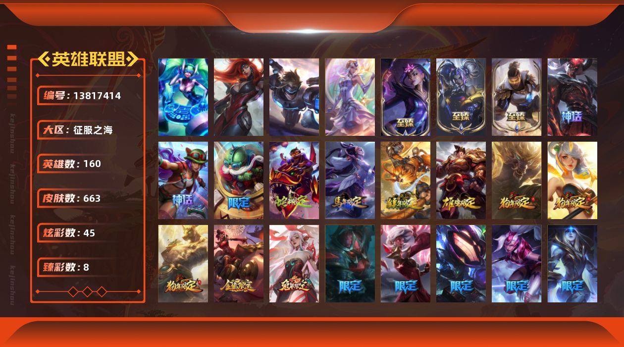 【31268】[13817414]t30510【征服之海】663皮肤 45炫彩 8臻彩 5神话/161限定/69传说/160英雄 账号等级:172 单双排段位:青铜【重要头像】小希 万圣节卡特琳娜 剪纸仙灵艾瑞莉娅 【重要皮肤】暗星女王黛安娜至臻 魔域梦魇泽丽至臻 未来战士卢锡安至臻 创世黑夜使者亚索 胜利女神希维尔 创星之灵璐璐 勇敢的心德莱厄斯 电玩女神厄运小姐 电玩勇