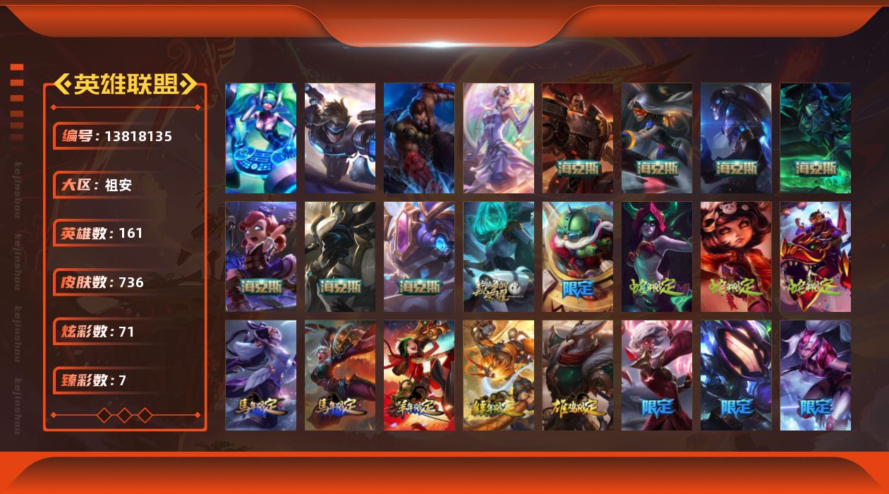 【31313】[13818135]t30514【祖安】黑龙瞎 蓝龙瞎 736皮肤 71炫彩 7臻彩 8神话/146限定/68传说/161英雄 账号等级:148【重要头像】小希 小斗 小多 小望与小牙 小智 披萨鸡 【重要皮肤】海克斯科技安妮 海克斯科技克格莫 海克斯科技玛尔扎哈 恐惧新星德莱厄斯 零之枪骑赫卡里姆 摄魂使者薇恩 新创战纪希维尔 守护者雕像瑞兹 胜利女神