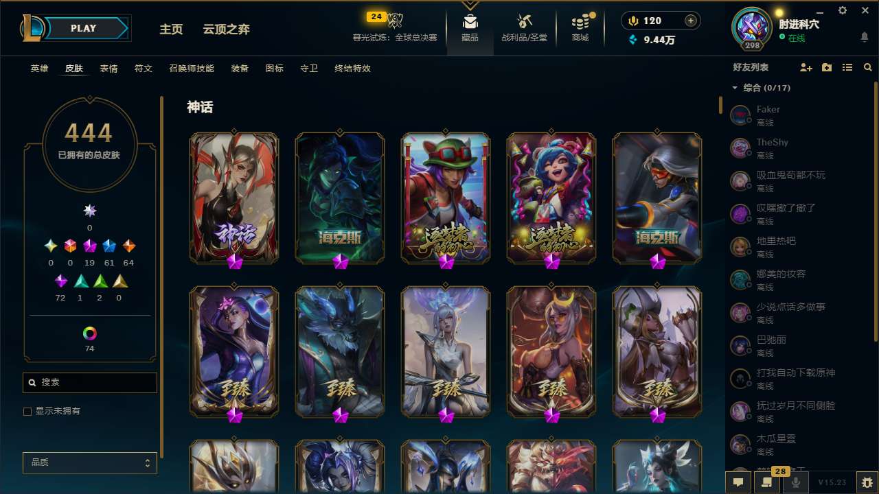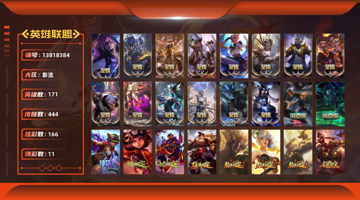 【31350】[13818384]t30522【影流】 444皮肤 166炫彩 11臻彩 19神话/61限定/64传说/171英雄 账号等级:298【重要头像】心型钥匙 星守金克丝炫彩 幼犬内瑟斯 战斗学院伊泽瑞尔神话炫彩 至臻青花瓷丽桑卓 西部魔影卢锡安炫彩头 【重要皮肤】暗星女王黛安娜至臻 魔域梦魇泽丽至臻 青花瓷丽桑卓至臻 北极星使者沃里克至臻 海珀利安小队X09星环灵