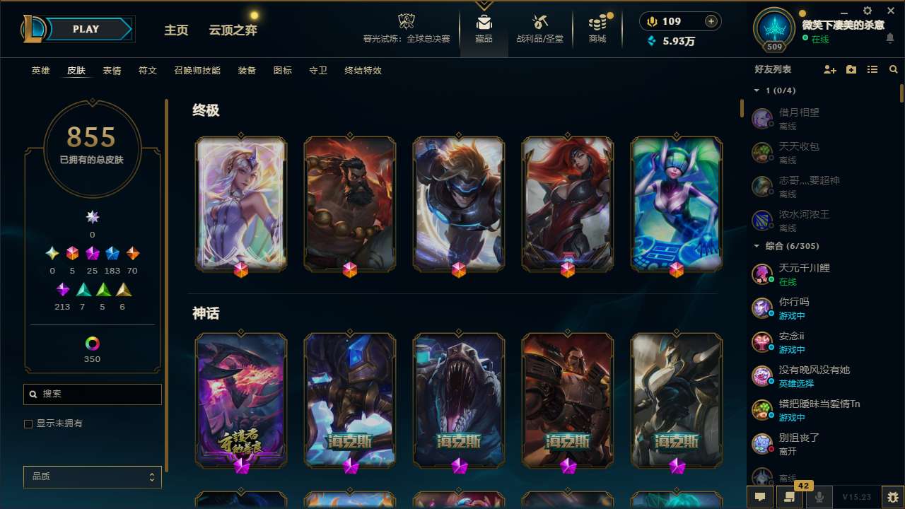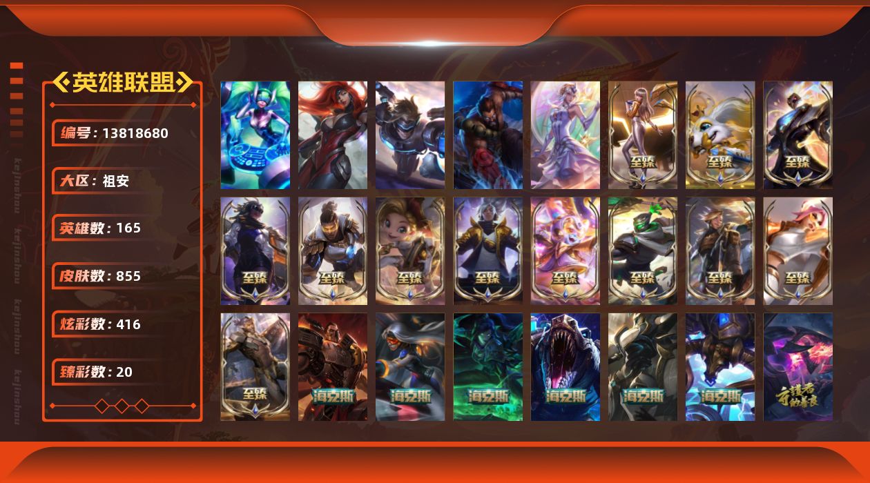 【31378】[13818680]t30515【祖安】855皮肤 416炫彩 20臻彩 25神话/183限定/70传说/165英雄 账号等级:509【重要头像】爱情之歌 觅心游侠卢锡安 觅心之翼奎因 周年男刀图标 周年女刀图标 两仪无极 卡特琳娜的匕首 春晖神女拉克丝 小希 我麦是开的么 泳池派对凯特琳 泳池派对佐伊 击拳 救生圈 小斗 小多 凯隐飞升影流 SS