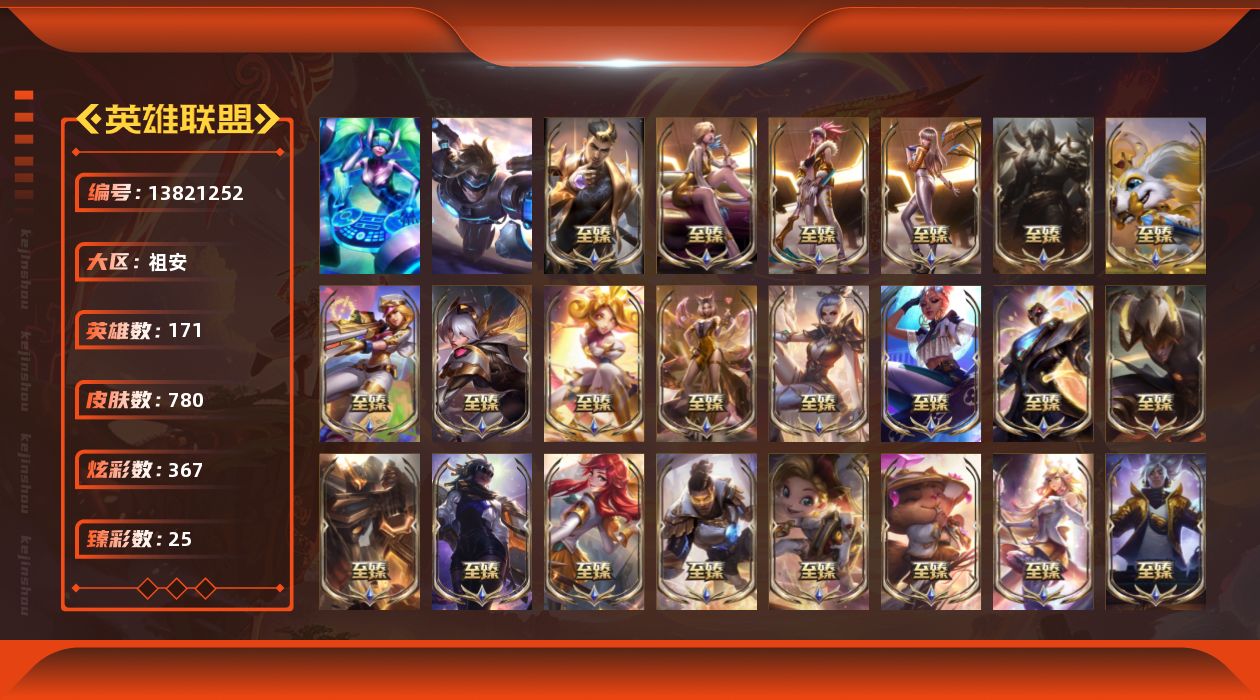 【31760】[13821252]t30550 双皇冠账号【祖安】 780皮肤 367炫彩 25臻彩 76神话/93限定/67传说/171英雄 账号等级:737【重要头像】云顶古琴娑娜 觅心之翼奎因 我麦是开的么 救生圈 电玩女神凯特琳 披萨鸡 不错哦 至臻海之歌萨勒芬妮 至臻幻灵战斗猫金克丝 至臻战斗学院蕾欧娜 至臻星之守护者索拉卡 至臻KDA卡莎 至臻奥术师佐伊 【