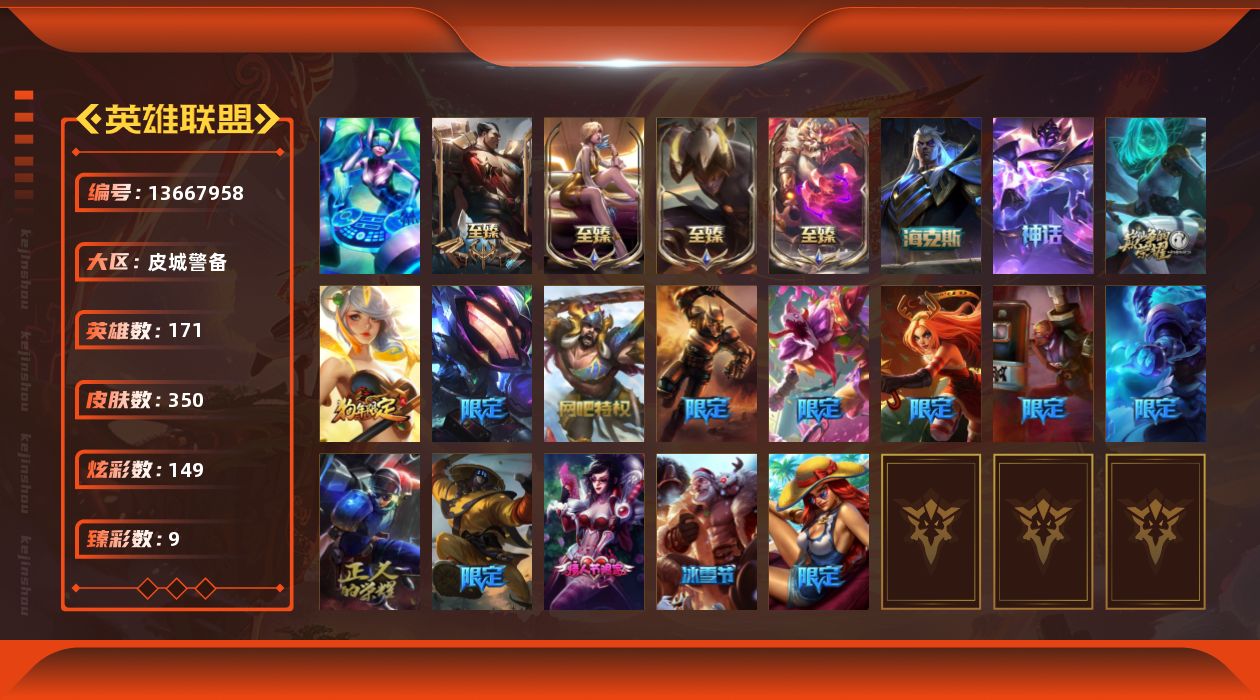 【34922】[13667958]t30177【皮城警备】350皮肤 149炫彩 9臻彩 10神话/34限定/38传说/171英雄 账号等级:522【重要头像】觅心游侠卢锡安 两仪无极 【重要皮肤】凯旋将军德莱厄斯至臻 神龙尊者均衡之龙沃利贝尔至臻 KDA伊芙琳至臻 黑夜使者李青至臻 殿堂传奇乐芙兰 水晶巫灵泽拉斯 海克斯科技斯维因 胜利女神娑娜 胜利巨口克格莫 天龙之子斯