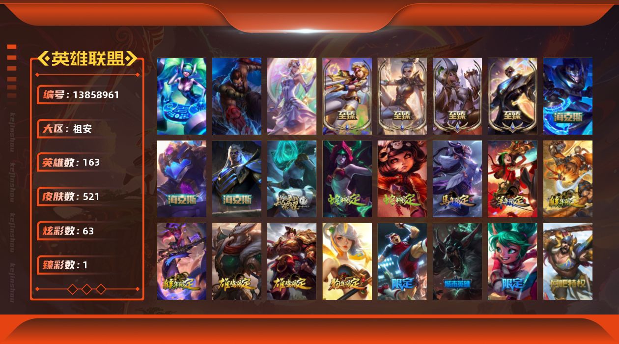 【34935】[13858961]t30624 皇冠账号【祖安】原皮龙瞎 521皮肤 63炫彩 1臻彩 10神话/90限定/54传说/163英雄 账号等级:453【重要头像】周年男刀图标 周年女刀图标 【重要皮肤】电玩女神凯特琳至臻 魅惑女巫厄运小姐至臻 玉剑传说武剑仙至臻 未来战士锤石至臻 海克斯科技斯维因 海克斯科技嘉文四世 海克斯科技拉莫斯 胜利女神希维尔 哥特萝莉安妮