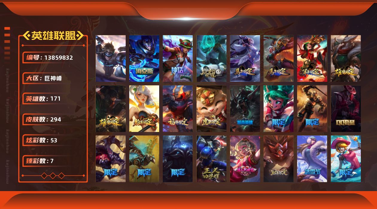 【35052】[13859832]t30629 皇冠账号【巨神峰】294皮肤 53炫彩 7臻彩 4神话/47限定/37传说/171英雄 账号等级:616 云顶神话:2 单双排段位:白银【重要头像】招财进宝提莫炫彩 战斗学院伊泽瑞尔神话炫彩 【重要皮肤】海克斯科技嘉文四世 胜利剑圣易 胜利女神娑娜 胜利之王泰达米尔 胜利巨口克格莫 荣誉使者玛尔扎哈 电玩女神阿狸 点心宝贝阿木木