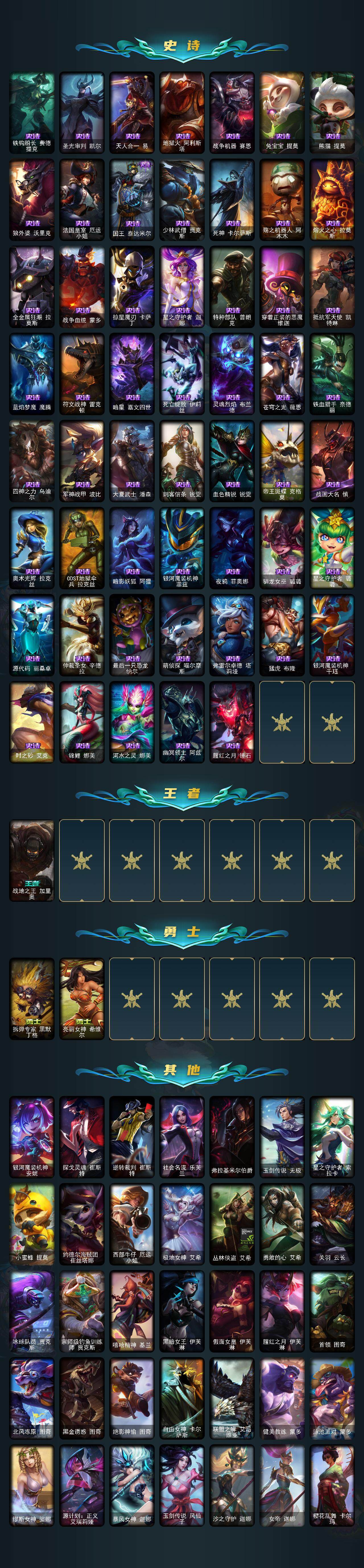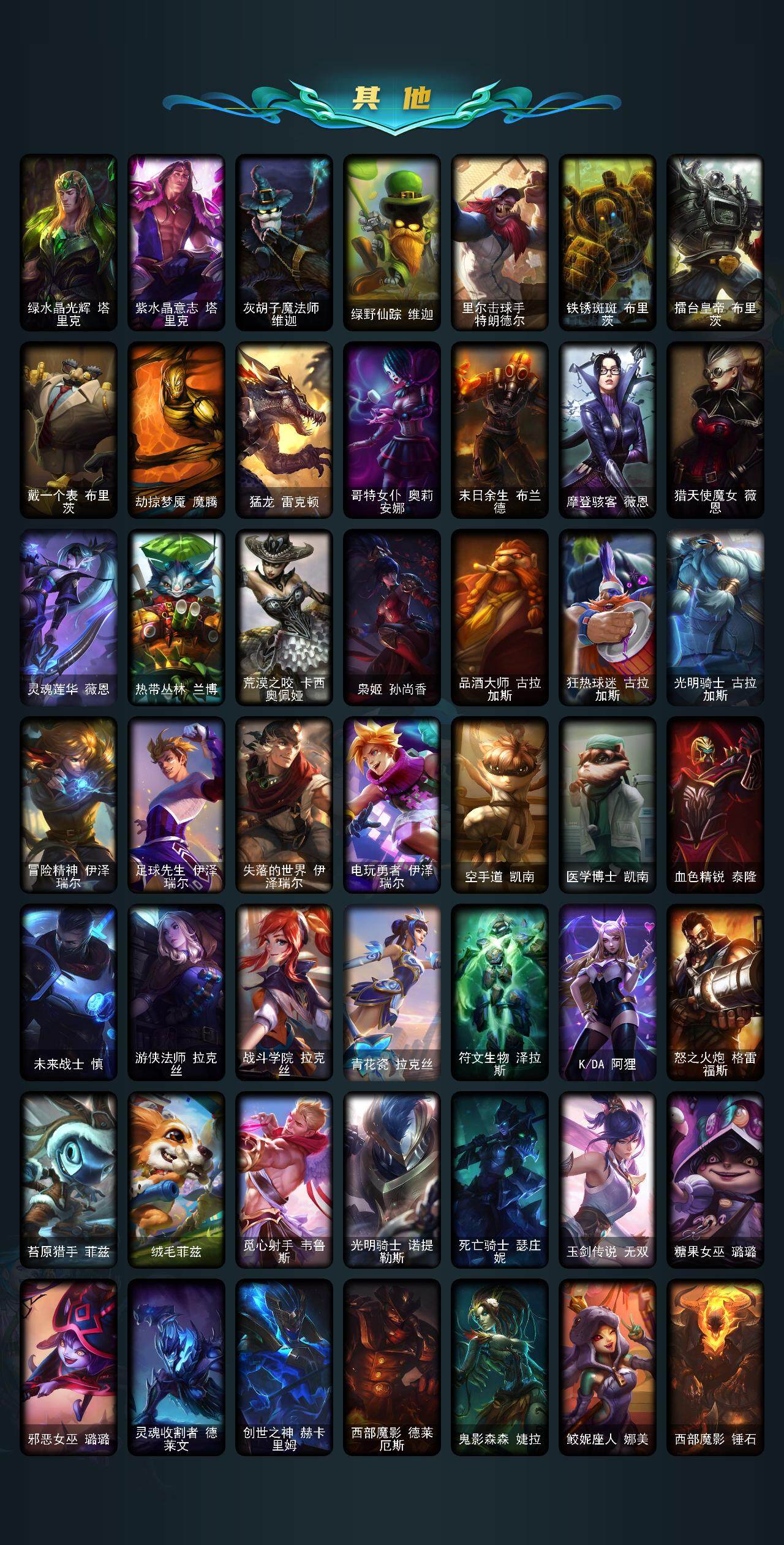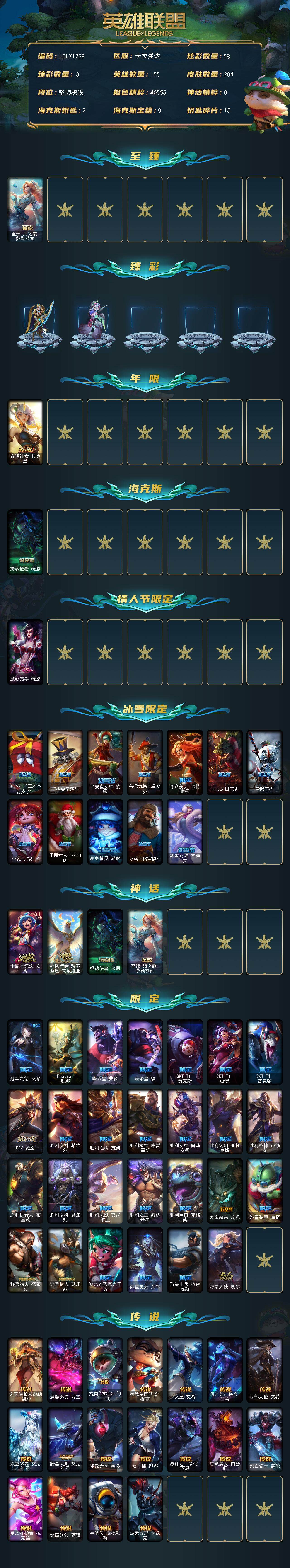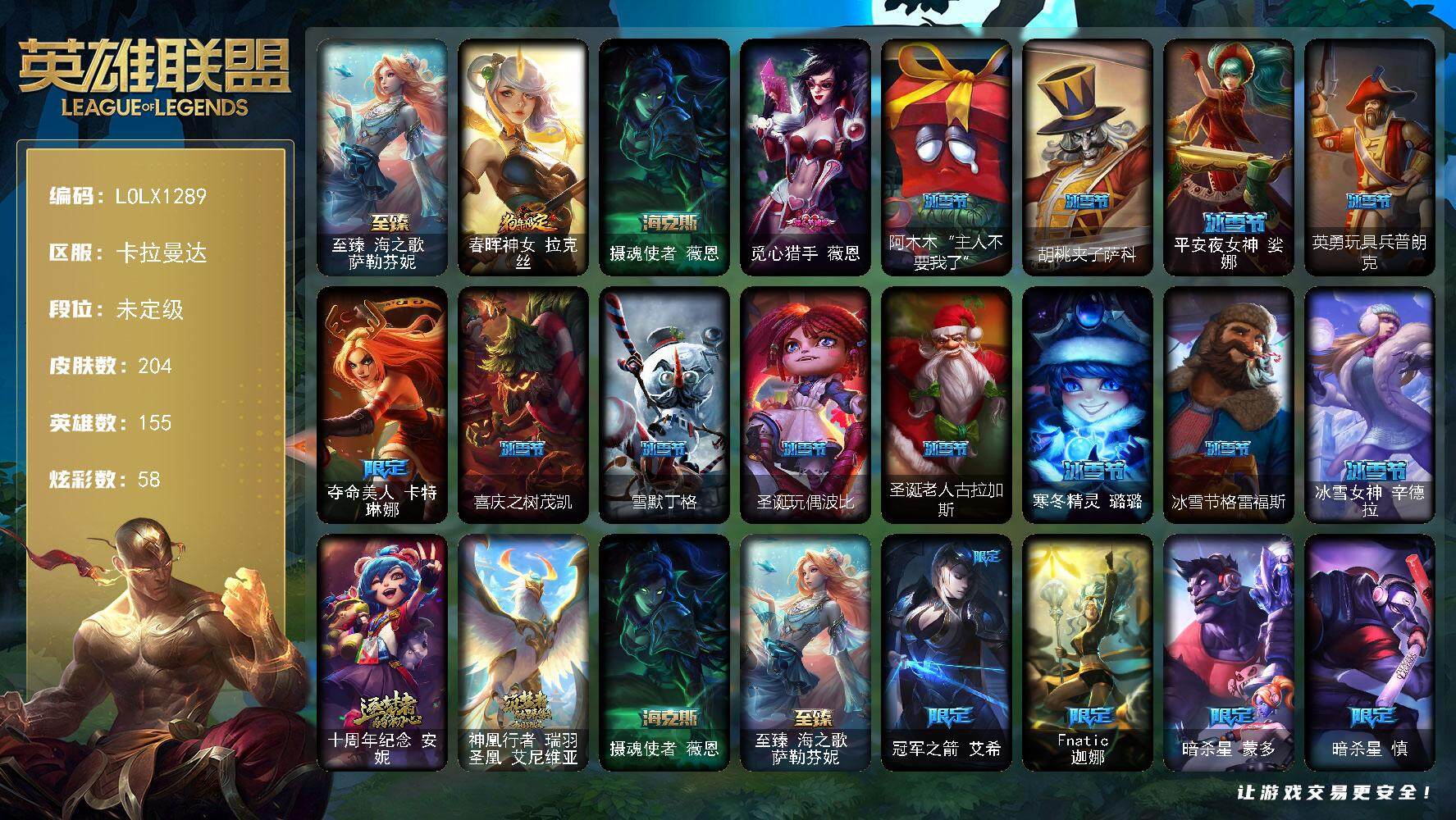 【39672】【LOLX1289】155英雄/204皮肤/4神话/41限定/3臻彩/58炫彩/18传说/54史诗/未定级/至臻海之歌萨勒芬妮/冠军之箭艾希凯旋圣装/魔女阿卡丽虚荣/净雪之月莫甘娜冬虹/春晖神女拉克丝/摄魂使者薇恩/觅心猎手薇恩/阿木木:“主人不要我了”/胡桃夹子萨科/平安夜女神娑娜/英勇玩具兵普朗克/夺命美人卡特琳娜/喜庆之树茂凯/雪默丁格/圣诞玩偶波比/圣诞老人古拉加斯/寒冬精