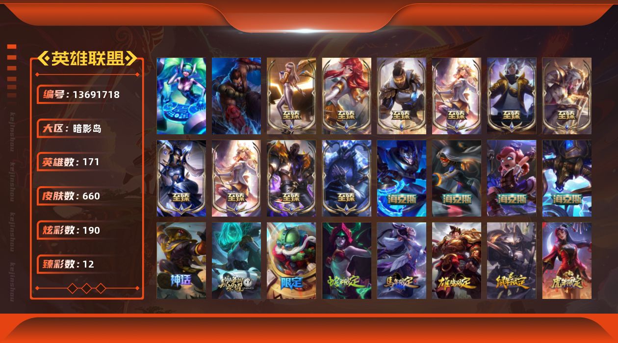 【40416】[13691718]t30298 皇冠账号【暗影岛】 660皮肤 190炫彩 12臻彩 17神话/97限定/64传说/171英雄 账号等级:748 单双排段位:青铜【重要头像】两仪无极 春晖神女拉克丝 万圣节卡特琳娜 幻灵战斗猫金克丝炫彩 不错哦 至臻青花瓷丽桑卓 【重要皮肤】斗魂觉醒派克至臻 DRX亚托克斯至臻 青花瓷丽桑卓至臻 女帝黛安娜至臻 未来战士卢锡安