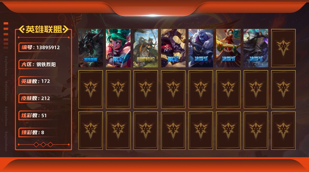 【41992】[13895912]t30673【钢铁烈阳】212皮肤 51炫彩 8臻彩 1神话/15限定/22传说/172英雄 账号等级:535【重要头像】沐浴震惊 【重要皮肤】胜利剑圣易 胜利女神娑娜 点心宝贝阿木木 北极星猎人斯维因 冰封王子蒙多 平安夜女神娑娜 SKTT1贾克斯 暗杀星努努和威朗普 野兽猎人瑟庄妮 暗影沃里克 波比的巧克力工坊 都铎王朝图奇 十周年