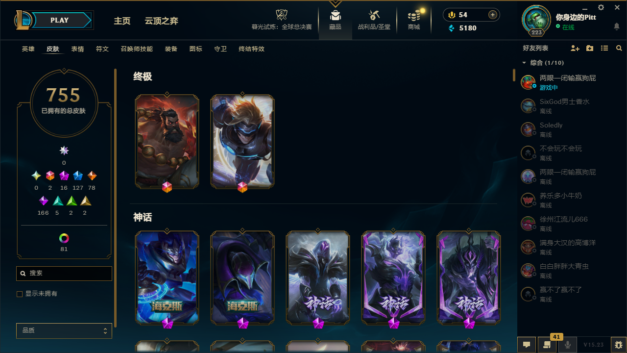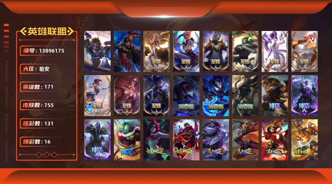 【42065】[13896175]t30682【祖安】755皮肤 131炫彩 16臻彩 16神话/127限定/78传说/171英雄 账号等级:223【重要头像】星守阿狸 吕布奉先手办 爱意绵绵 爱情鸽 心型钥匙 觅心之翼奎因 银河魔装机神安妮 万圣节卡特琳娜 KDA萨勒芬妮 沐浴震惊 送披萨的小姐姐希维尔 魄罗虎虎生威 福运魄罗 太空律动猫猫 美猴王孙悟空 不错哦