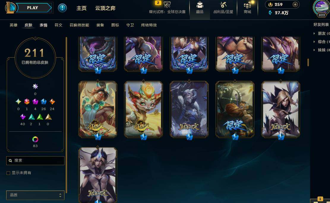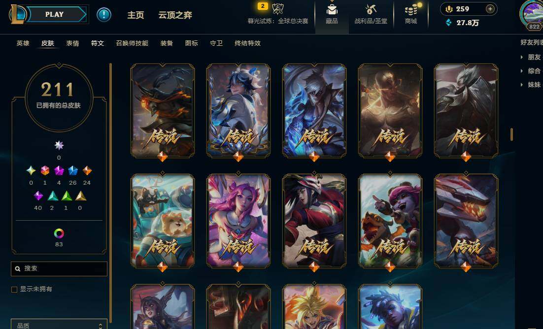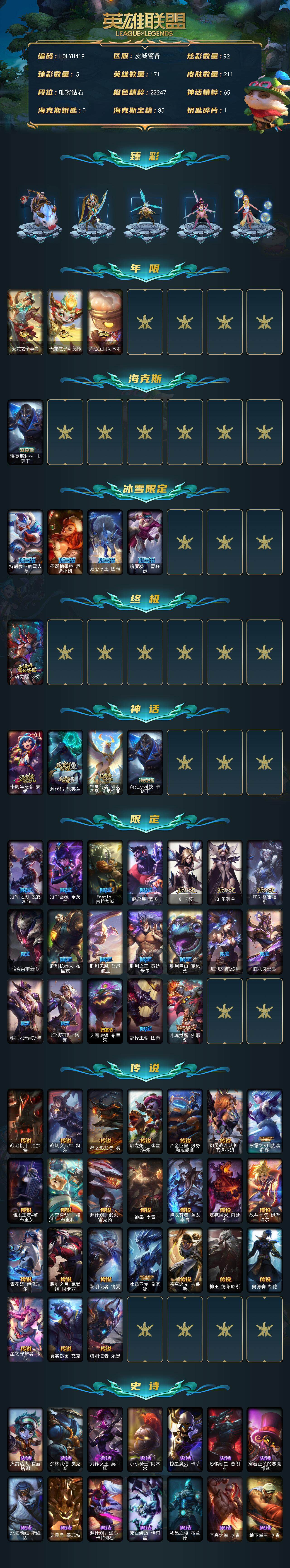 【42073】【LOLYH419】171英雄/211皮肤/1终极/4神话/26限定/5臻彩/92炫彩/24传说/40史诗/钻石账号等级:822/无畏骑士瑟庄妮赤子初心/冠军之箭艾希凯旋圣装/冰霜之刃艾瑞莉娅炫金/玉剑传说舞剑仙承影/泳池派对辛德拉荔枝枝连击/天龙之子李青/天龙之子斯莫德/点心宝贝阿木木/海克斯科技卡萨丁/持胡萝卜的雪人易/圣诞糖果棒厄运小姐/狂心冰王图奇/魄罗骑士瑟庄妮/斗魂觉醒