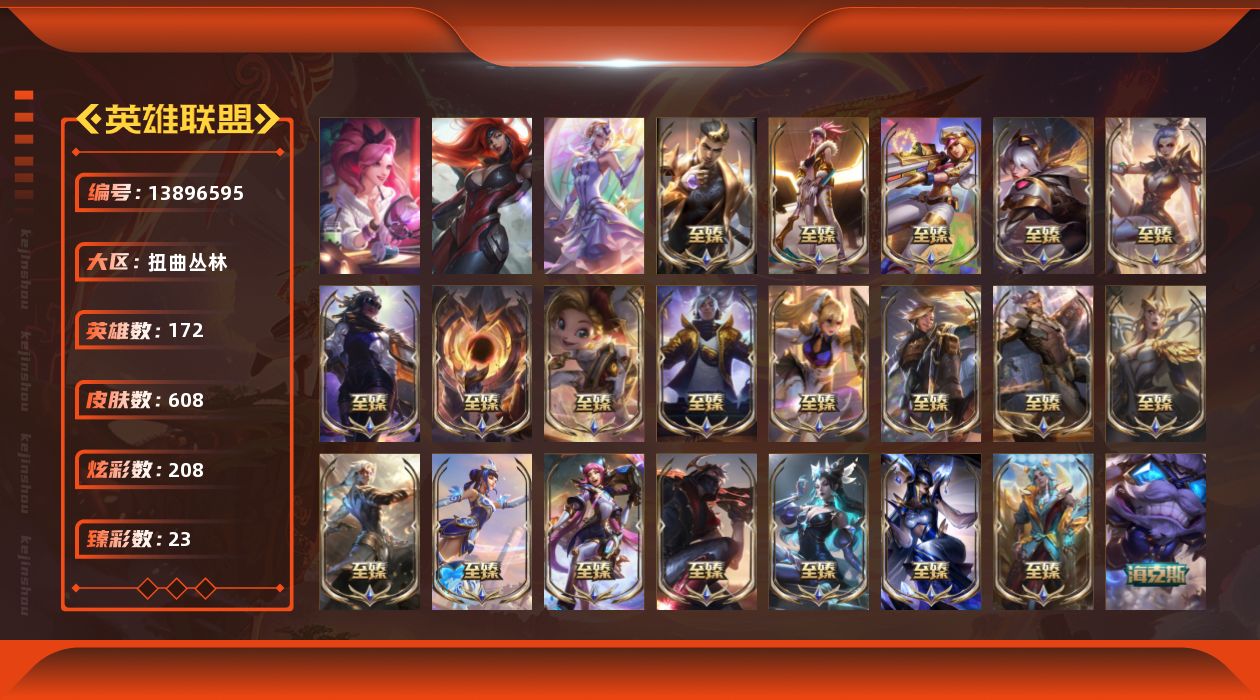 【42192】[13896595]t30692【扭曲丛林】608皮肤 208炫彩 23臻彩 30神话/91限定/73传说/172英雄 账号等级:437 云顶神话:1【重要头像】云顶战斗学院伊泽瑞尔 萨勒芬妮超级巨星 萨勒芬妮独立音乐人 我麦是开的么 幻灵战斗队长厄运小姐 EDG厄斐琉斯 EDG佛耶戈 EDG格雷福斯 EDG悠米 EDG佐伊 星守金克丝炫彩 幻灵战队猫金克丝
