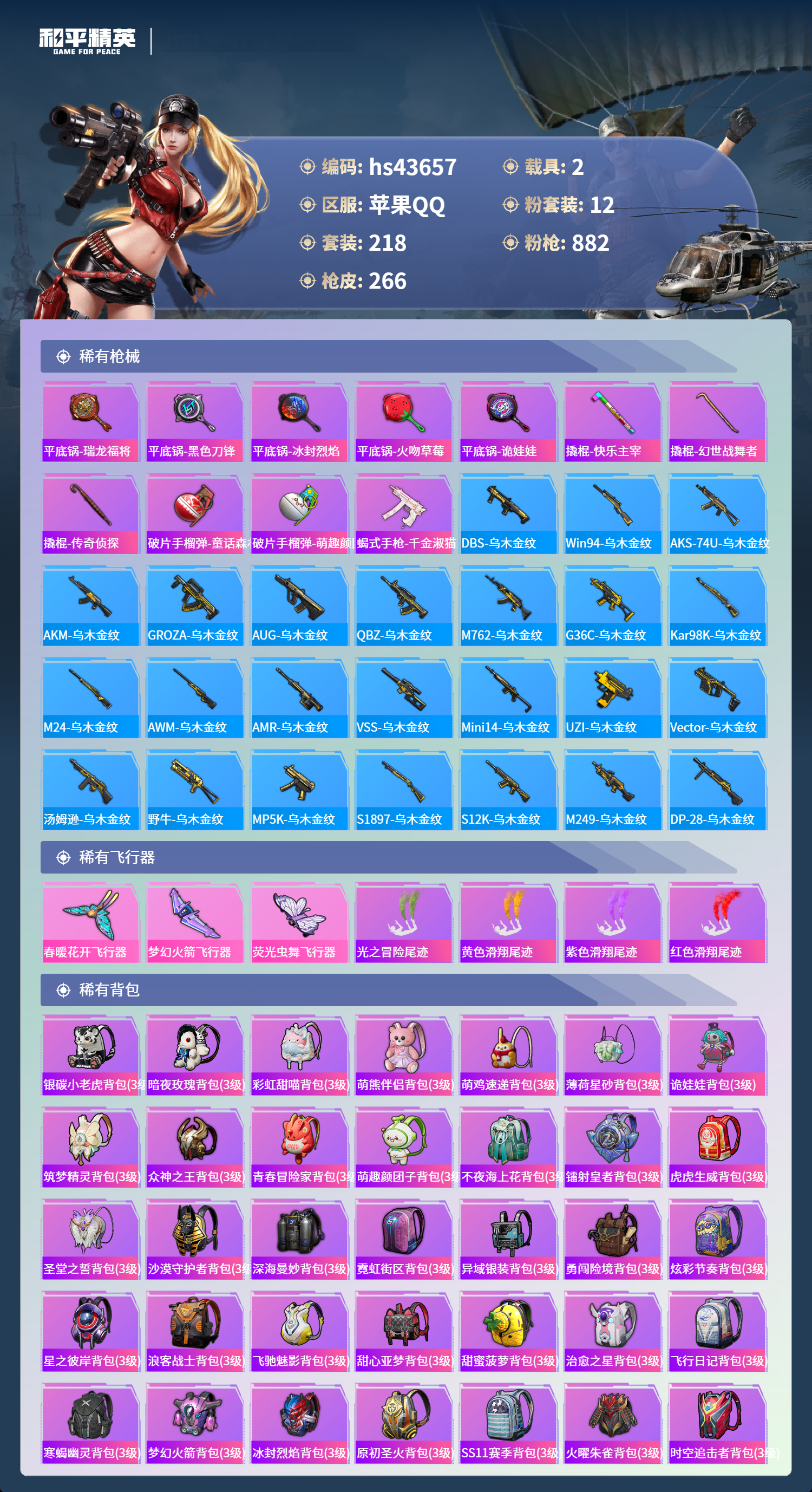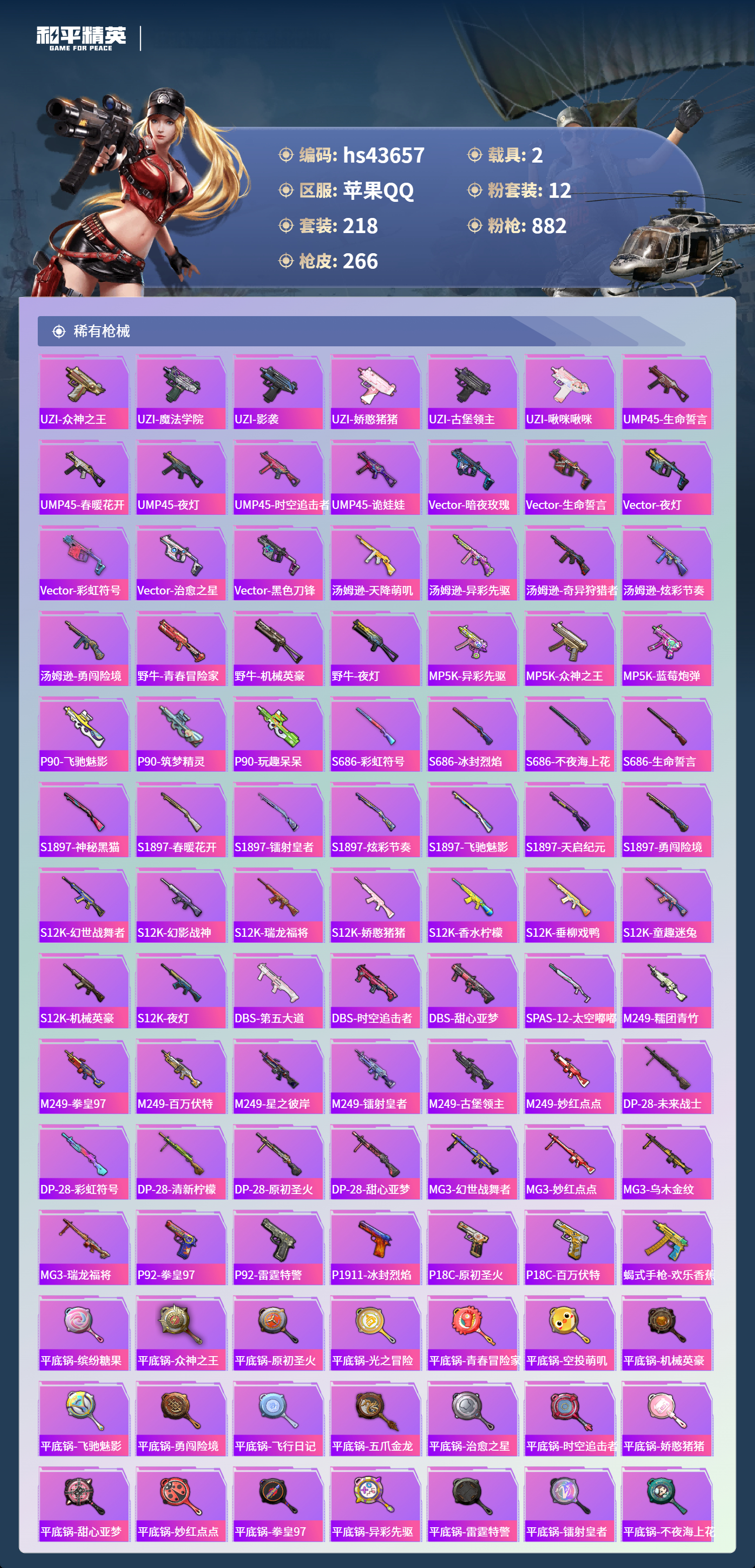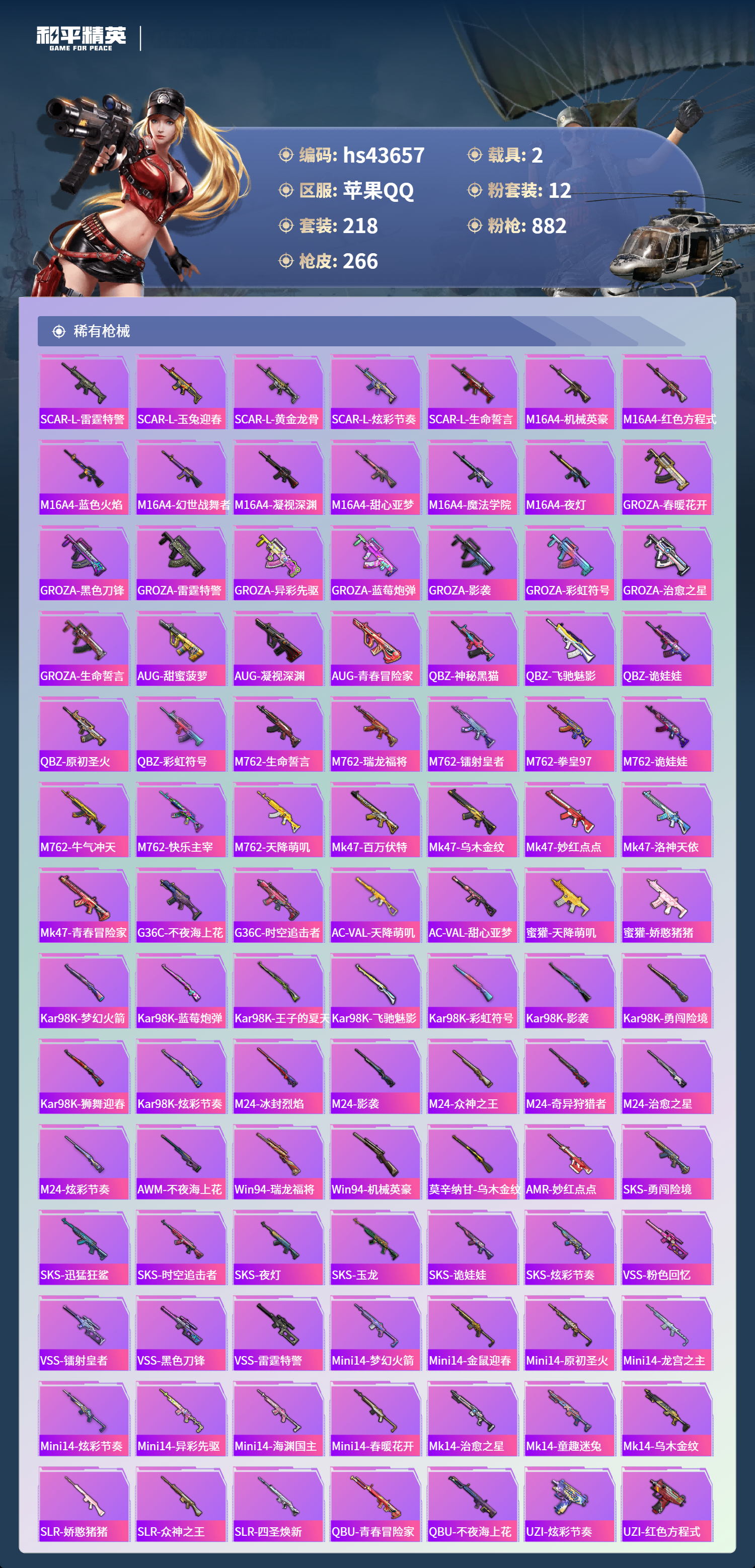 【42636】【可二次】【苹果QQ】龟仙人 水银刺客 金曜白虎 漫步者 都市猎人 M249-古堡领主 鳞翅贤者 土耀战麟 忍者信条 寒蝎幽灵 M416-至情至圣 M416-仓鼠灰灰 M416-心之恋语 缤纷油彩 SCAR-童趣迷兔 蝶舞迷情 SCAR-L-梦幻火箭 迷蝶贵族 M762-瑞龙福将 潮萌小黄鸭 黑色刀锋 狂沙舞者 AKM-炫紫旋律 荧光虫舞飞行器 白月香洋装 M249-蓝莓炮弹 金耀