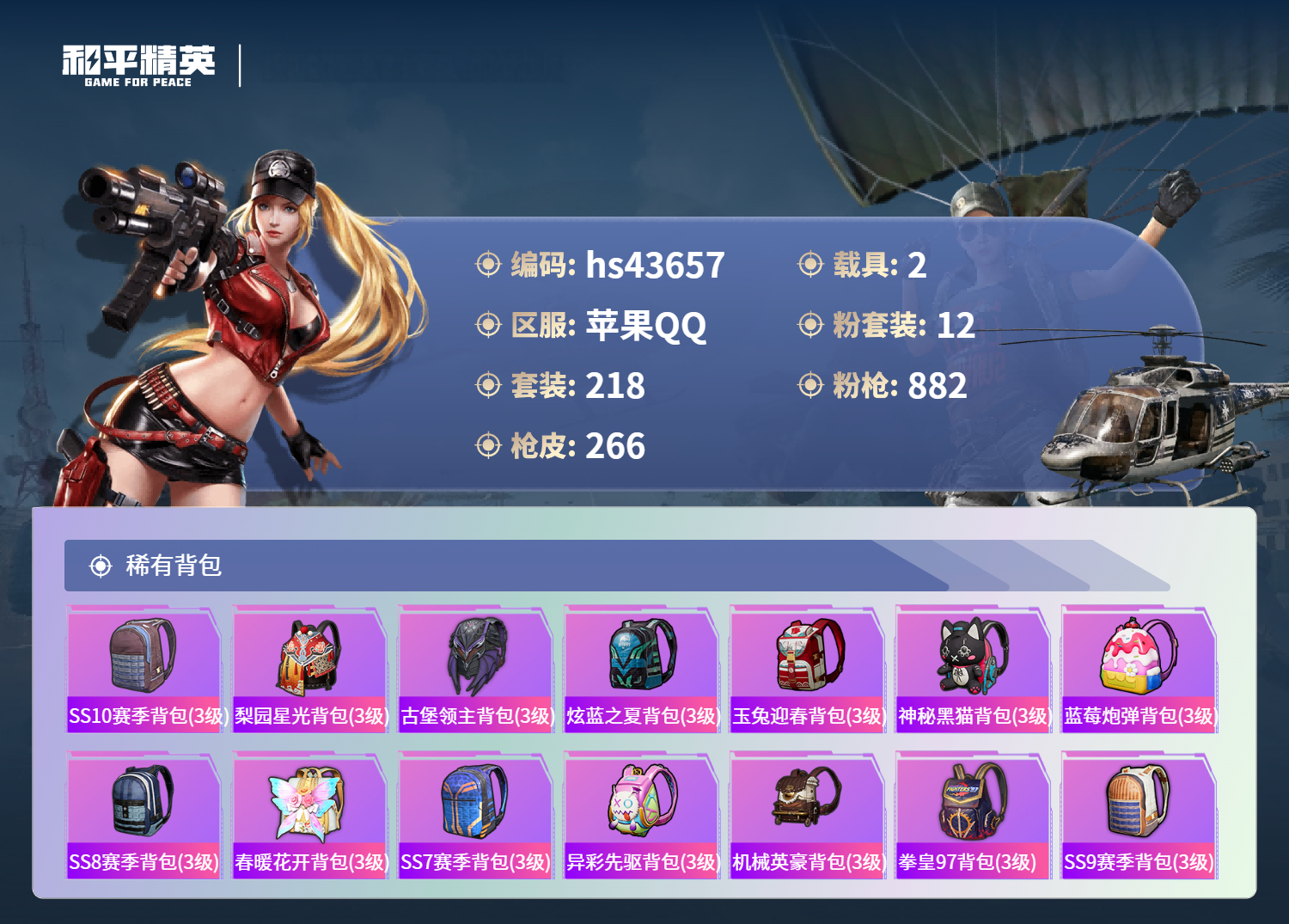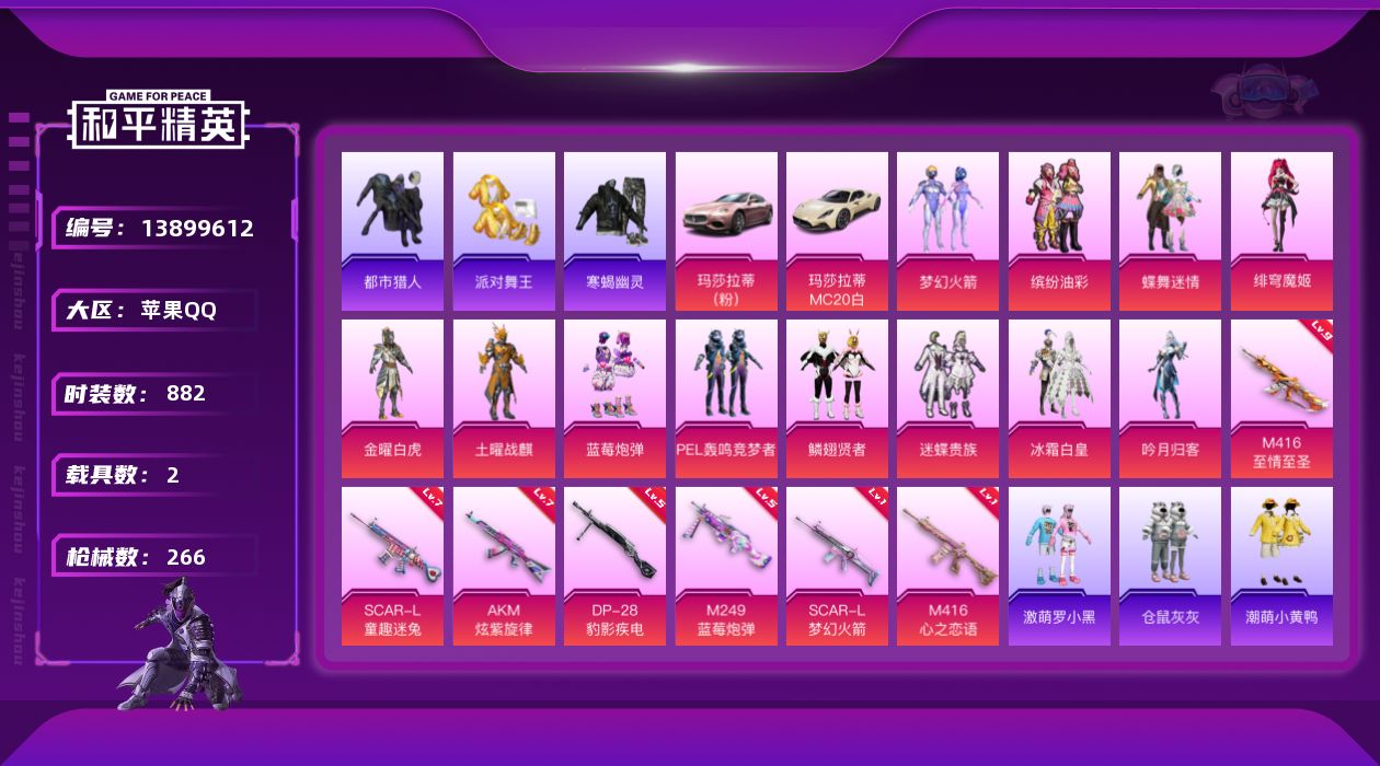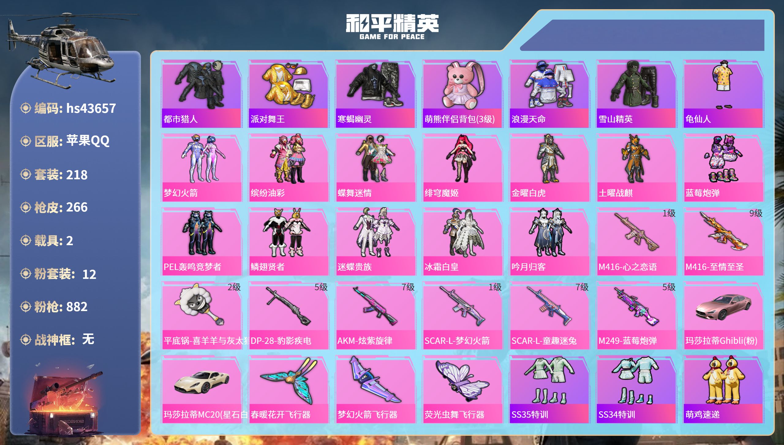 【42636】【可二次】【苹果QQ】龟仙人 水银刺客 金曜白虎 漫步者 都市猎人 M249-古堡领主 鳞翅贤者 土耀战麟 忍者信条 寒蝎幽灵 M416-至情至圣 M416-仓鼠灰灰 M416-心之恋语 缤纷油彩 SCAR-童趣迷兔 蝶舞迷情 SCAR-L-梦幻火箭 迷蝶贵族 M762-瑞龙福将 潮萌小黄鸭 黑色刀锋 狂沙舞者 AKM-炫紫旋律 荧光虫舞飞行器 白月香洋装 M249-蓝莓炮弹 金耀