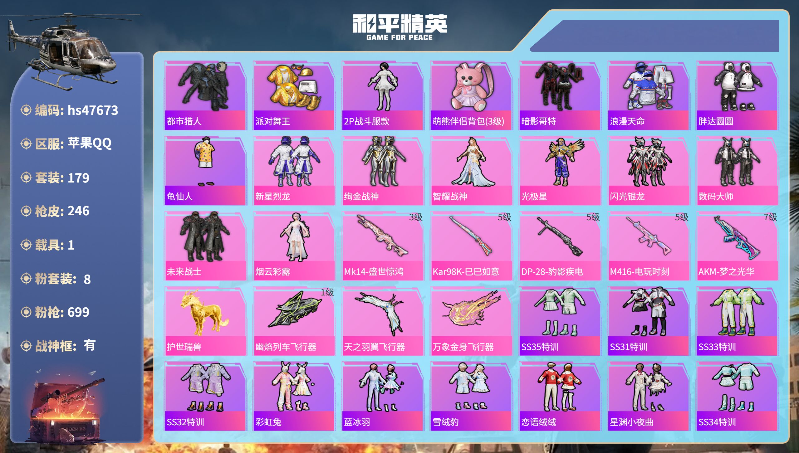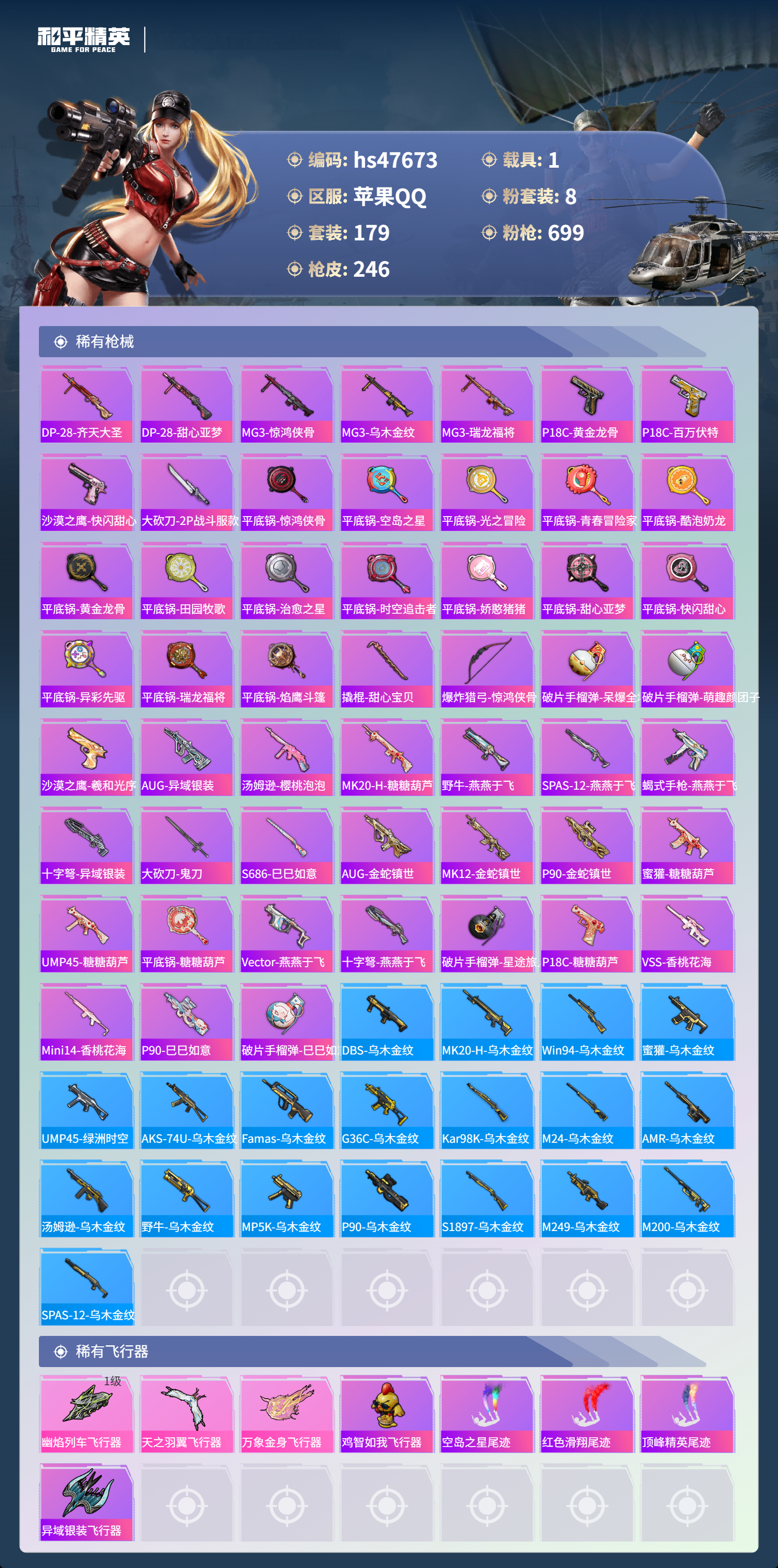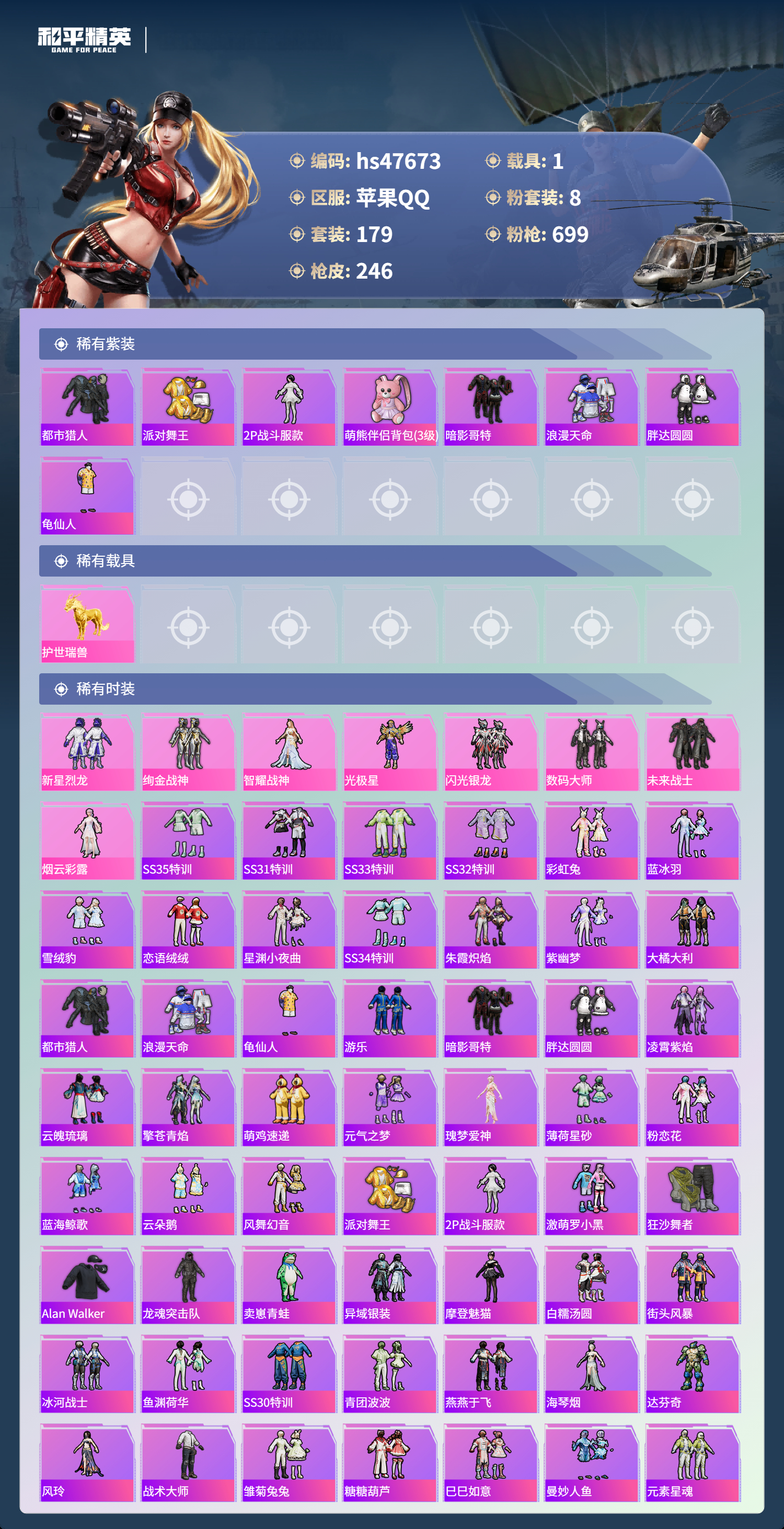 【43183】【不可二次】【苹果QQ】龟仙人 绚金战神 漫步者 都市猎人 新星烈龙 M24-奇异狩猎者 M762-瑞龙福将 狂沙舞者 极速红龙 M416-电玩时刻 AKM-梦之光华 AKM-缤纷海域 数码大师 天之羽翼飞行器 瑞龙福将 派对舞王 未来战士 醒狮腾龙 浪漫天命 暗影哥特 激萌罗小黑 胖达圆圆 团圆交子