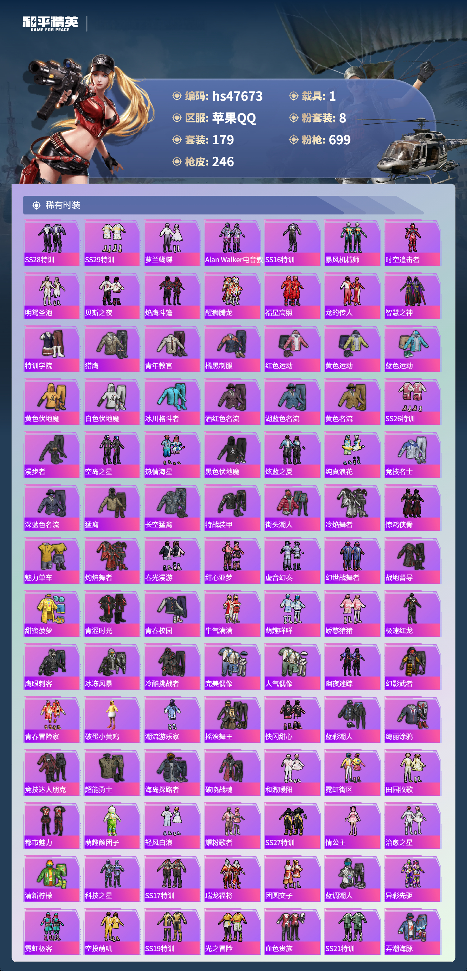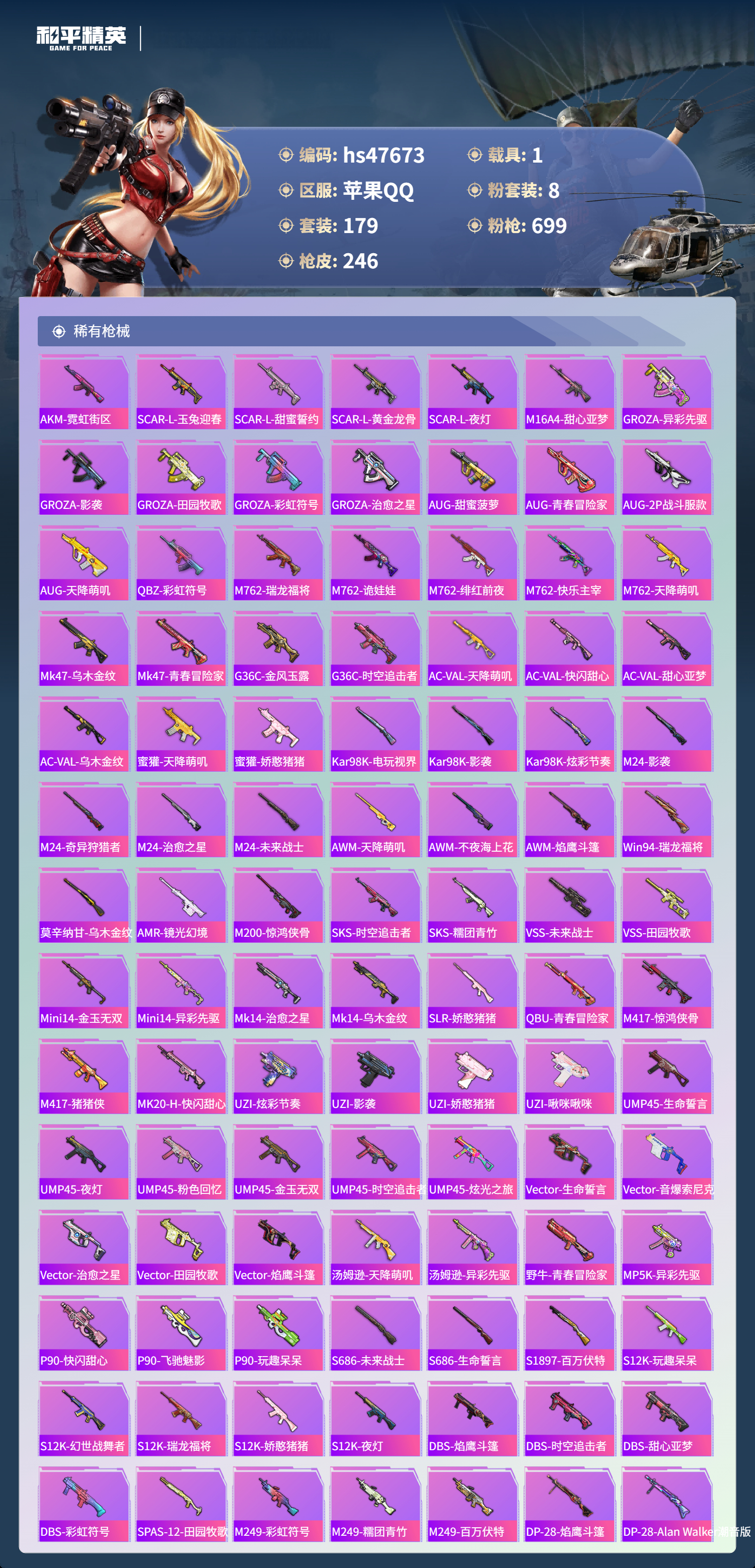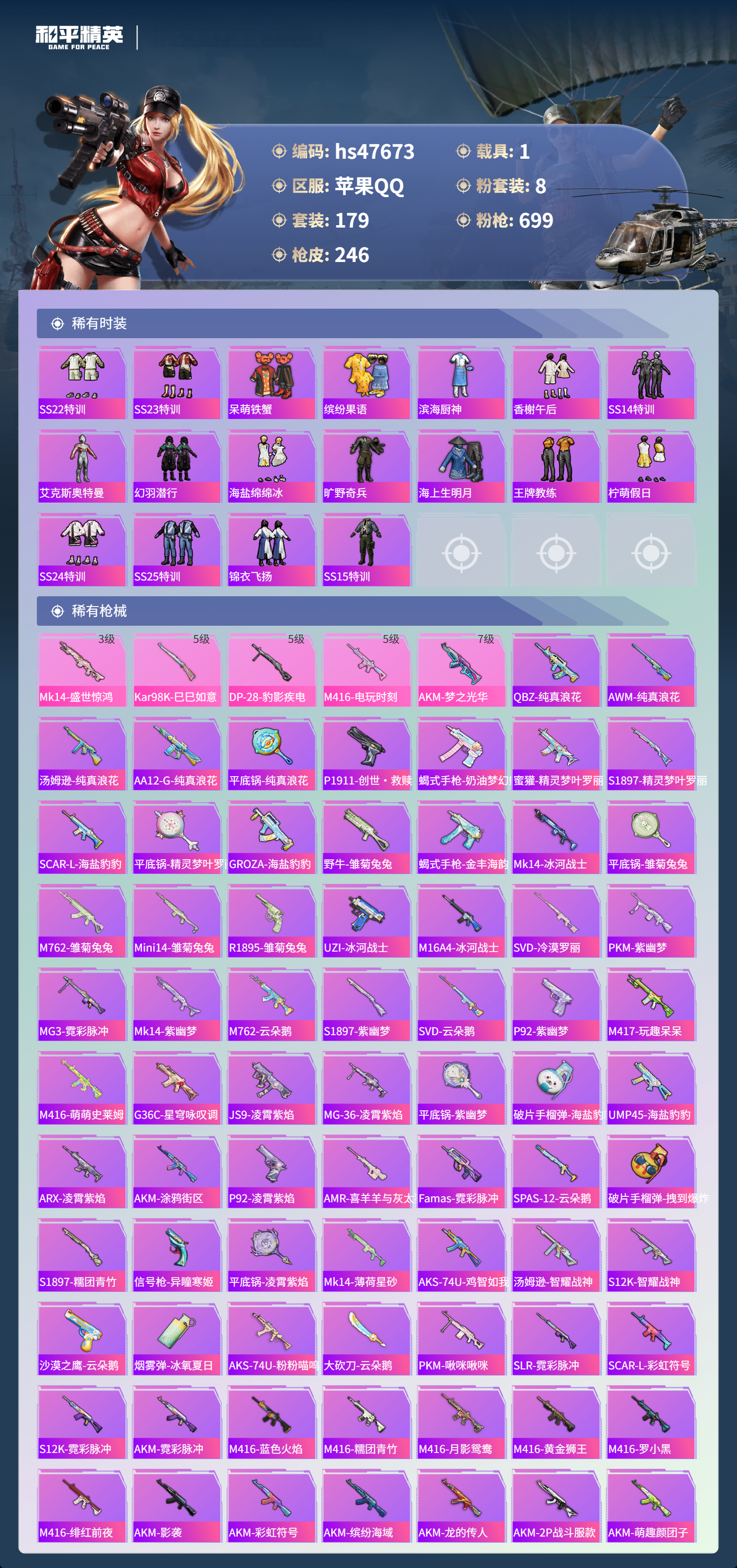 【43183】【不可二次】【苹果QQ】龟仙人 绚金战神 漫步者 都市猎人 新星烈龙 M24-奇异狩猎者 M762-瑞龙福将 狂沙舞者 极速红龙 M416-电玩时刻 AKM-梦之光华 AKM-缤纷海域 数码大师 天之羽翼飞行器 瑞龙福将 派对舞王 未来战士 醒狮腾龙 浪漫天命 暗影哥特 激萌罗小黑 胖达圆圆 团圆交子