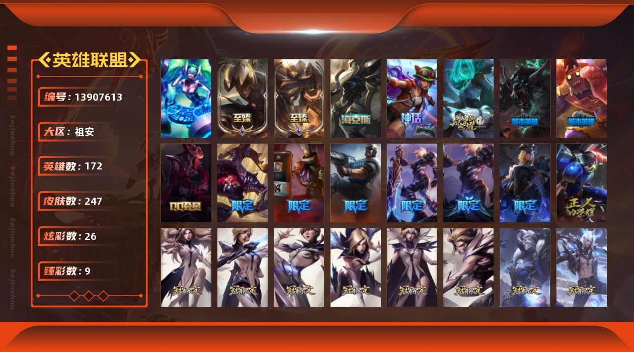 【44909】[13907613]t30721【祖安】 247皮肤 26炫彩 9臻彩 6神话/43限定/26传说/172英雄 账号等级:373【重要头像】SSG霞 EDG厄斐琉斯 EDG佛耶戈 EDG格雷福斯 EDG悠米 EDG佐伊 【重要皮肤】机神玄武盖伦至臻 黑夜使者李青至臻 零之枪骑赫卡里姆 生化领主泰达米尔 海珀利安小队Z01猎户座卢锡安 胜利机器人布里茨 胜利女