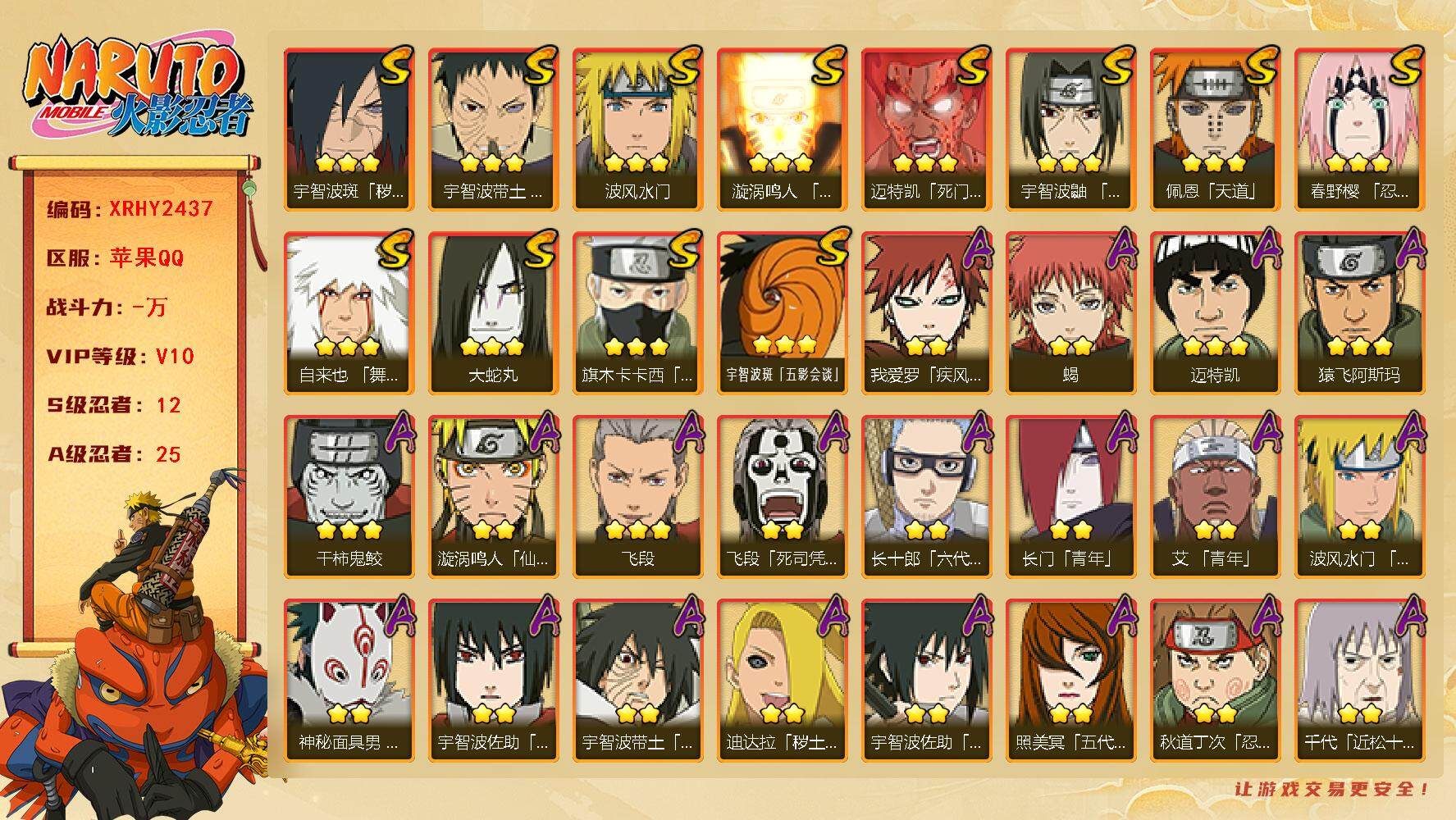 [13946278]Xr44753-苹果q-可二次-12S级忍者数-25A级忍者数 【S级忍者】:宇智波斑「秽土转生·解」(3星),春野樱「忍界大战」(3星),宇智波带土「忍界大战」(3星),宇智波鼬「须佐能乎」(3星),旗木卡卡西「须佐能乎」(3星),自来也「舞之豪杰」(3星),大蛇丸(3星),波风水门(3星),漩涡鸣人「九喇嘛连结」(3星),迈特凯...