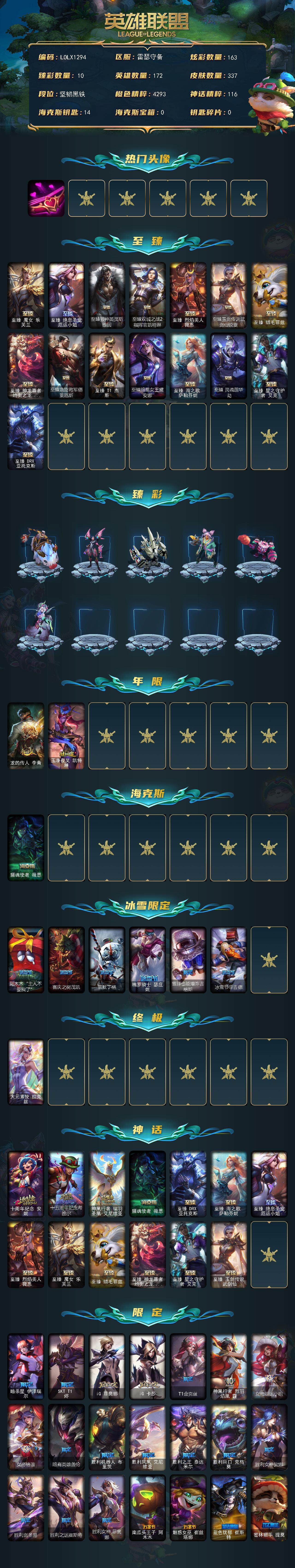 【46792】【LOLX1294】172英雄/337皮肤/1终极/19神话/33限定/10臻彩/163炫彩/50传说/54史诗/未定级/爱情之歌/至臻魔女乐芙兰/至臻绝息圣堂厄运小姐/至臻狼神英灵斯维因/至臻双城之战2指挥官凯特琳/至臻烈焰美人薇恩/至臻玉剑传说武剑仙/至臻绒毛菲兹/至臻神龙尊者均衡之龙沃利贝尔/至臻凯旋将军德莱厄斯/至臻T1杰斯/至臻暗星女王黛安娜/至臻海之歌萨勒芬妮/至臻灵魂