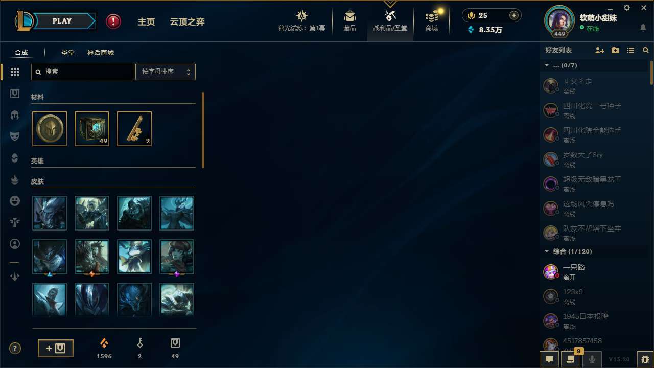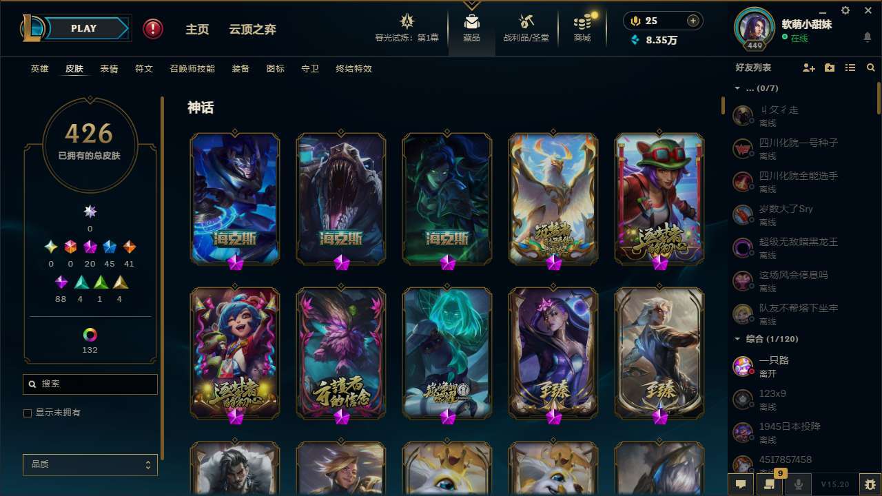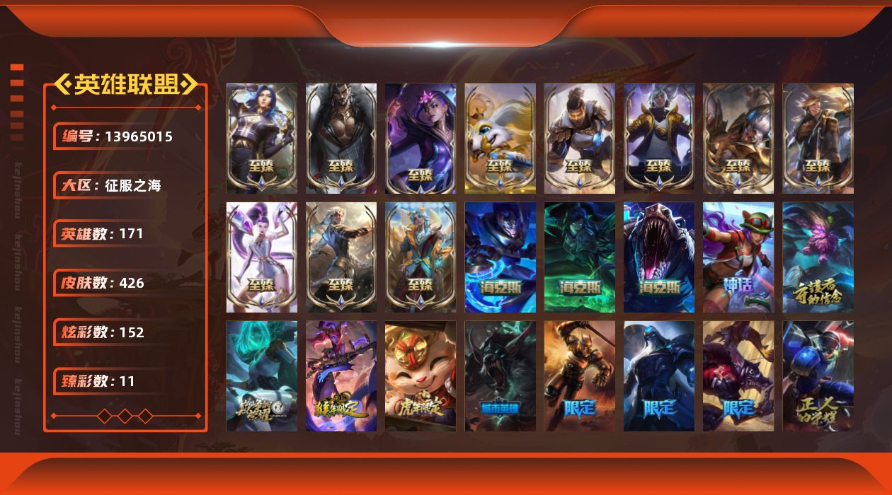 【47522】[13965015]t28707【征服之海】426皮肤 152炫彩 11臻彩 20神话/45限定/41传说/171英雄 账号等级:449 单双排段位:黄金 【重要头像】爱意绵绵 爱情之歌 万圣节卡特琳娜 救生圈 KDA卡莎BAEST KDA卡莎 KDA萨勒芬妮 幼犬内瑟斯 沐浴震惊 不错哦 【重要皮肤】双城之战2指挥官凯特琳至臻 狼神英灵斯维因至臻 暗星女王黛安娜至臻 天龙之子伊泽