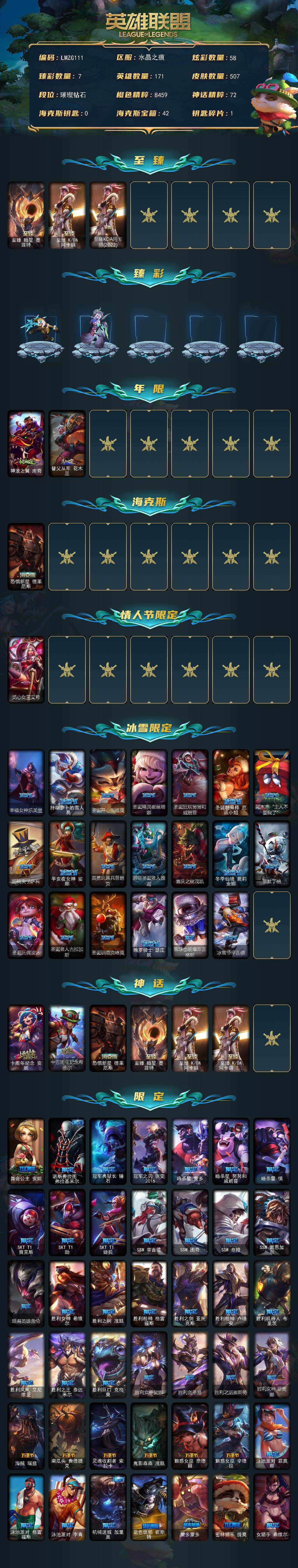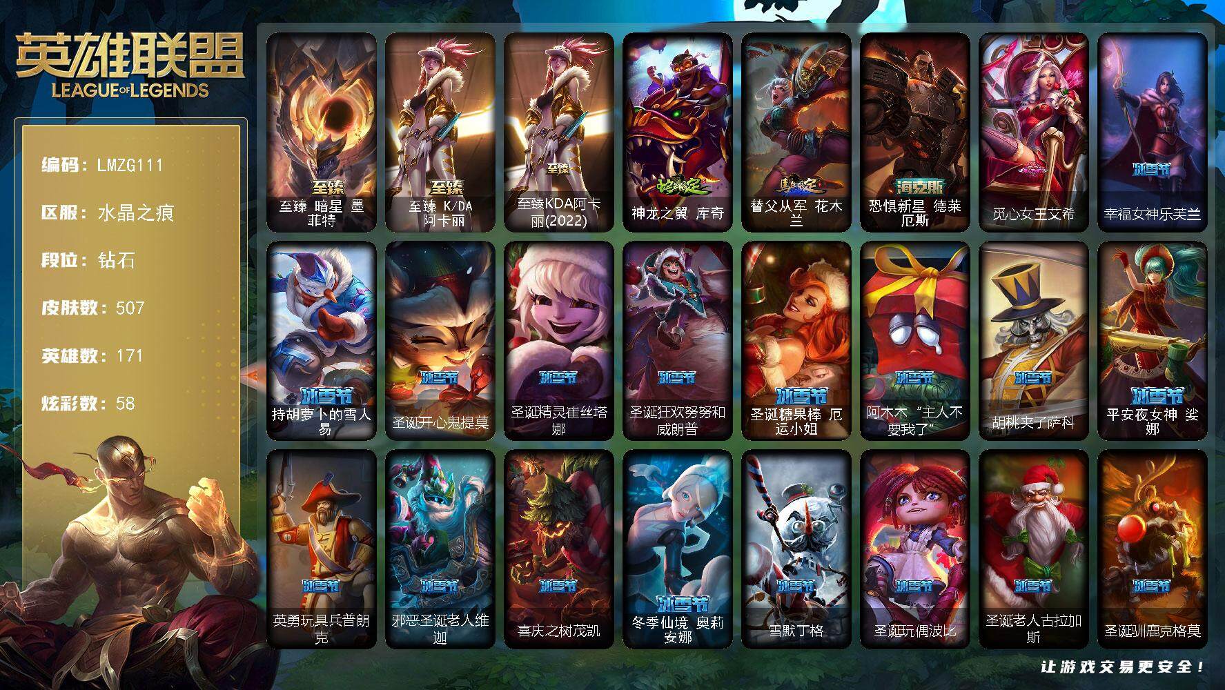【47523】【LMZG111】171英雄/507皮肤/6神话/75限定/7臻彩/58炫彩/46传说/150史诗/钻石/至臻暗星墨菲特/至臻K/DA阿卡丽/至臻KDA阿卡丽(2022)/天龙之子卡莎飞龙乘云/墨之影武者亚索金墨耀影/冰雪风暴希维尔炫金/魔女阿卡丽虚荣/魔女阿狸饕餮/净雪之月莫甘娜冬虹/心之钢伊泽瑞尔天纵才华/神龙之翼库奇/替父从军花木兰/恐惧新星德莱厄斯/觅心女皇艾希/幸福女神乐