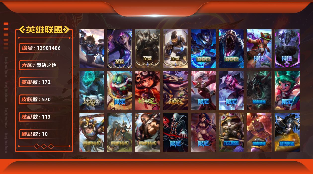 【51529】[13981486]t30844 皇冠账号【裁决之地】原皮龙瞎 570皮肤 113炫彩 10臻彩 10神话/93限定/50传说/172英雄 账号等级:784 单双排段位:黄金【重要头像】星守阿狸 送披萨的小姐姐希维尔 【重要皮肤】暗星女王黛安娜至臻 未来战士卢锡安至臻 腥红之月亚托克斯至臻 灰烬杀手塞拉斯 海克斯科技雷克顿 海克斯科技嘉文四世 胜利剑圣易 胜利女神