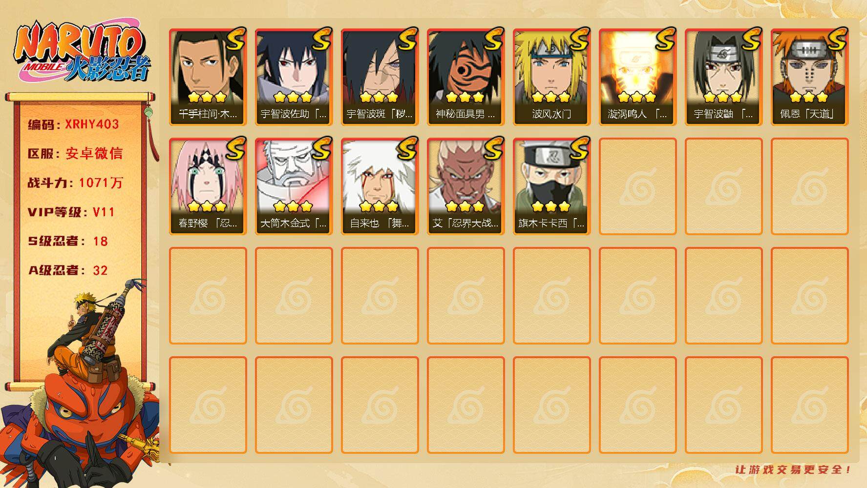 [13989389]Xr37660-安卓微信-【S级忍者】:宇智波斑「秽土转生·解」(3星),春野樱「忍界大战」(3星),艾「忍界大战」(3星),宇智波鼬「须佐能乎」(3星),旗木卡卡西「须佐能乎」(3星),千手柱间「木叶创立」(3星),自来也「舞之豪杰」(3星),波风水门(3星),神秘面具男「红夜之刃」(3星),漩涡鸣人「九喇嘛连结」(3星),...
