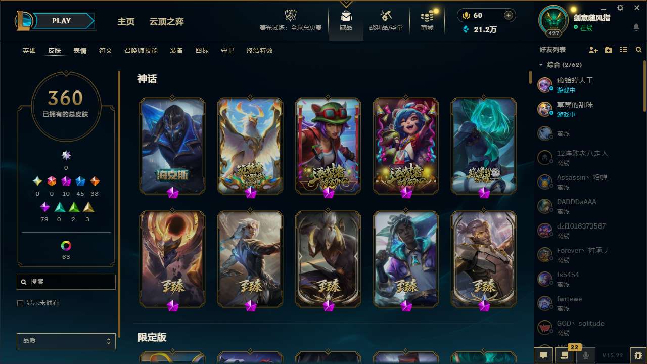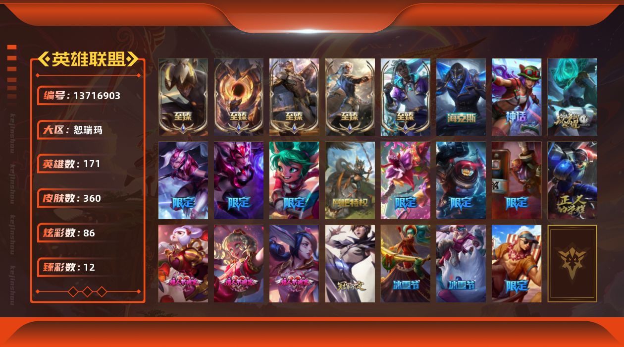 【53307】[13716903]t30316【恕瑞玛】360皮肤 86炫彩 12臻彩 10神话/45限定/38传说/171英雄 账号等级:427 单双排段位:铂金 【重要头像】星守阿狸 云顶古琴娑娜 幼犬内瑟斯 【重要皮肤】星之守护者艾克至臻 源计划逆流塞拉斯至臻 暗星墨菲特至臻 黑夜使者凯隐至臻 黑夜使者李青至臻 胜利剑圣易 胜利女神娑娜 胜利女神希维尔 胜利之王泰达