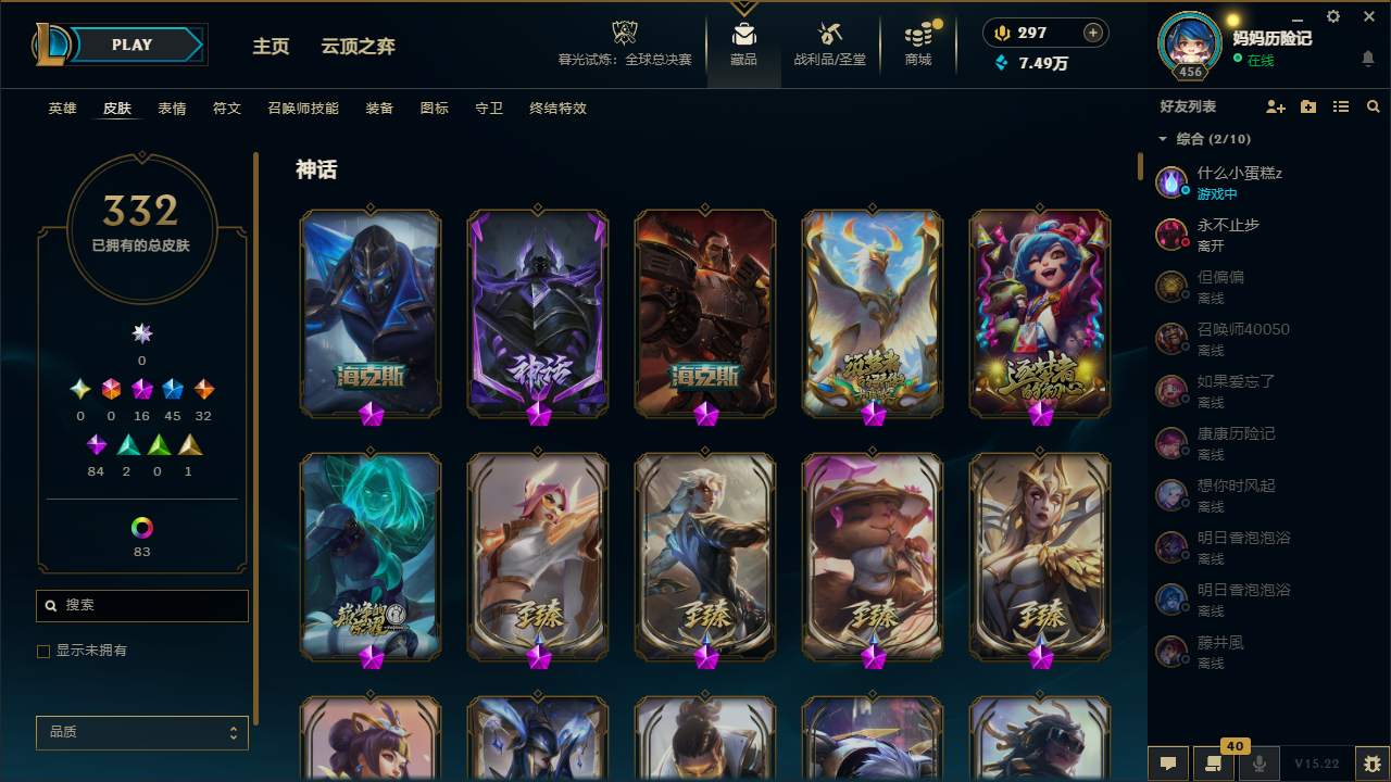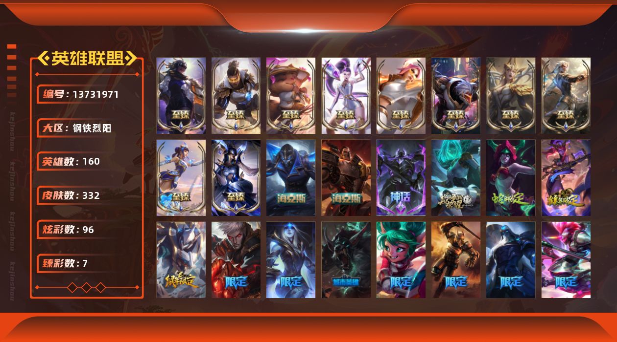 【53341】[13731971]t29995【钢铁烈阳】332皮肤 96炫彩 7臻彩 16神话/45限定/32传说/160英雄 账号等级:456【重要头像】至爱的鹿 觅心之翼奎因 魔女卡蜜尔炫彩 咖啡甜心布偶布罗 可爱安妮 至臻青花瓷丽桑卓 至臻青花瓷拉克丝 至臻魔女乐芙兰 至臻福牛守护者菲奥娜 至臻KDA卡莎 至臻灵魂莲华提莫 【重要皮肤】青花瓷丽桑卓至臻 青花瓷拉