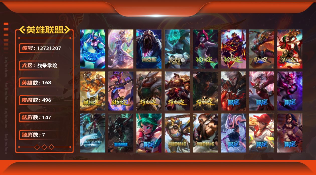 【53351】[13731207]t30352 皇冠号【战争学院】496皮肤 147炫彩 7臻彩 3神话/101限定/49传说/168英雄 账号等级:547【重要头像】云顶古琴娑娜 星守金克丝炫彩 幼犬内瑟斯 可爱悠米 可爱安妮 烈焰美人薇恩 披萨鸡 送披萨的小姐姐希维尔 此志无双羽饰骑士 不错哦 征服者韦鲁斯 【重要皮肤】海克斯科技雷克顿 荣誉使者玛尔扎哈 勇敢的心