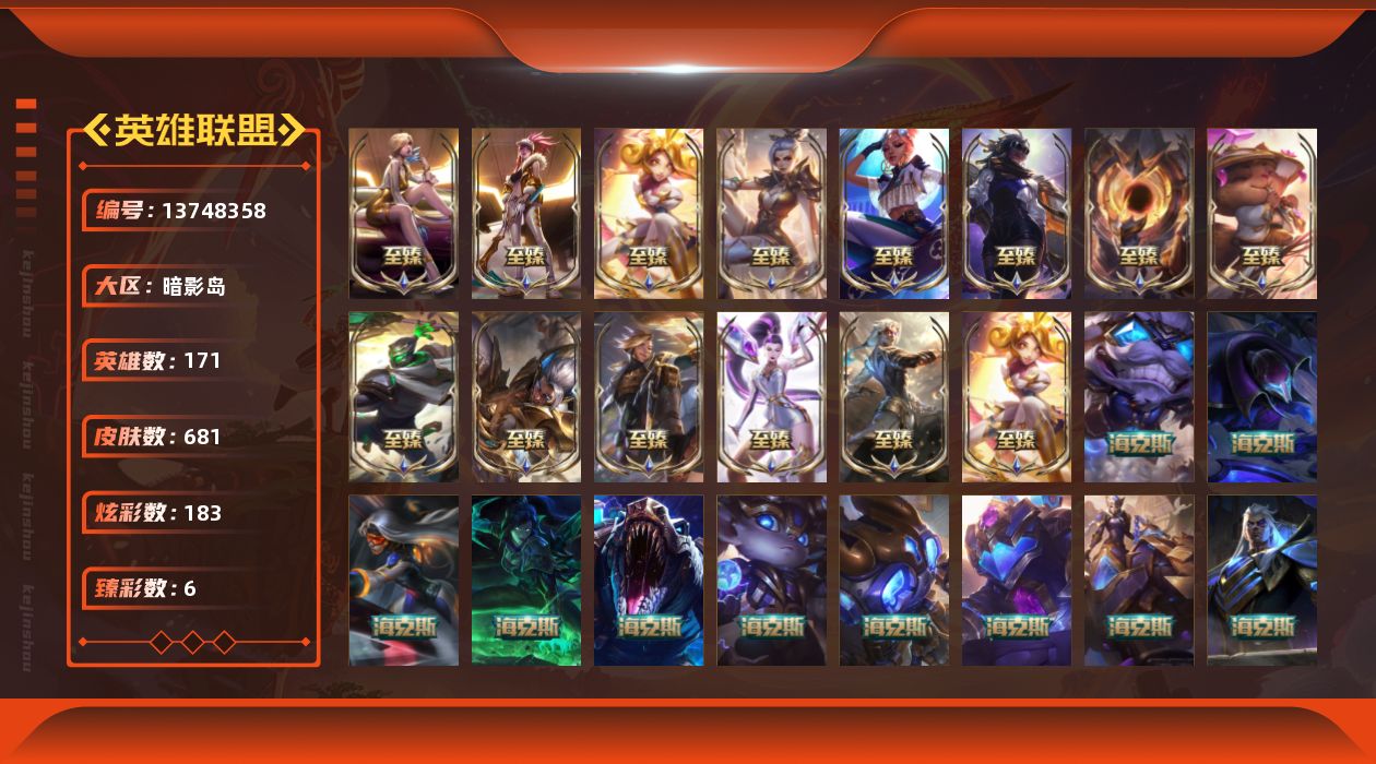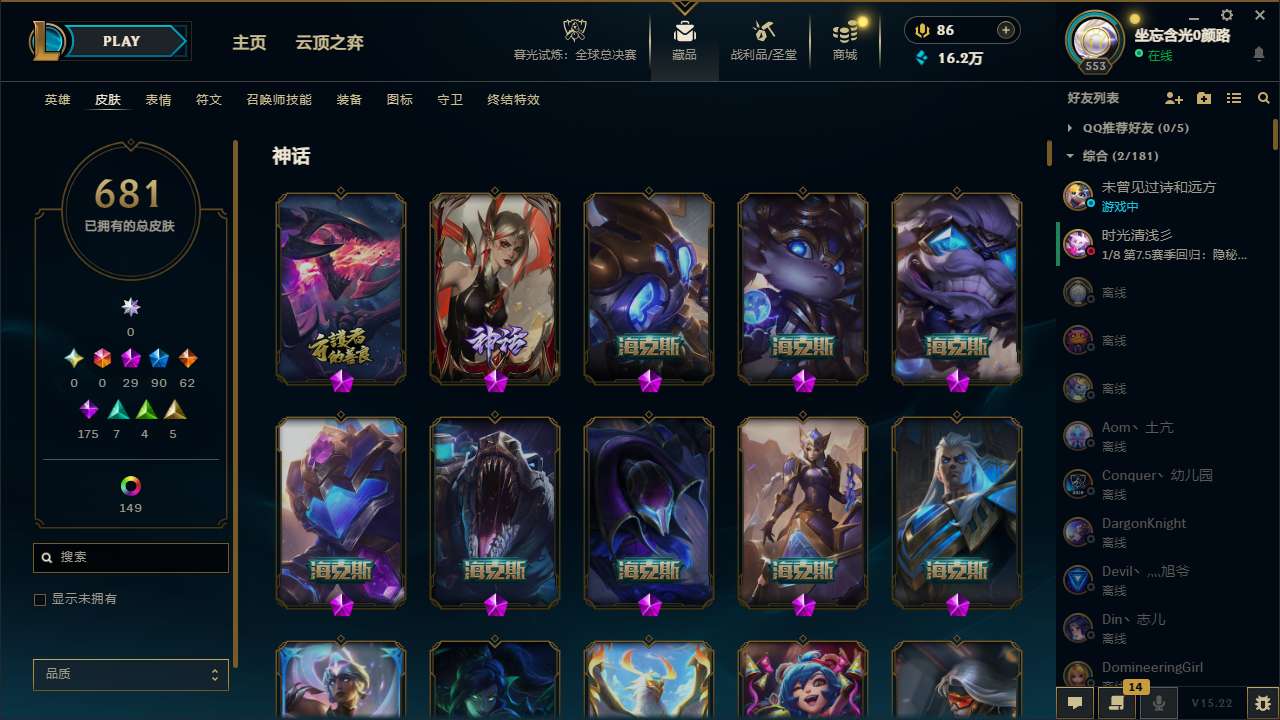 【53352】[13748358]t30380 皇冠账号【暗影岛】681皮肤 183炫彩 6臻彩 29神话/90限定/62传说/171英雄 账号等级:553 单双排段位:青铜【重要头像】爱情之歌 黎明使者卡尔玛 KDA萨勒芬妮 披萨鸡 至臻灵魂莲华提莫 【重要皮肤】真实伤害赛娜至臻 灵魂莲华提莫至臻 灵能特工伊泽瑞尔至臻 暗星墨菲特至臻 神龙尊者炎龙瑟提至臻 黑夜使者凯隐至臻
