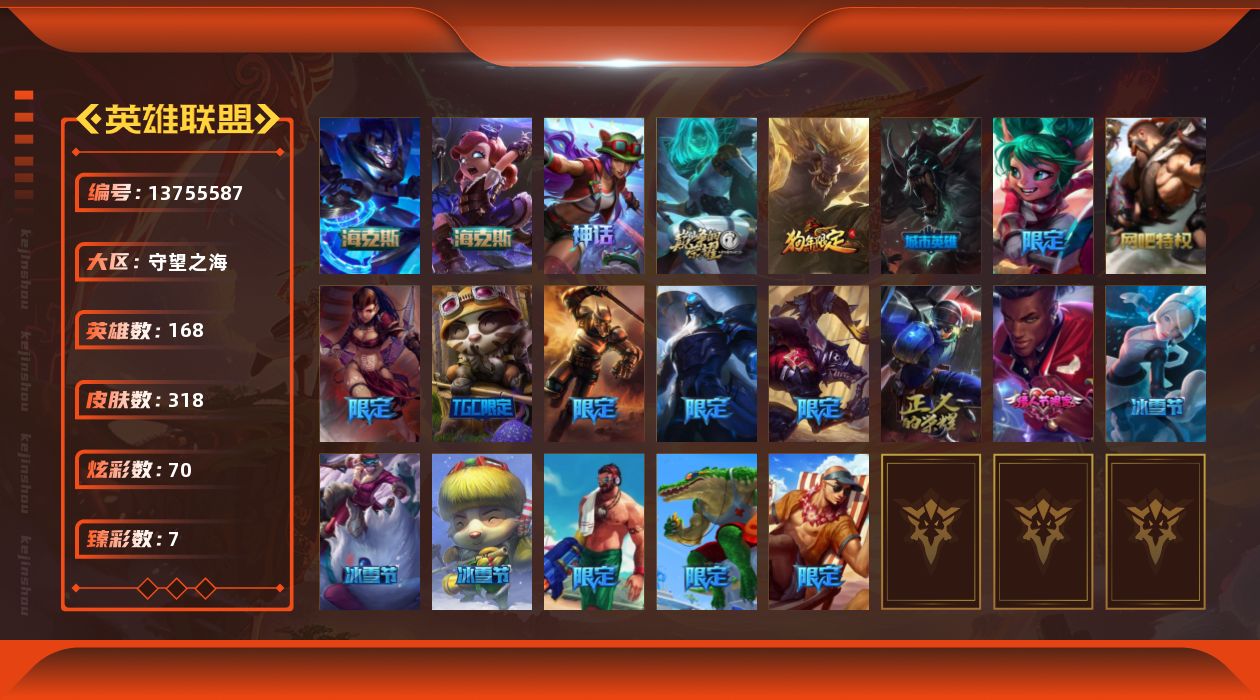 【53385】[13755587]t30412【守望之海】318皮肤 70炫彩 7臻彩 6神话/44限定/23传说/168英雄 账号等级:388 云顶神话:1【重要头像】云顶战斗学院伊泽瑞尔 云顶星守阿卡丽 万圣节卡特琳娜 【重要皮肤】海克斯科技安妮 海克斯科技嘉文四世 胜利剑圣易 胜利之王泰达米尔 创星之灵璐璐 南天之怒沃里克 定海神珍孙悟空 胜利女神奥莉安娜 觅心游侠卢