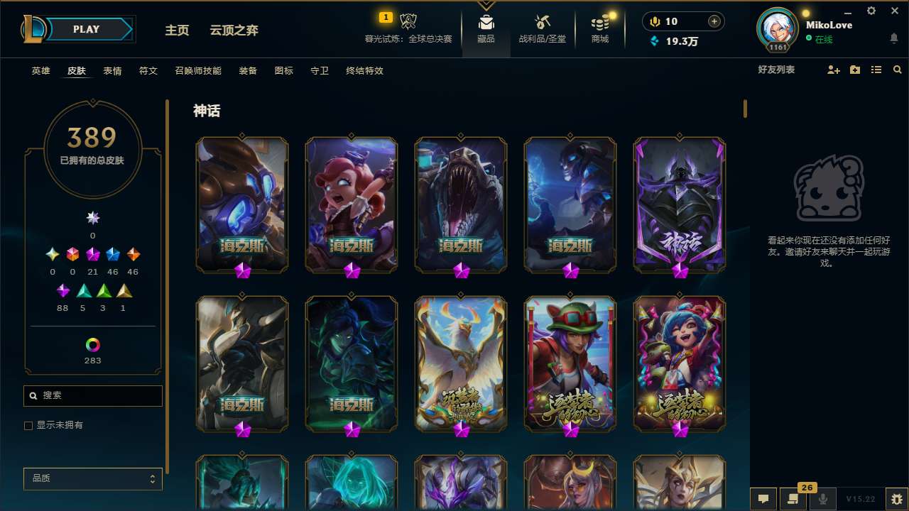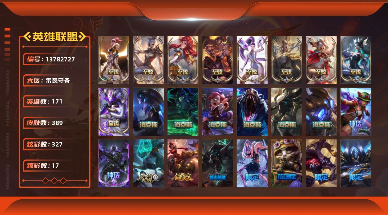 【53405】[13782727]t30480【雷瑟守备】389皮肤 327炫彩 17臻彩 21神话/46限定/46传说/171英雄 账号等级:1161 单双排段位:黄金【重要头像】爱意绵绵 雪花 冬境仙灵索拉卡 冬境仙灵妮蔻 星守金克丝炫彩 战斗学院卡特琳娜 可爱安妮 披萨鸡 战斗学院伊泽瑞尔神话炫彩 至臻神凰行者霞 至臻KDA卡莎 【重要皮肤】斗魂觉醒萨科至臻 星之守