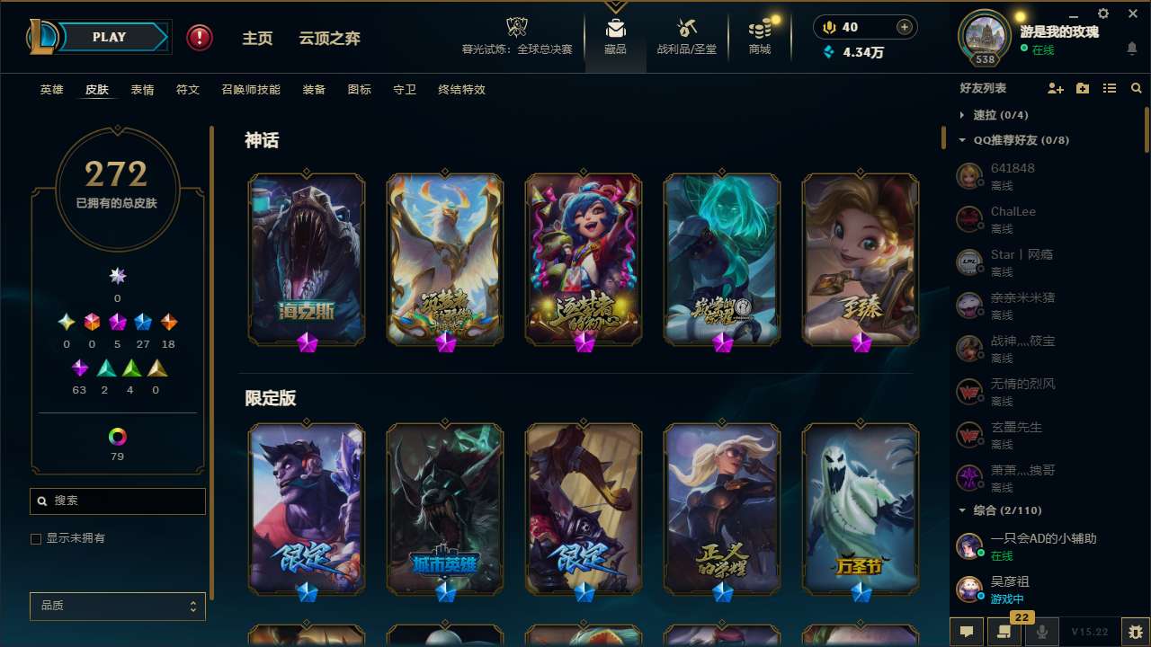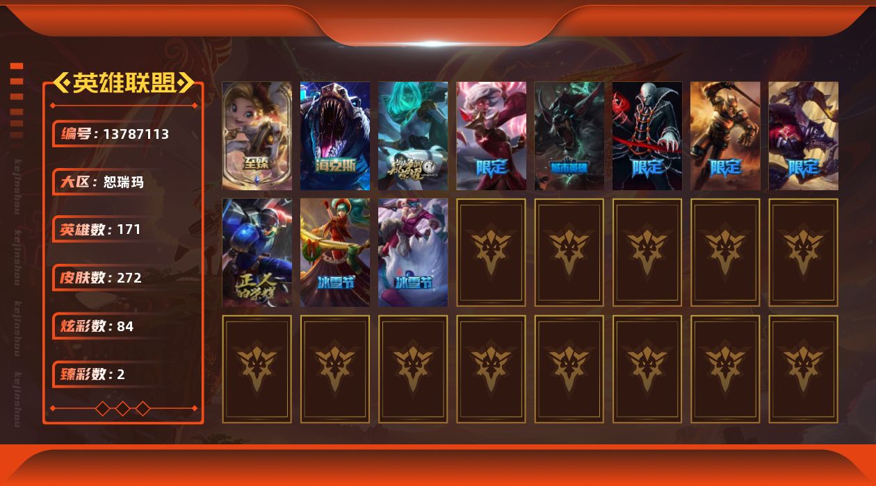 【53418】[13787113]t30466 皇冠账号【恕瑞玛】272皮肤 84炫彩 2臻彩 5神话/27限定/18传说/171英雄 账号等级:538 单双排段位:黄金【重要头像】爱情之歌 可爱安妮 【重要皮肤】奥术师佐伊至臻 海克斯科技雷克顿 胜利剑圣易 胜利之王泰达米尔 胜利巨口克格莫 荣誉使者玛尔扎哈 天龙之子斯莫德 胜利女神瑟庄妮 胜利机器人布里茨 胜利女神奥莉安