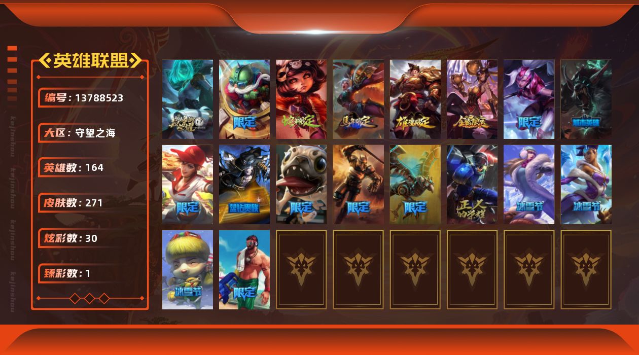 【53428】[13788523]t30464 皇冠账号【守望之海】271皮肤 30炫彩 1臻彩 2神话/40限定/22传说/164英雄 账号等级:297【重要头像】冬境仙灵索拉卡 救生圈 烈焰美人薇恩 披萨鸡 送披萨的小姐姐希维尔 【重要皮肤】电玩勇者锐雯 替父从军花木兰 你看见过我的熊猫吗安妮 张辽文远 烈焰美人薇恩 胜利女神瑟庄妮 胜利机器人布里茨 胜利女神奥莉安娜